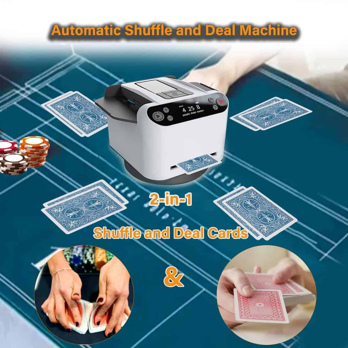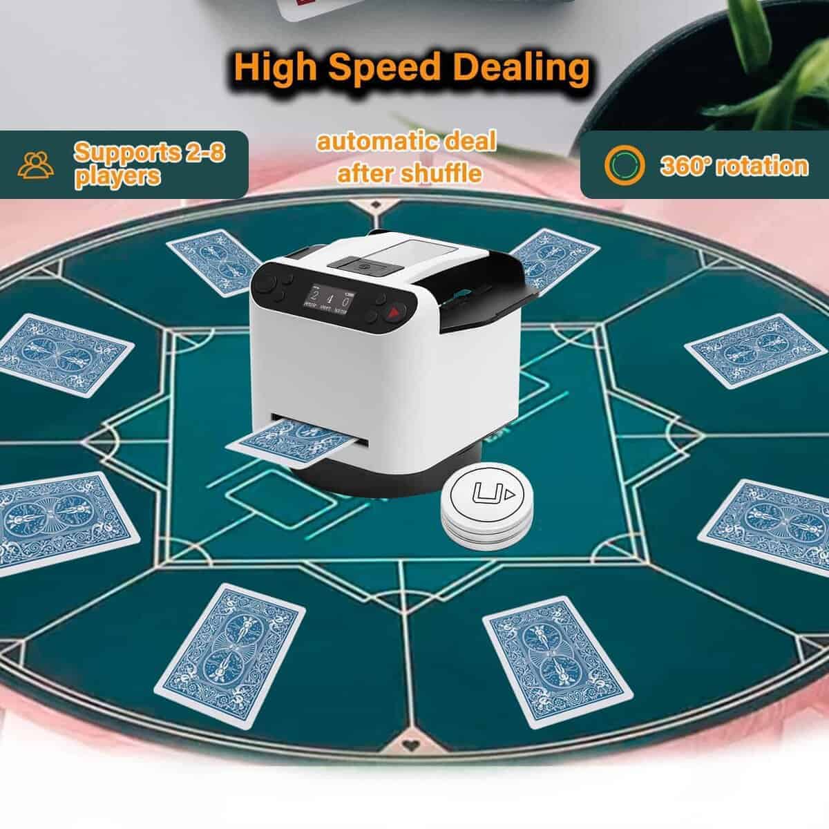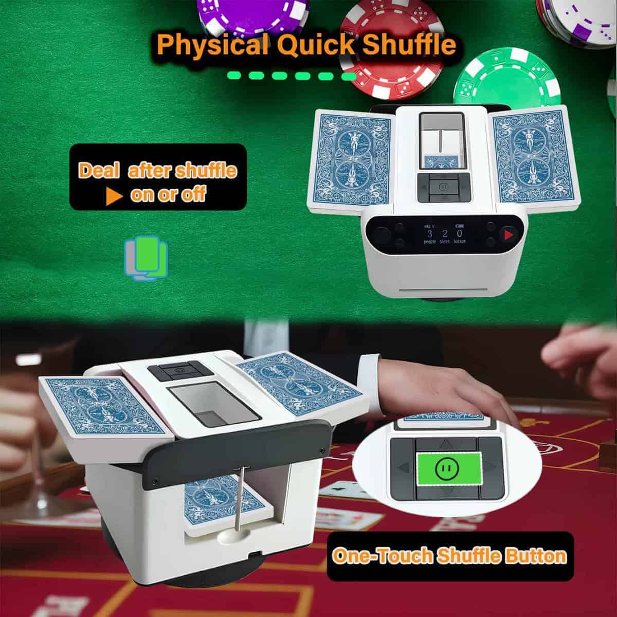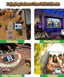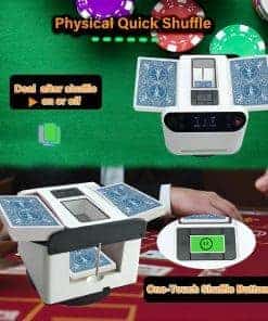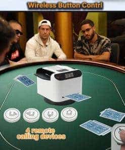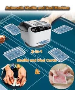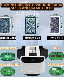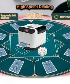 1. Barajador y Repartidor Inteligente: El Barajador de Cartas Yatics ahora cuenta con barajado y reparto de cartas con un solo clic. Simplemente coloca las cartas en la bandeja de barajado, configura el número de jugadores y cartas, presiona el botón de barajado y la máquina barajará y repartirá automáticamente según tus ajustes. También puedes optar por no repartir automáticamente después de barajar. 2. Función de Llamada Inalámbrica: El Barajador de Cartas Yatics viene con 4 dispositivos de llamada. Con un suave toque, la máquina repartirá cartas en la dirección del dispositivo de llamada, distribuyendo una carta por cada presión. Junto con el barajado y reparto con un clic, libera tus manos, mejorando la experiencia del usuario. NOTA: Los dispositivos de llamada deben emparejarse con la máquina antes de usar. 3. Juego de Texas Hold’em: Configura la máquina para no repartir automáticamente después de barajar, especifica el número de jugadores y 2 cartas por persona. Presiona el botón de barajado, utiliza el dispositivo de llamada para repartir una carta descartada, y luego presiona el botón de reparto para distribuir las cartas de cada jugador. Las cartas posteriores pueden ser repartidas utilizando el dispositivo de llamada, realizando así el juego de Texas Hold’em. 4. Configuraciones Multifunción: El Barajador de Cartas Yatics se puede configurar para el número de jugadores (2-8), cartas por jugador, número de cartas comunitarias, reparto en sentido horario o antihorario, reparto único, reparto continuo, contar cartas y más. Satisface la mayoría de los juegos de cartas, utilizando el barajado con un clic para reducir la probabilidad de trampas y aumentar la diversión del juego. 5. Portátil con Carga: El Barajador de Cartas Yatics cuenta con una batería integrada de 5000mAh, carga rápida USB-C, capaz de barajar 8000 cartas con una carga completa. Con un diseño elegante y un peso de solo 1.9 libras, es conveniente para llevarlo contigo.