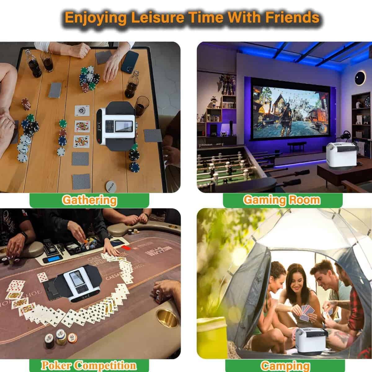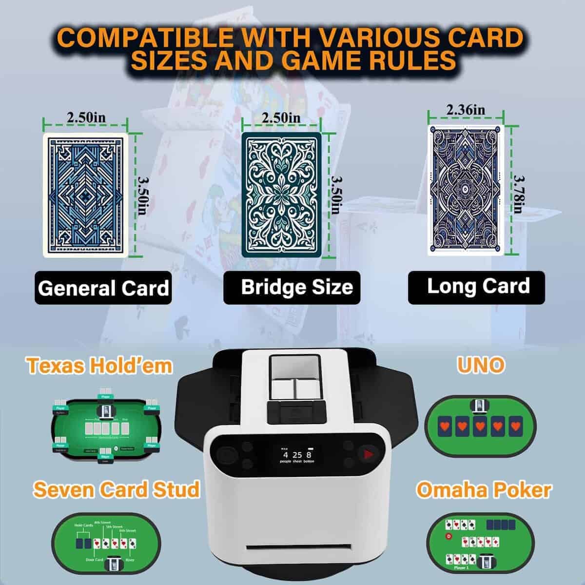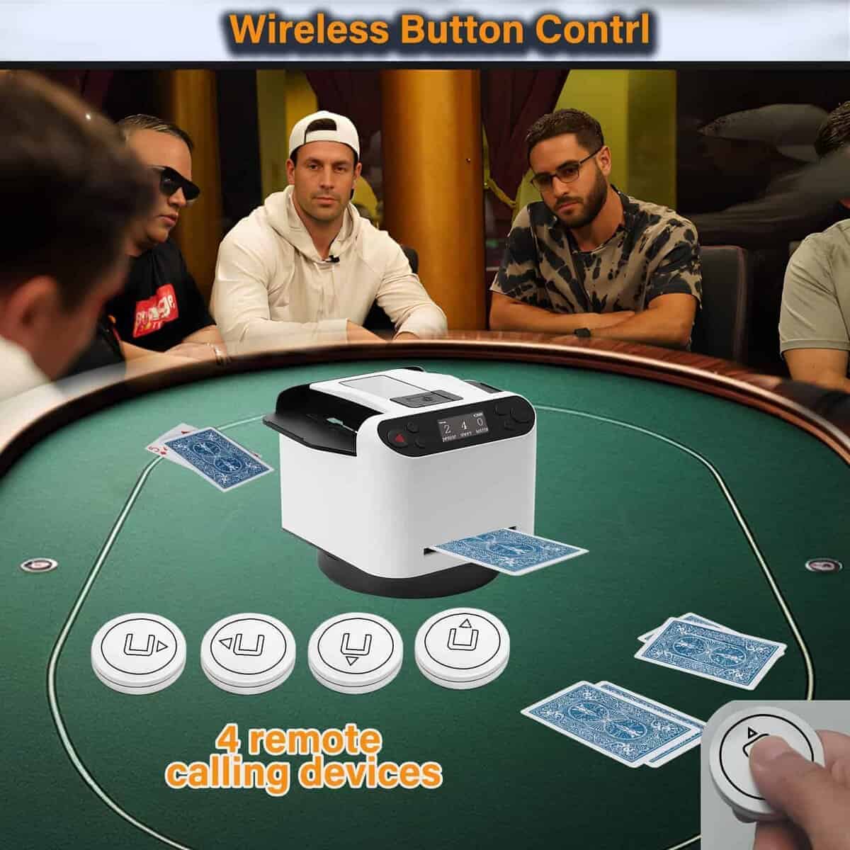 1. Barajador y Repartidor Inteligente: El Barajador de Cartas Yatics ahora cuenta con barajado y reparto de cartas con un solo clic. Simplemente coloca las cartas en la bandeja de barajado, configura el número de jugadores y cartas, presiona el botón de barajado y la máquina barajará y repartirá automáticamente según tus ajustes. También puedes optar por no repartir automáticamente después de barajar. 2. Función de Llamada Inalámbrica: El Barajador de Cartas Yatics viene con 4 dispositivos de llamada. Con un suave toque, la máquina repartirá cartas en la dirección del dispositivo de llamada, distribuyendo una carta por cada presión. Junto con el barajado y reparto con un clic, libera tus manos, mejorando la experiencia del usuario. NOTA: Los dispositivos de llamada deben emparejarse con la máquina antes de usar. 3. Juego de Texas Hold’em: Configura la máquina para no repartir automáticamente después de barajar, especifica el número de jugadores y 2 cartas por persona. Presiona el botón de barajado, utiliza el dispositivo de llamada para repartir una carta descartada, y luego presiona el botón de reparto para distribuir las cartas de cada jugador. Las cartas posteriores pueden ser repartidas utilizando el dispositivo de llamada, realizando así el juego de Texas Hold’em. 4. Configuraciones Multifunción: El Barajador de Cartas Yatics se puede configurar para el número de jugadores (2-8), cartas por jugador, número de cartas comunitarias, reparto en sentido horario o antihorario, reparto único, reparto continuo, contar cartas y más. Satisface la mayoría de los juegos de cartas, utilizando el barajado con un clic para reducir la probabilidad de trampas y aumentar la diversión del juego. 5. Portátil con Carga: El Barajador de Cartas Yatics cuenta con una batería integrada de 5000mAh, carga rápida USB-C, capaz de barajar 8000 cartas con una carga completa. Con un diseño elegante y un peso de solo 1.9 libras, es conveniente para llevarlo contigo.