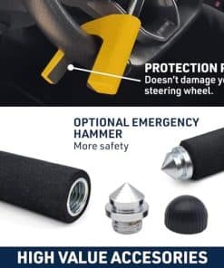 Durabilidad y funciones adicionales. La durabilidad de este antirrobo de volante para auto con alarma está garantizada por su batería CR2 de larga duración y módulo de alarma impermeable reemplazable. Además, incluye un martillo de emergencia opcional con punta atornillable, diseñado para romper cristales en situaciones de escape. Es un dispositivo antirrobo integral, ideal para aquellos que valoran la seguridad y la tranquilidad.