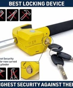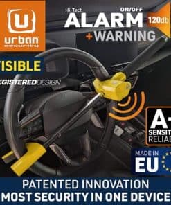 Barra Antirrobo de Volante para Auto URBAN UR978Y con Alarma de 120dB de Alta Tecnología. La barra antirrobo para auto UR978Y se destaca por su seguridad y disuasión activa. Innovación patentada que incluye una alarma integrada de 120dB con activación opcional que alerta incluso contra intentos de robo, con una sensibilidad A+ que detecta los movimientos más sutiles y su sistema de advertencia pre-alarma asegura máxima protección para su auto, caravana, SUV, camioneta o camper. Este innovador dispositivo antirrobo para auto 2 en 1 combina bloqueo físico y alarma en un solo dispositivo. Al cerrar la barra con una de las 3 llaves, el usuario tiene 15 segundos para activar la alarma, si así lo desea, ofreciendo flexibilidad. Equipado con un doble cierre en curva de máxima seguridad resistente a ganzúas, taladros, sierras y palancas, y su color amarillo lo hace fácil de identificar y actuar como un poderoso disuasivo visual.