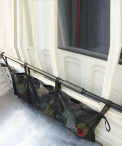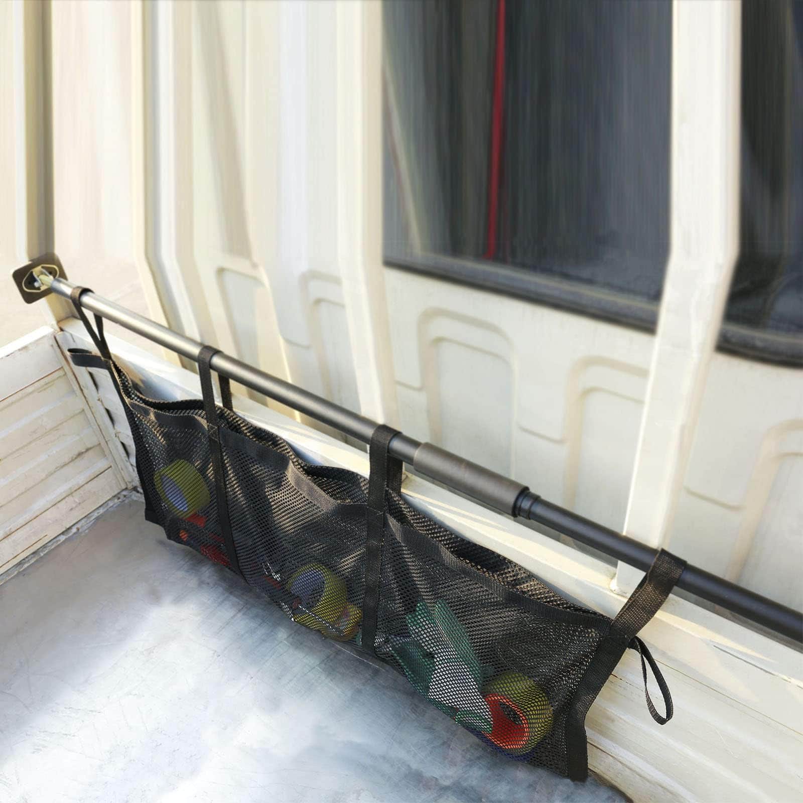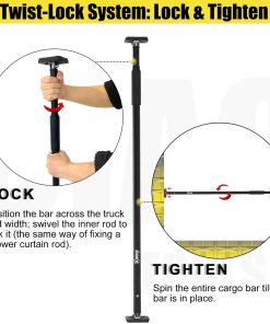 Coloca la red de carga para almacenar la carga; coloca la barra a lo ancho de la cama; el tubo interior tiene una línea blanca que debe estar alineada con los agujeros del tubo exterior al deslizarse hacia arriba y abajo; levanta la manija hasta que la barra esté en su lugar; atornilla la barra separadora.