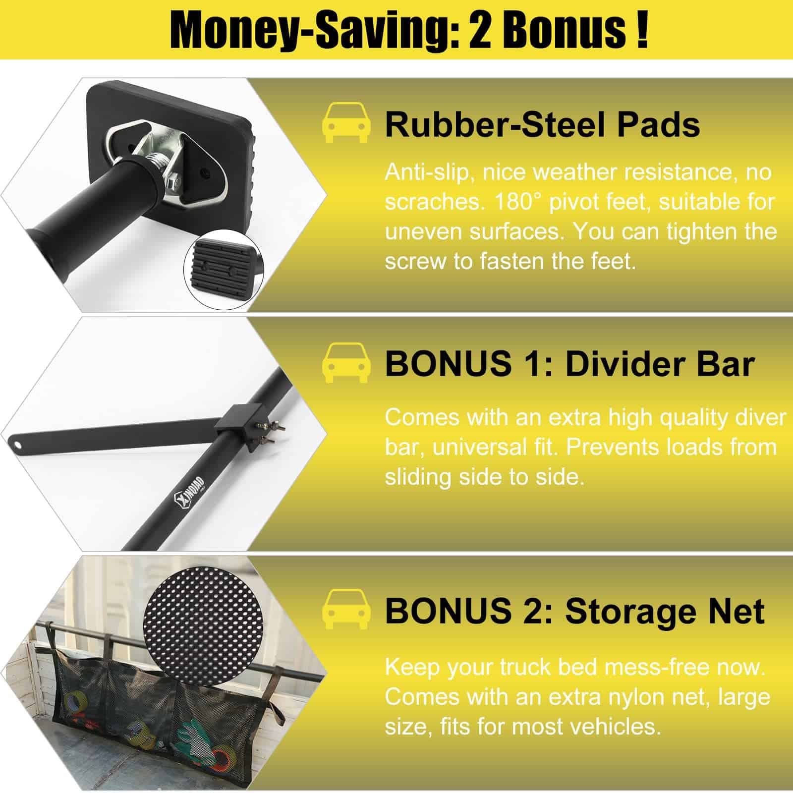 ¿Alguna vez te has sentido molesto por el desplazamiento de la carga, el desorden o incluso los daños durante el transporte? Ahora la Barra de Carga XINQIAO para Camionetas Pickup te ayudará. También está diseñada para soportar un peso de hasta 200 libras de capacidad de carga. Y es increíblemente sencilla y rápida de utilizar si se asegura correctamente. Puedes personalizar fácilmente la longitud que desees bombeando la manija.