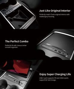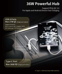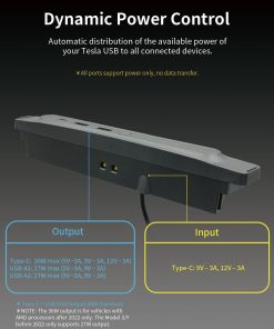 Especificaciones de Entrada: Tipo-C: 9V 3A, 12V 3A Salida: Tipo-C: 36W máximo (5V 3A, 9V 3A, 12V 3A) USB-A1: 27W máximo (5V 3A, 9V 3A) USB-A2: 27W máximo (5V 3A, 9V 3A) Salida total de Tipo-C + USB 36W máximo NOTA: La salida de 36W es solo para vehículos con procesadores AMD después de 2022. El Modelo 3/Y antes de 2022 solo admite una salida de 27W.