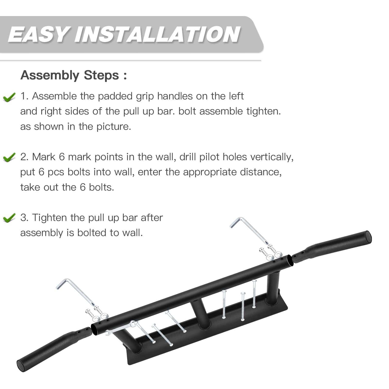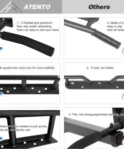 ATENTO barra de dominadas para puerta y montada en la pared ofrece una amplia variedad de opciones de agarre para satisfacer todas tus necesidades de entrenamiento. Con 7 posiciones de agarre diferentes, puedes trabajar diversos grupos musculares y mejorar tu fuerza y resistencia de manera efectiva. La barra de dominadas está hecha de acero de calibre pesado que garantiza durabilidad y resistencia. El recubrimiento negro protege la barra de la oxidación y la corrosión, lo que la hace ideal para un uso prolongado en interiores. Con una capacidad de peso máxima de 400 lbs, esta barra de chin up es capaz de soportar el entrenamiento más intenso sin comprometer tu seguridad. Los agujeros de montaje de diseño único garantizan una instalación segura y estable en las paredes o vigas, lo que te permite disfrutar de tus entrenamientos sin preocupaciones. Ya sea que estés trabajando tu espalda, hombros, pecho, brazos, tríceps, bíceps, lats o abdominales, esta barra de dominadas te proporciona la versatilidad necesaria para un entrenamiento completo y efectivo. Además, puedes personalizar tu rutina de ejercicios añadiendo bandas de resistencia, correas o cuerdas a la barra de dominadas para crear un gimnasio casero a tu medida. La instalación de la barra de dominadas ATENTO es rápida y sencilla, gracias a las instrucciones detalladas y al hardware de montaje incluido en el paquete. En resumen, esta barra de chin up es la solución perfecta para aquellos que desean entrenar en casa de forma efectiva y segura, sin comprometer la calidad de su equipamiento de fitness.