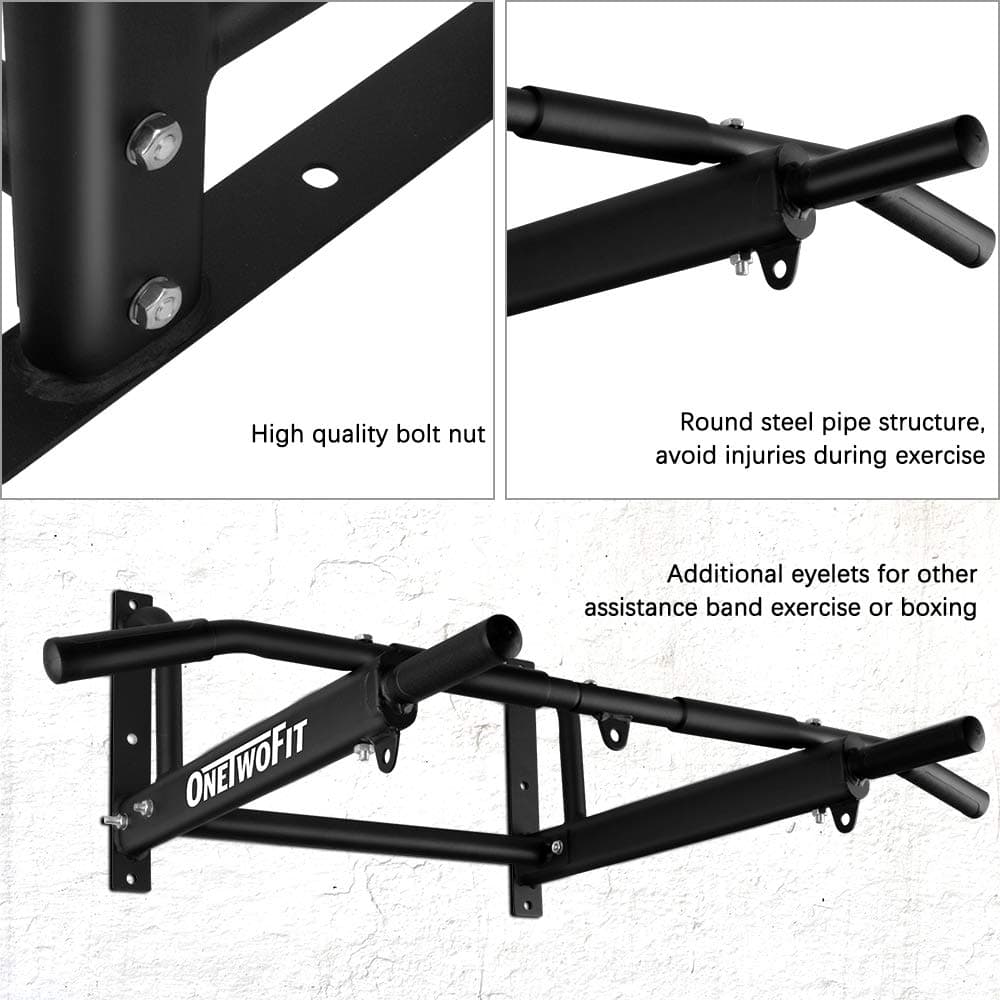 2. ESTABLE: El diseño de 6 hoyos de la Barra de Dominadas OneTwoFit montada en la Pared es más estable y segura que el diseño de 4 hoyos del producto regular. El peso máximo es de 440 Lbs / 200 kg.