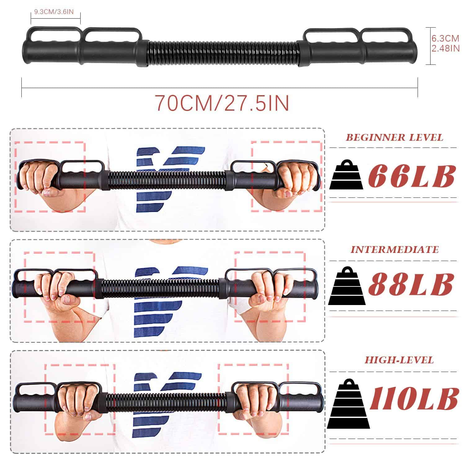 Una barra twister viene con tres modos de peso, cambia la posición de agarre para cambiar el peso.
