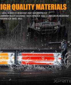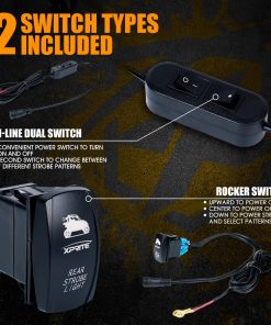 Características: Bloques 1 y 7 Luces de Marcha y Freno, Bloques 2 y 6 son Luces Estroboscópicas, Bloques 3, 4 y 5 son Luces Sólidas o Reversas. Funciones de Luces Rojas y Ámbar. Las Luces Estroboscópicas Ámbar tienen 9 Patrones Diferentes incluyendo Luz Sólida. Control Independiente de la Luz de Freno, Luz Reversa y Patrones Estroboscópicos. Más Brillante y efectivo que las luces estroboscópicas LED estándar. 2 tipos de interruptores incluidos. Los patrones estroboscópicos ámbar incluyen Luz Sólida, Alternante Rápido y Lento, etc. Universal para todos los vehículos con una fuente de energía de 12V. Especificaciones: Dimensiones de la Barra de Luz: 30″ x 2.4″. Longitud de Cable: 116″ (De la barra de luz al extremo del cable). Número de Bloques LED: 7. Tipo de LED: COB. Nota: Las funciones de Luz de Freno y Señal de Giro pueden requerir relés para funcionar correctamente (No incluidos debido a la adaptabilidad universal). Se recomienda la instalación profesional. Los modelos de 4 puertas pueden requerir un cable de extensión. Paquete incluye: 1 x Barra de Luz Estroboscópica, 1 x Arnes Cableado, 2 x Tipos de interruptores, Instrucciones. (Nota: Para modelos de 4 puertas puede requerir una extensión: 52023-EXT-10FT ASIN: B01HYIO0IS se vende por separado).