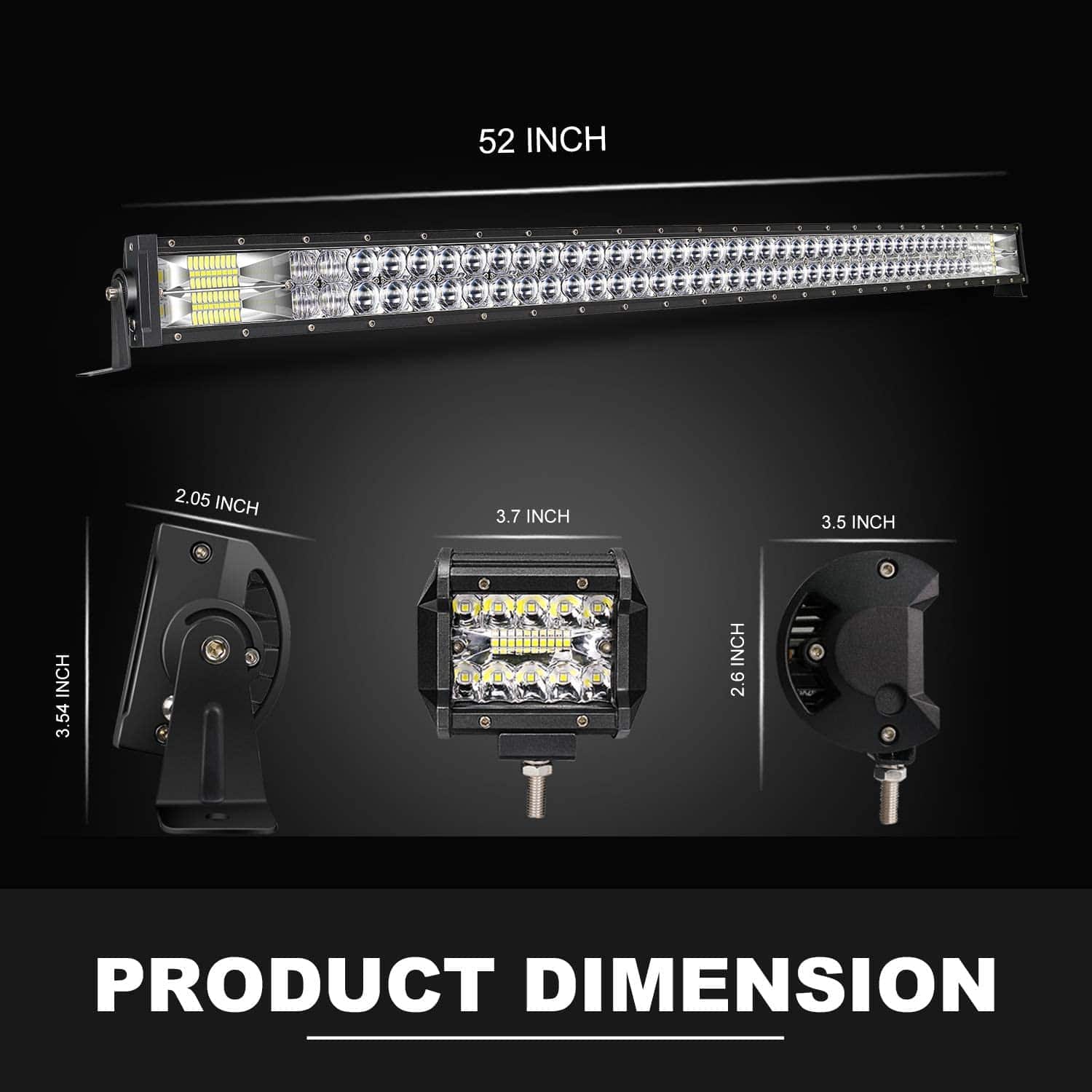 5. Incluido en el paquete: 1x Barra de luz LED curvada de 52 pulgadas 300W 5D + 1x Barra de luz LED de 20 pulgadas 126W 5D + 4x Cubos de luz LED de 4 pulgadas 60W + 2x Arnés de cableado de interruptor + Tornillos necesarios y soportes de montaje. Ofrecemos una garantía de 1 año para asegurarnos de obtener luces sin riesgos y servicios posventa al 100% de satisfacción.