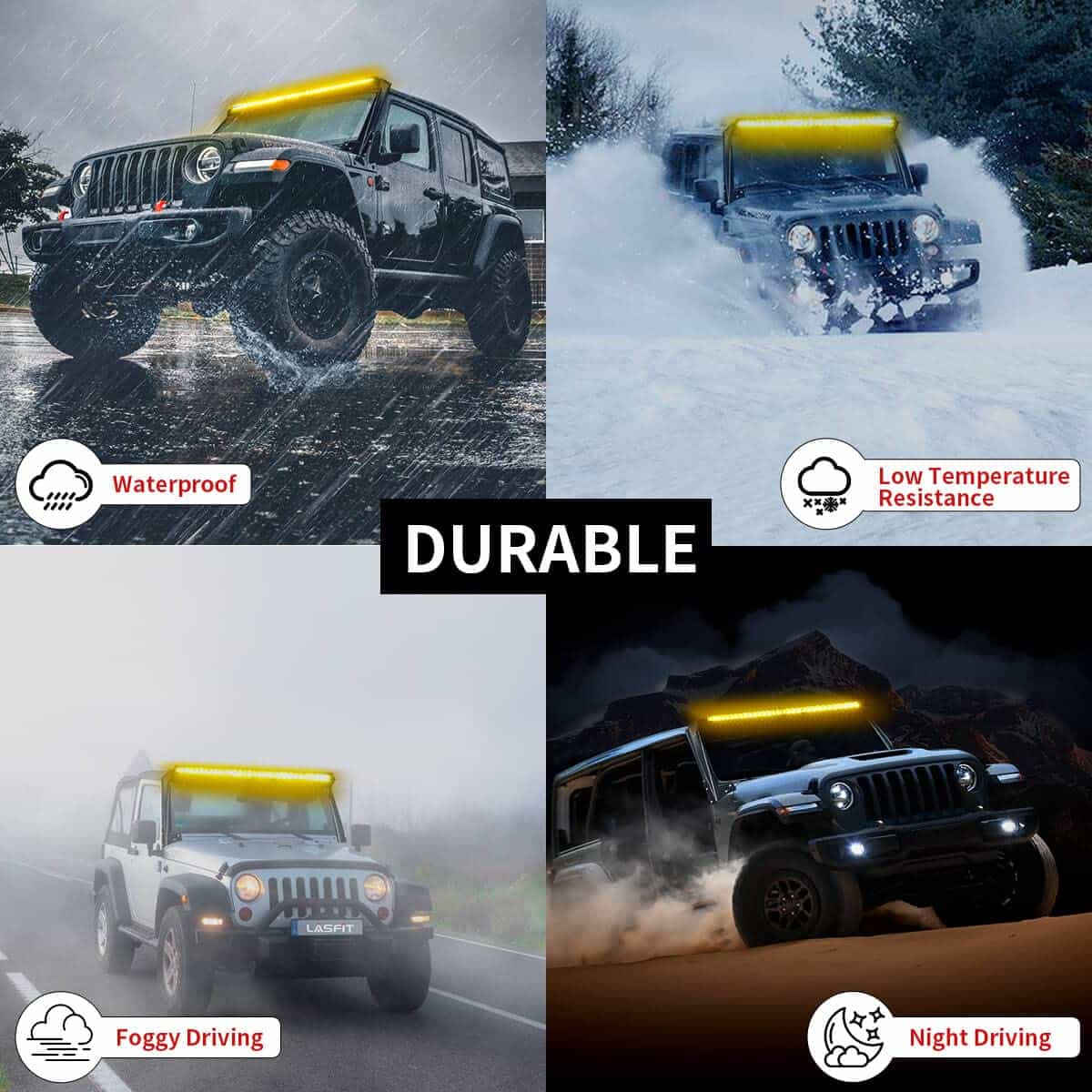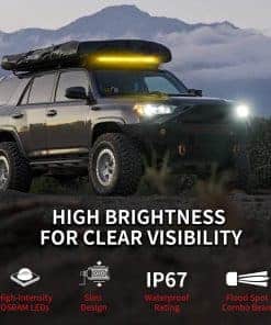 La barra de luz Lasfit es ideal para brindar una luz más brillante, amplia y lejana, sin zonas oscuras ni anillos de colores. La combinación de haz de punto y de inundación la hace perfecta para días neblinosos o lluviosos. Cuenta con una carcasa de aleación de aluminio de alta calidad que proporciona una refrigeración superior para una duración de hasta 50000 horas. Además, su tecnología resistente al agua cumple con el estándar IP67, lo que te permite viajar con seguridad en condiciones climáticas severas como lluvia, niebla y mal tiempo.