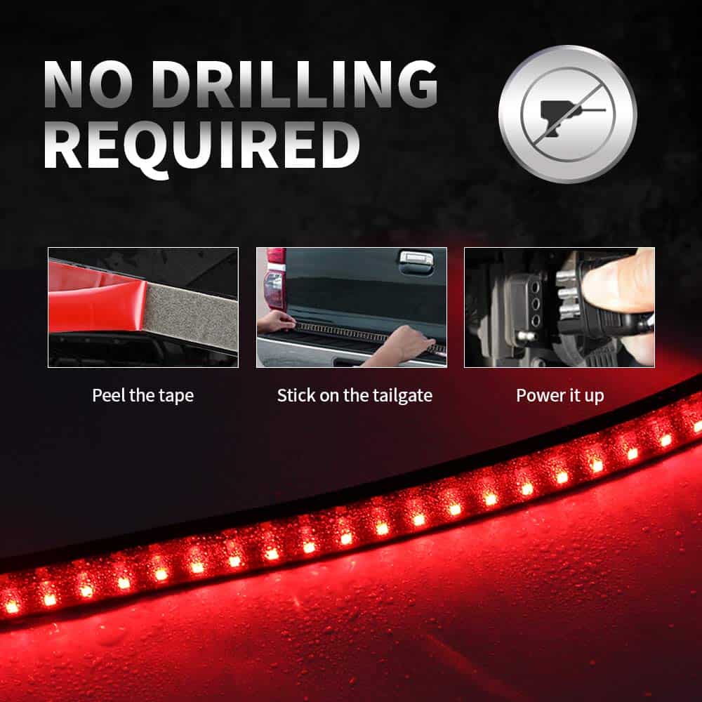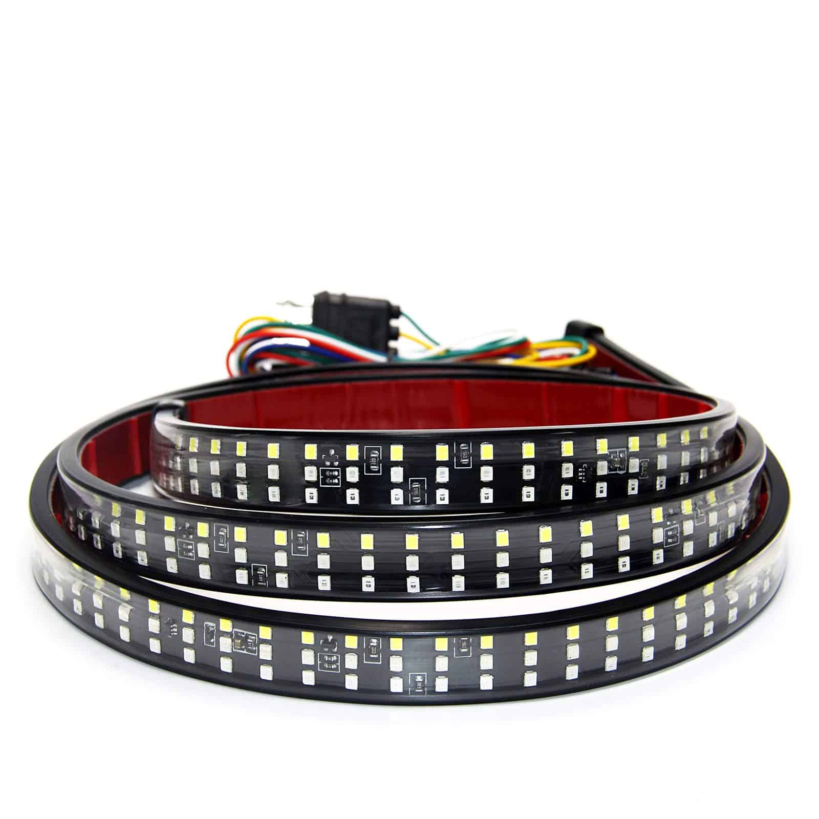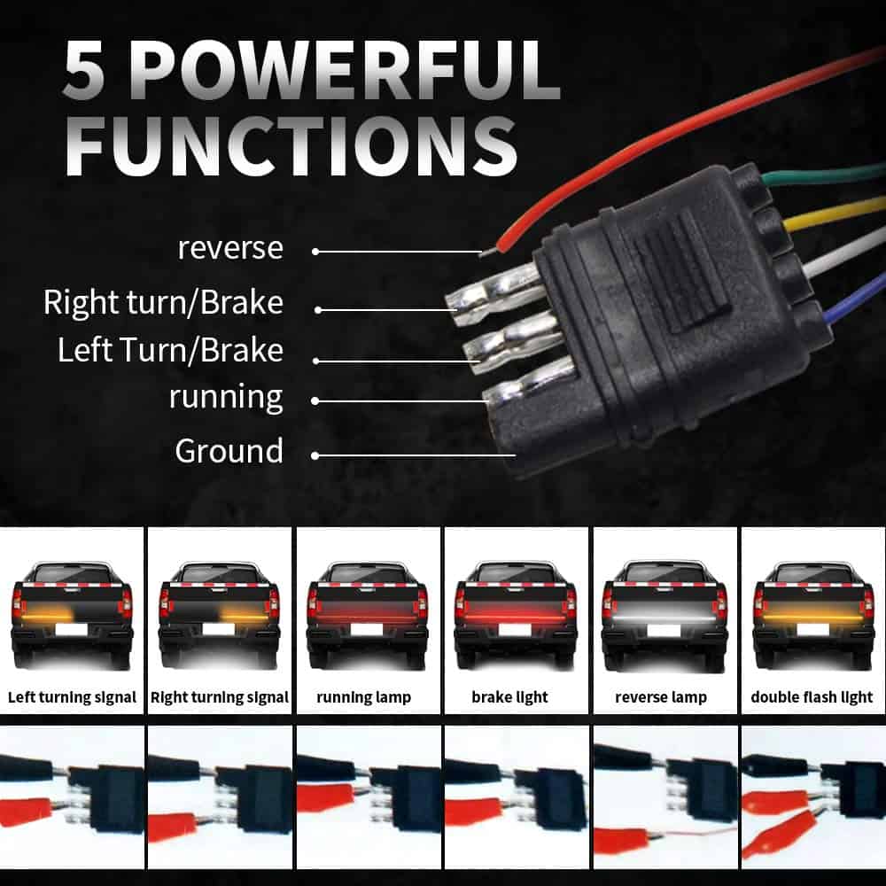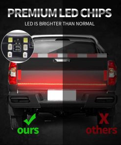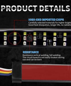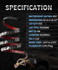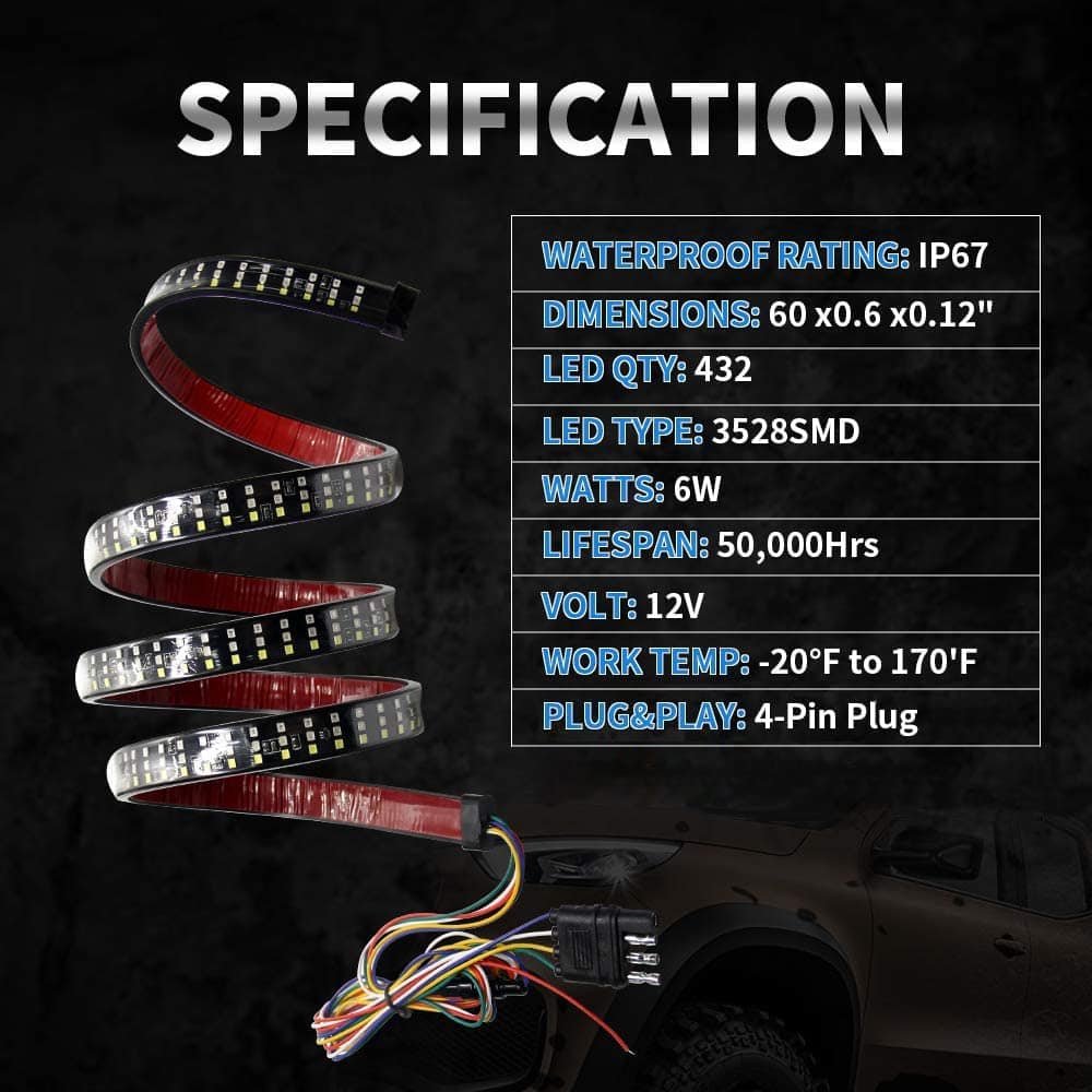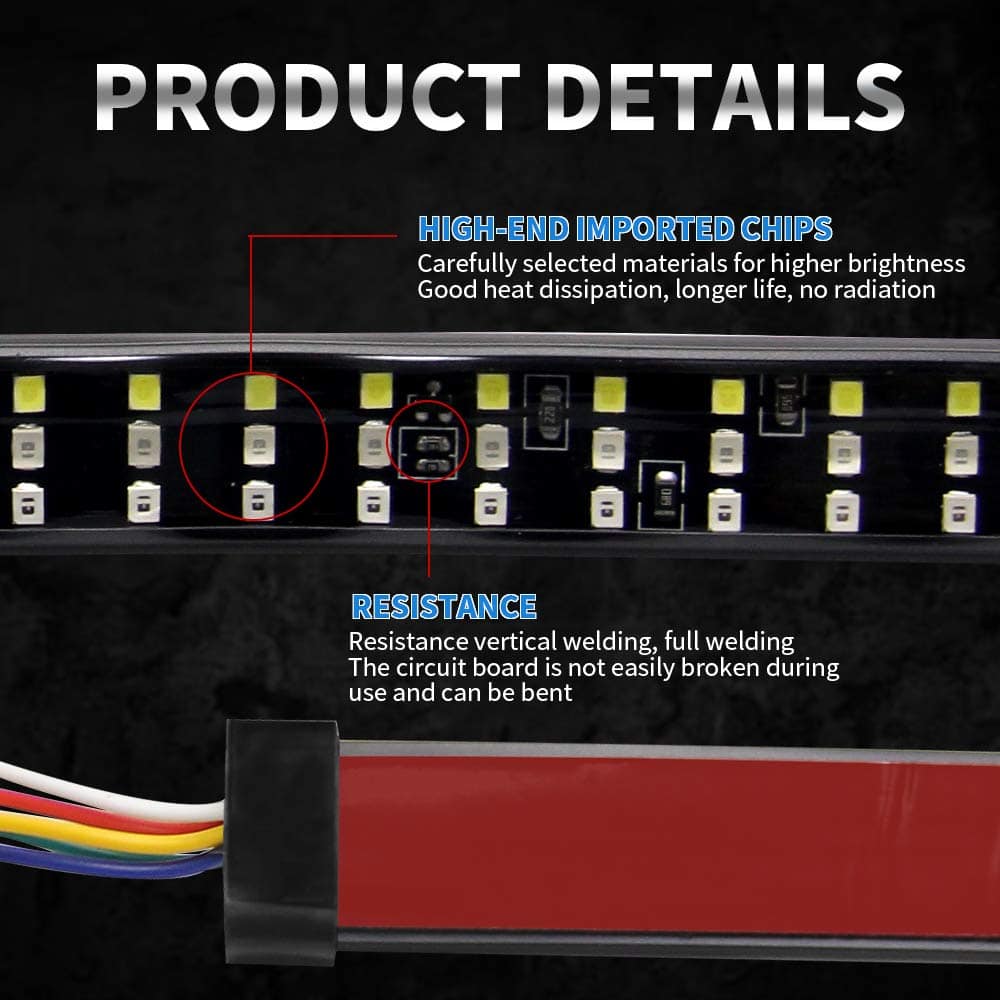 Barra de luz LED para la parte trasera de 60 pulgadas OPL5, luces de la parte trasera del camión de tres filas con conector plano de 4 vías Luces de giro ámbar Luces de freno rojas Luces de marcha blancas Luces de reversa Luces estroboscópicas para camiones de remolque de recolección (60″ 3 filas). La barra de luz de la parte trasera de LED cuenta con 5 funciones completas de luz de freno, señal de giro, marcha, reversa y luz estroboscópica. La barra de luz de tres filas emite el modo de luz baja de color rojo para las luces de marcha, ámbar para las luces de señal de giro izquierda/derecha, rojo brillante para el freno, blanco para la marcha atrás, y ámbar intermitente para la luz estroboscópica de emergencia. La barra de luz para la parte trasera de tres filas de 60 pulgadas con 432 LED 2835SMD es un 300% más brillante que otras tiras de luz de una sola fila, recordando eficazmente a los vehículos detrás de usted y mejorando las señales de fábrica de su camión de tamaño completo. El diseño ultra brillante mejora drásticamente la seguridad del conductor en la carretera. La barra de luz de la parte trasera viene con un cable conector plano de 4 vías, un enchufe plano de 4 pines bien conductor y cinta adhesiva autoadhesiva, que se puede pegar fácilmente en cualquier superficie lisa, sin necesidad de perforar para la instalación. El adhesivo resistente aumenta más de 5 veces la fuerza de sujeción, sin preocupaciones de que se caiga. La tasa de impermeabilidad IP67 adopta un envolvente de silicona completamente sellado, que funciona bien ya sea en días lluviosos o nevados. Esta tira de luz flexible tiene 60 pulgadas de longitud y es perfecta para la mayoría de camionetas, remolques, autos, SUV, RV, VAN, etc. Funciona con un voltaje amplio de CC 12V. Compre con confianza, ofrecemos una garantía de un año y servicio de respuesta las 24 horas. Damos gran importancia al servicio antes y después de la venta, si tiene alguna pregunta, no dude en contactarnos. Le responderemos dentro de las 24 horas, sin importar los fines de semana o días festivos.