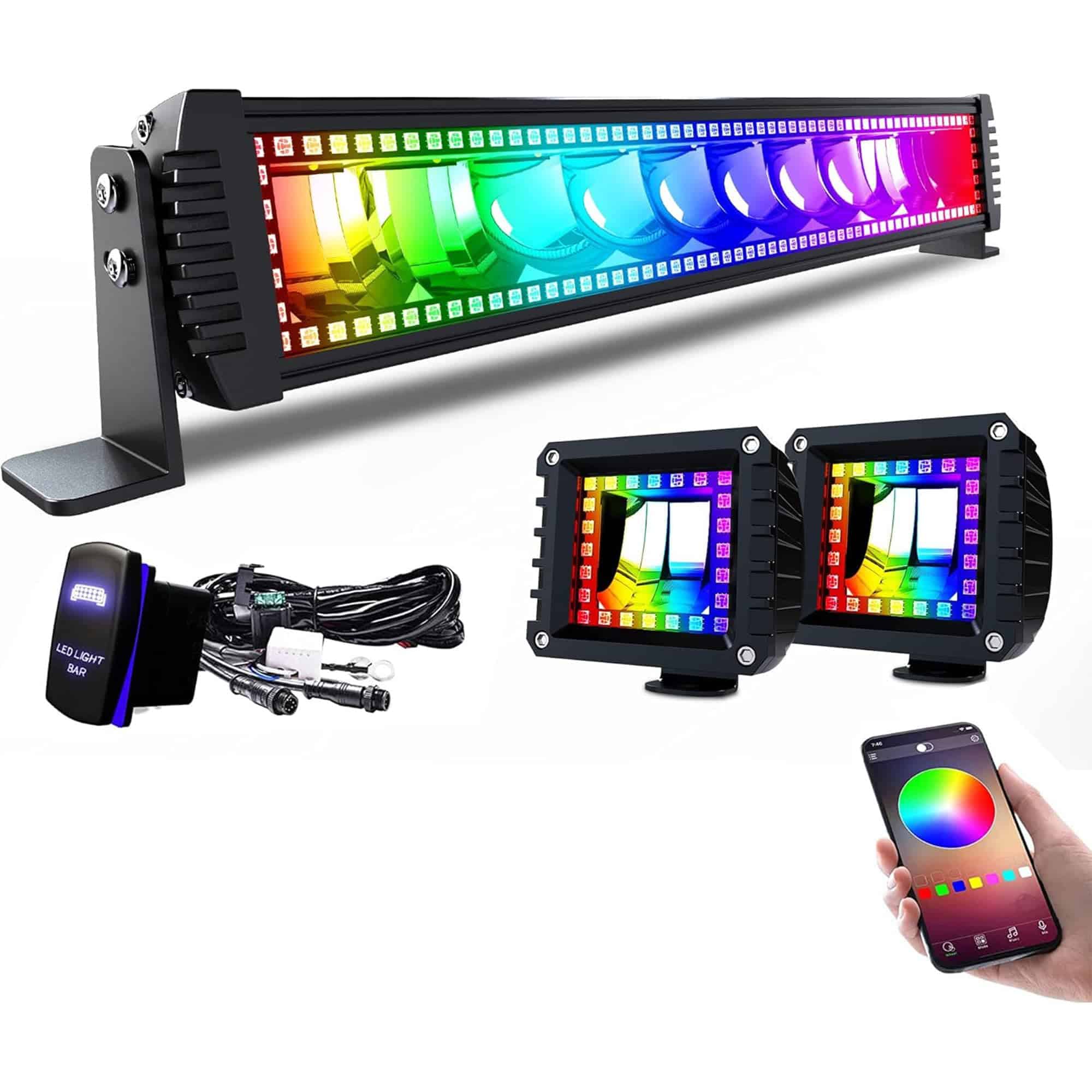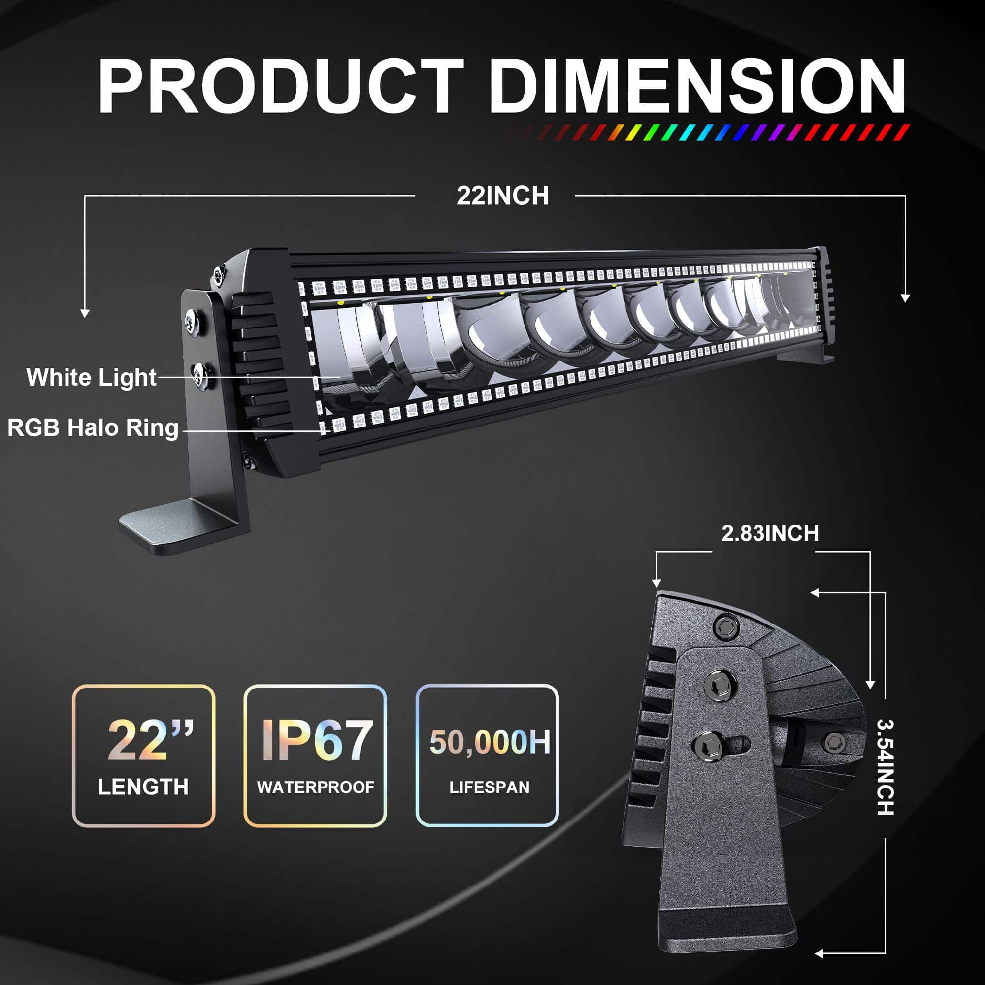 Antes de usar el control remoto para controlar la luz, debes presionar y mantener presionado el botón ON del control remoto hasta que se encienda la alimentación. Todos nuestros productos LED con RGB pueden sincronizarse automáticamente una vez que los conectes al mismo tiempo. LEDs premium de alta calidad con reflectores profundos, emiten una distancia de iluminación más brillante y lejana, iluminando claramente tu camino fuera de la carretera. Nivel de protección IP67 con excelente resistencia al agua, al polvo y a los golpes. Barra de luces LED RGB con soporte de montaje ajustable que se puede ajustar a aproximadamente 45 grados. La carcasa de aluminio moldeado, el soporte de acero inoxidable pueden soportar duras condiciones exteriores. Apto para iluminación fuera de carretera de 10-30v (12V, 24V), camionetas 4×4, todoterreno, camiones, SUV, ATV, UTV, barcos, luces de trabajo, luces de cúpula para vehículos, luces de carrera nocturnas, luces de emergencia, luces auxiliares, luces de barra, focos de estudio, luces de jardín, luces decorativas de yate, etc. Incluye: 1 barra de luz LED RGB de 22 pulgadas 120W + 2 focos de luz LED RGB de 4 pulgadas 18W con sorprendente tira Halo RGB intermitente. Interruptor basculante, arnés de cableado de control y soportes de montaje necesarios incluidos. Ofrecemos una garantía sin preocupaciones de un año y servicio gratuito de por vida. Compra con confianza, si tienes alguna pregunta, no dudes en contactarnos directamente.