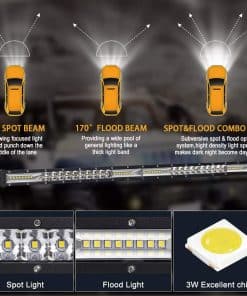 La barra de luz LED ultra delgada de 21 pulgadas está hecha de aleación de aluminio de alta calidad, anticorrosión, resistente y duradera. Consta de 52 LEDs, emite 126W de luz blanca pura de 6000K, ofrece una vista más brillante, más amplia y más larga, perfecta para la conducción a alta velocidad o cualquier otra situación donde necesites una distancia extrema de iluminación.