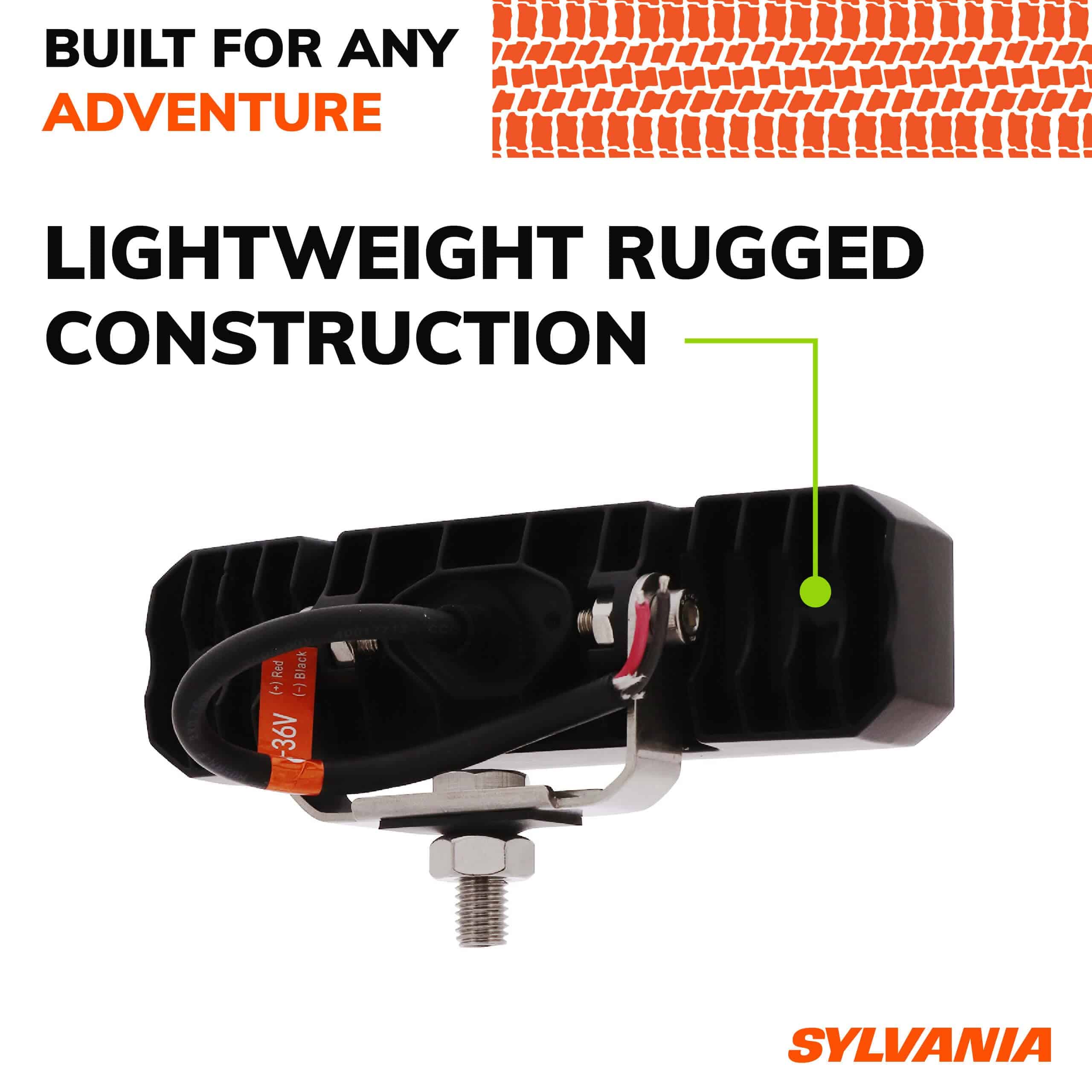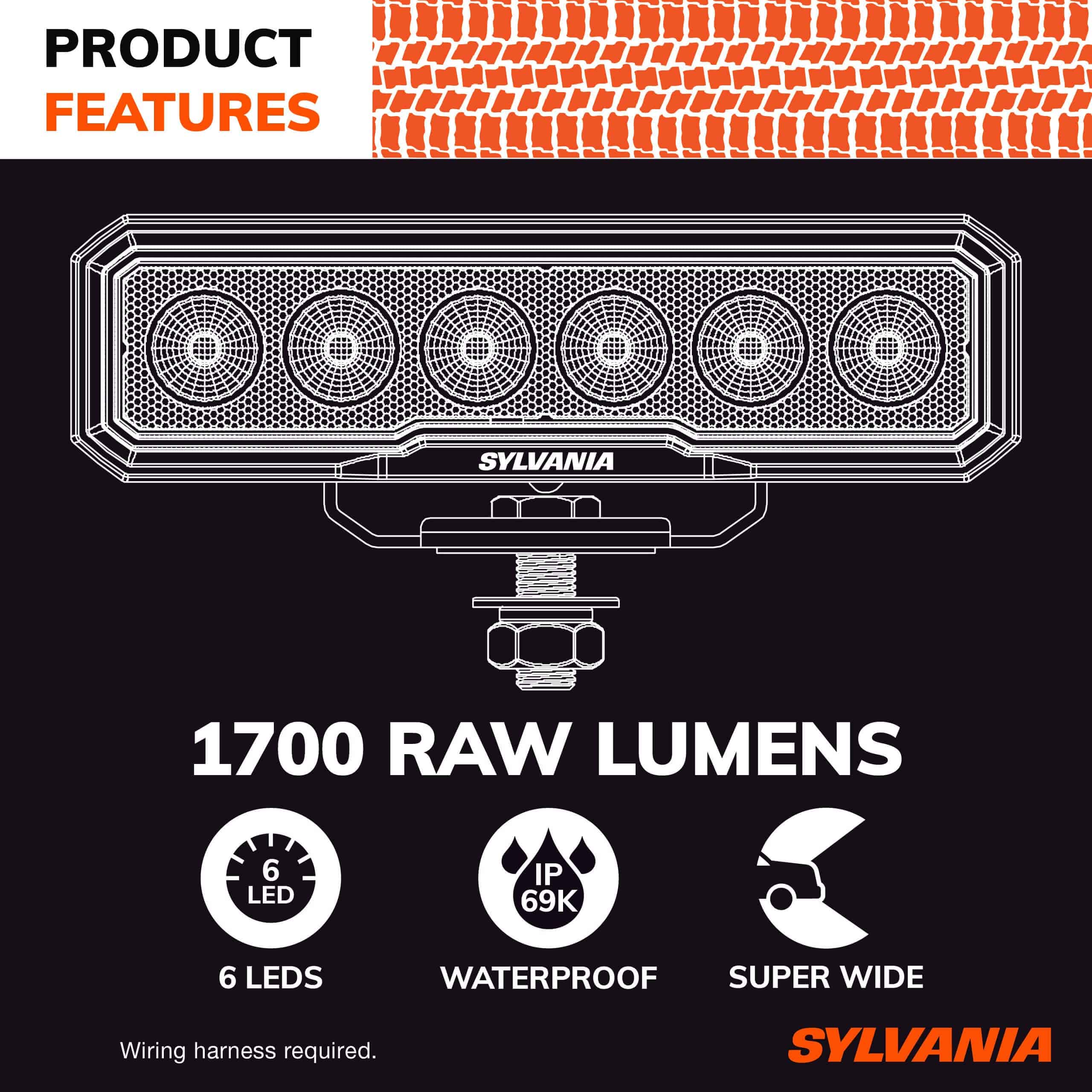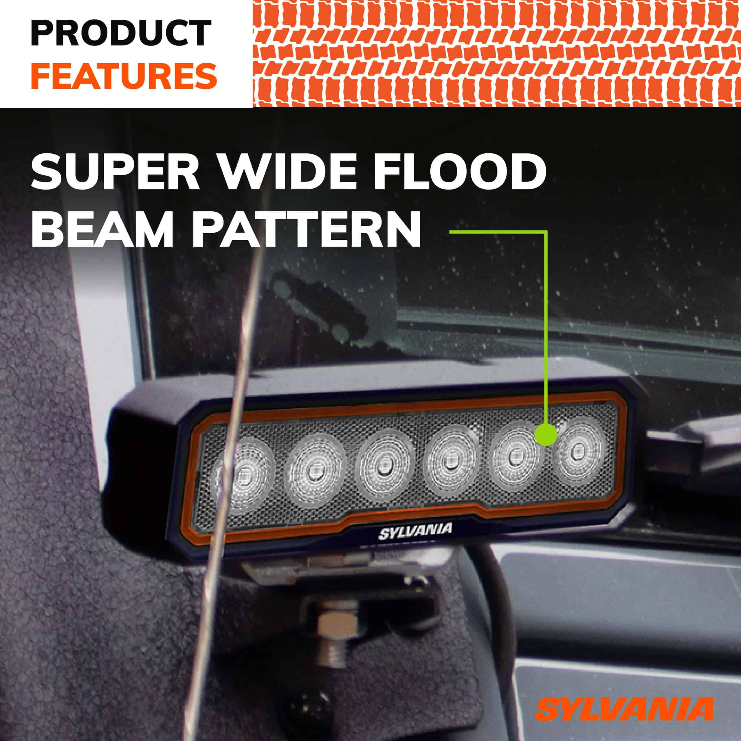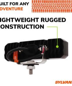 Estilo: SUPER INUNDACIÓN Cuando la iluminación de su vehículo no le proporciona suficiente luz, la barra de luz LED todo terreno SYLVANIA Rugged de 6″ proporciona un patrón de haz blanco brillante, dirigiendo la luz al sendero y al bosque que le rodea. La brillante luz de inundación súper ancha utiliza LED de alta potencia de renombre mundial OSRAM para producir una salida de luz extremadamente alta de 1,500 lúmenes efectivos para que pueda ver mejor. Nuestros ventiladores de enfriamiento son de clase mundial, con aletas profundas para disipar el calor fácilmente y permitir una duración extremadamente larga de los LEDs. Las dimensiones compactas permiten que esta luz de pod LED se monte donde desee. A prueba de golpes y vibraciones, la barra de luz LED de inundación SYLVANIA Rugged de 6″ es perfecta para cualquier aventura. Asóciese con SYLVANIA y piense más lejos en el camino. Especificaciones: Dimensiones del producto: 6.25 x 3 x 1.5 pulgadas Recuento de LED: 8 LEDS Lúmenes Crudos Todo Terreno: 1700 lúmenes Lúmenes Efectivos Todo Terreno: 1500 lúmenes Temperatura de Color (CCT): 6000 Kelvin Ángulo del Haz: 40 grados Luz de Inundación Súper Amplia Voltaje de Trabajo: 12-36V DC (se adapta a vehículos de 12V) Voltaje de Entrada: 14W @ 12V DC Consumo de Potencia: 1.2A @ 12V DC Cableado de Entrada: Pigtail Temperatura de Operación: -40 C a 65 C (-40 F a 150 F) Material de la Lente: Policarbonato Resistente al Agua: Clasificación IP69 Aplicaciones: Iluminación LED 12v, 24v TODO TERRENO: barras de luz para camiones, Barcos, SUV, UTV, atv, Motonieve, Motos, Motocicletas de tierra, 4×4, 4WD y otras luces LED automotrices INDUSTRIAL: Montacargas, Trenes, Excavadoras, Cortadoras de césped, Quitanieves, Tractores, Grúas y otros equipos pesados OTRAS Industrias Adecuadas: Bomberos y Rescate, Militar, Agrícola, Minería, Tala, Construcción y más.
