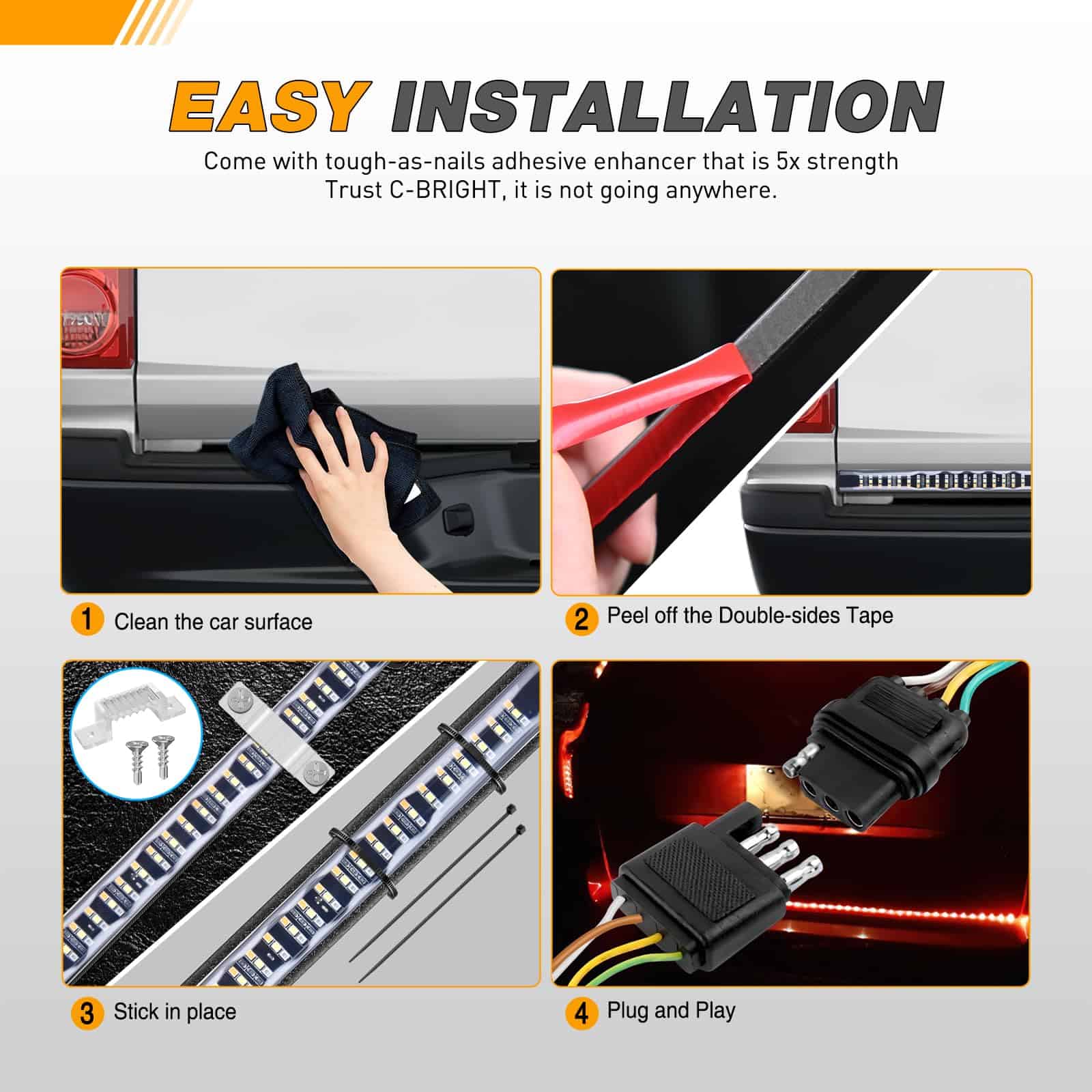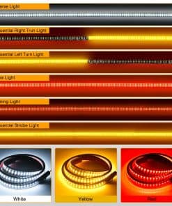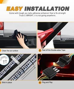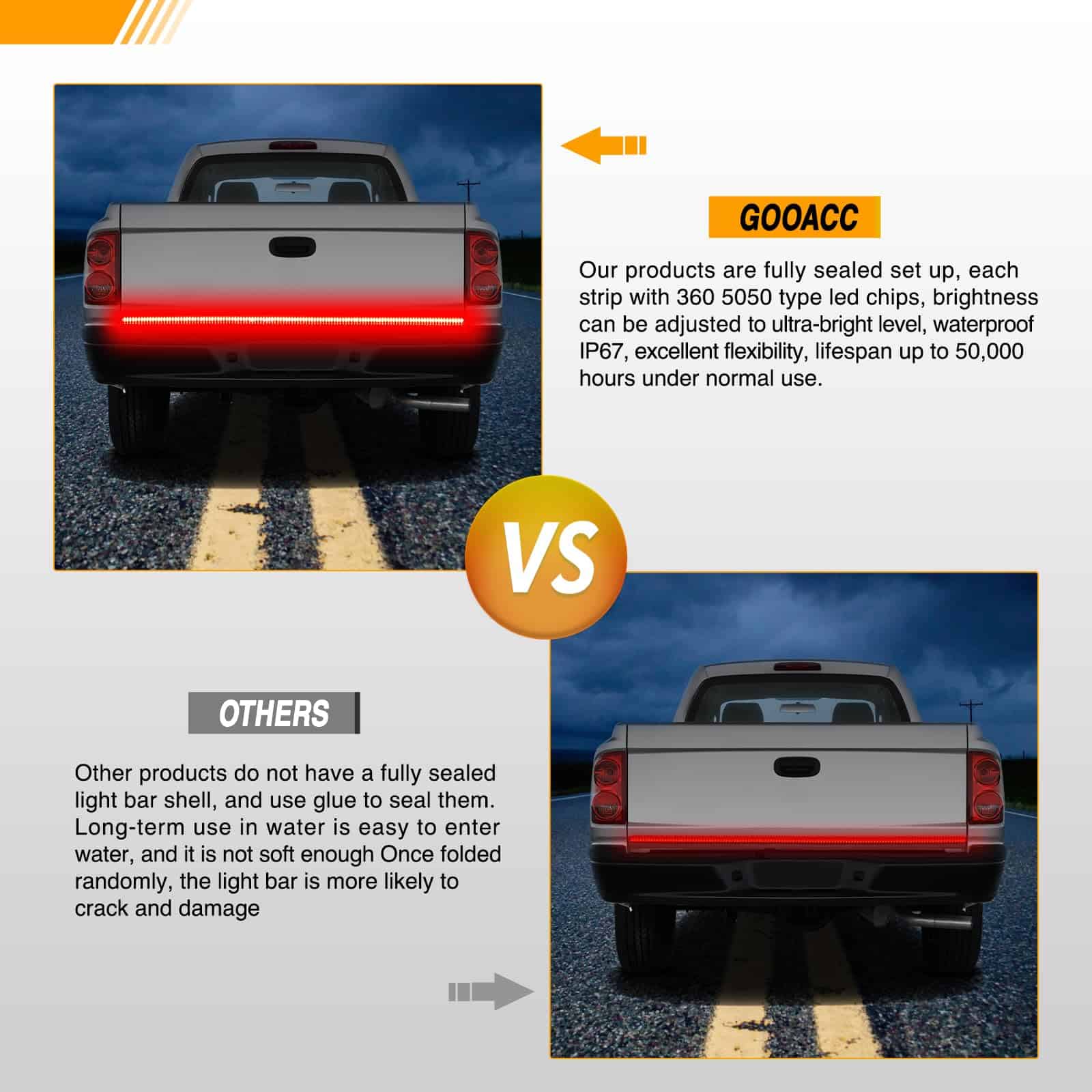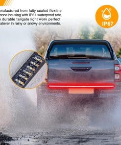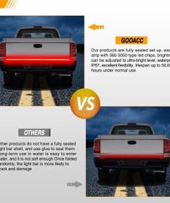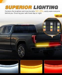 1. 6 Funciones Completas de la Tira de Luz para Portón Trasero Mejora la iluminación de tu automóvil con nuestra barra de luz, perfecta para cualquier necesidad de iluminación automotriz con nuestras 6 Funciones Completas: luz roja oscura en marcha, luz de freno roja brillante, luz blanca de reversa, señales de giro ámbar secuenciales, luz estroboscópica secuencial. Perfecto para cualquier necesidad de luces para automóviles. 2. No se Requiere Perforación No es necesario perforar, solo despegar y pegar, conector plano estándar de 4 pines enchufar y listo. También se pueden utilizar los soportes y tornillos adicionales para una mayor seguridad, no te preocupes por que se caiga. Nota: Prueba primero las luces intermitentes izquierda y derecha antes de pegar la tira de luz. 3. Más Brillante y Mejor La Barra de la luz trasera LED tiene 360 LED que brillan un 300% más brillantes que las tiras normales y aseguran que tu automóvil pueda ser visto incluso en el tráfico más denso, día o noche. Ideal para luces de caja de camión y luces LED para portón trasero, puede ser una llamada de atención para aquellos detrás de ti. 4. Ampliamente Aplicable Con un voltaje de trabajo de 12V CC, se ajusta a la señal de giro ámbar en la mayoría de los vehículos. Como Dodge Ram 1500 2500, 3500, 4500, Ford F150, F250, Chevy, Silverado, GMC, Sierra, Toyota Tundra y la mayoría de automóviles, camiones, Pickups, SUV, RV, Van, remolques, etc. Actualiza las luces traseras con nuestra barra de luz para portón trasero de camión de 60 pulgadas. 5. Calidad superior para todas las estaciones Caja sellada IP67, completamente sellada de silicona y flexible, puede soportar cualquier clima adverso y entorno hostil. Vida útil superior a 50,000 horas