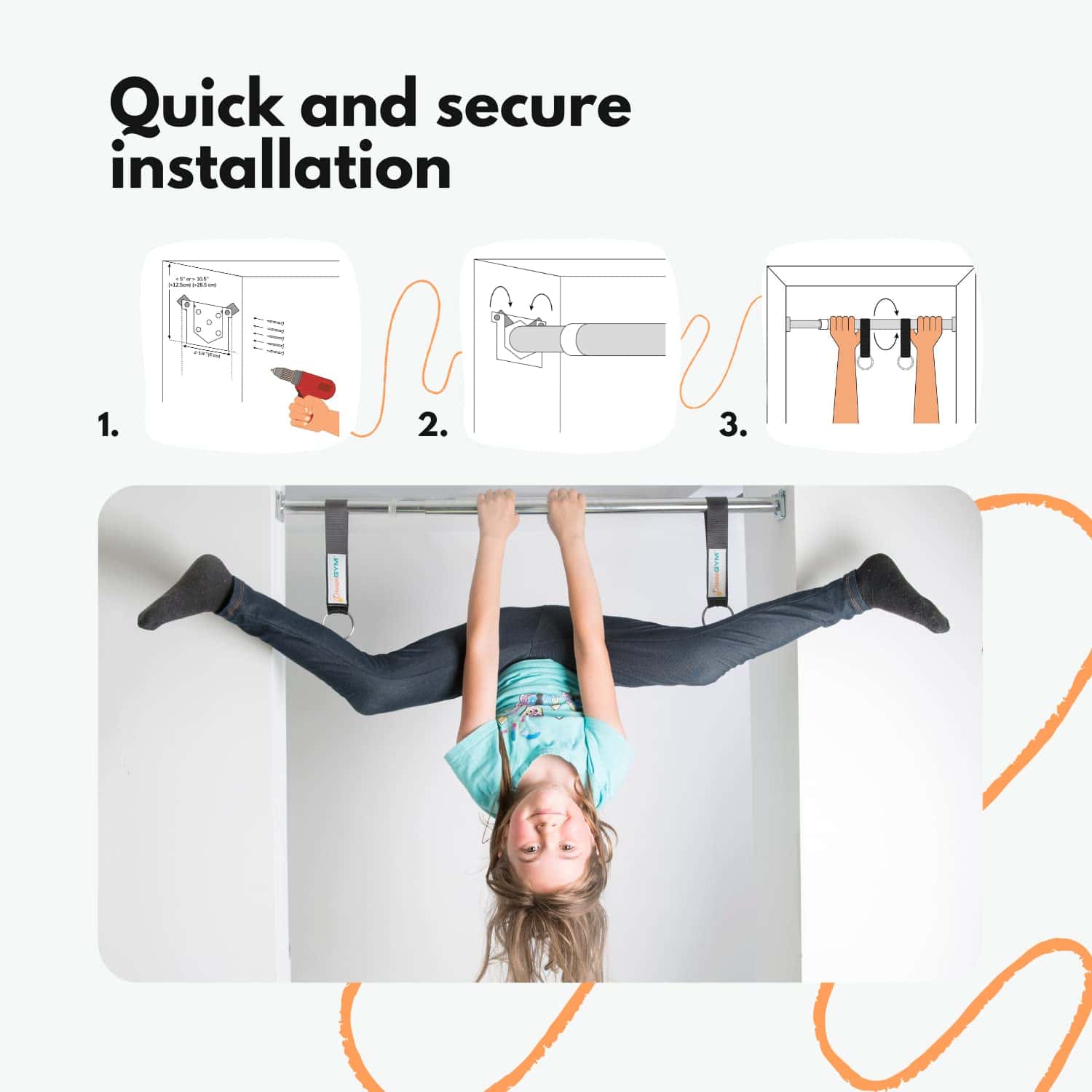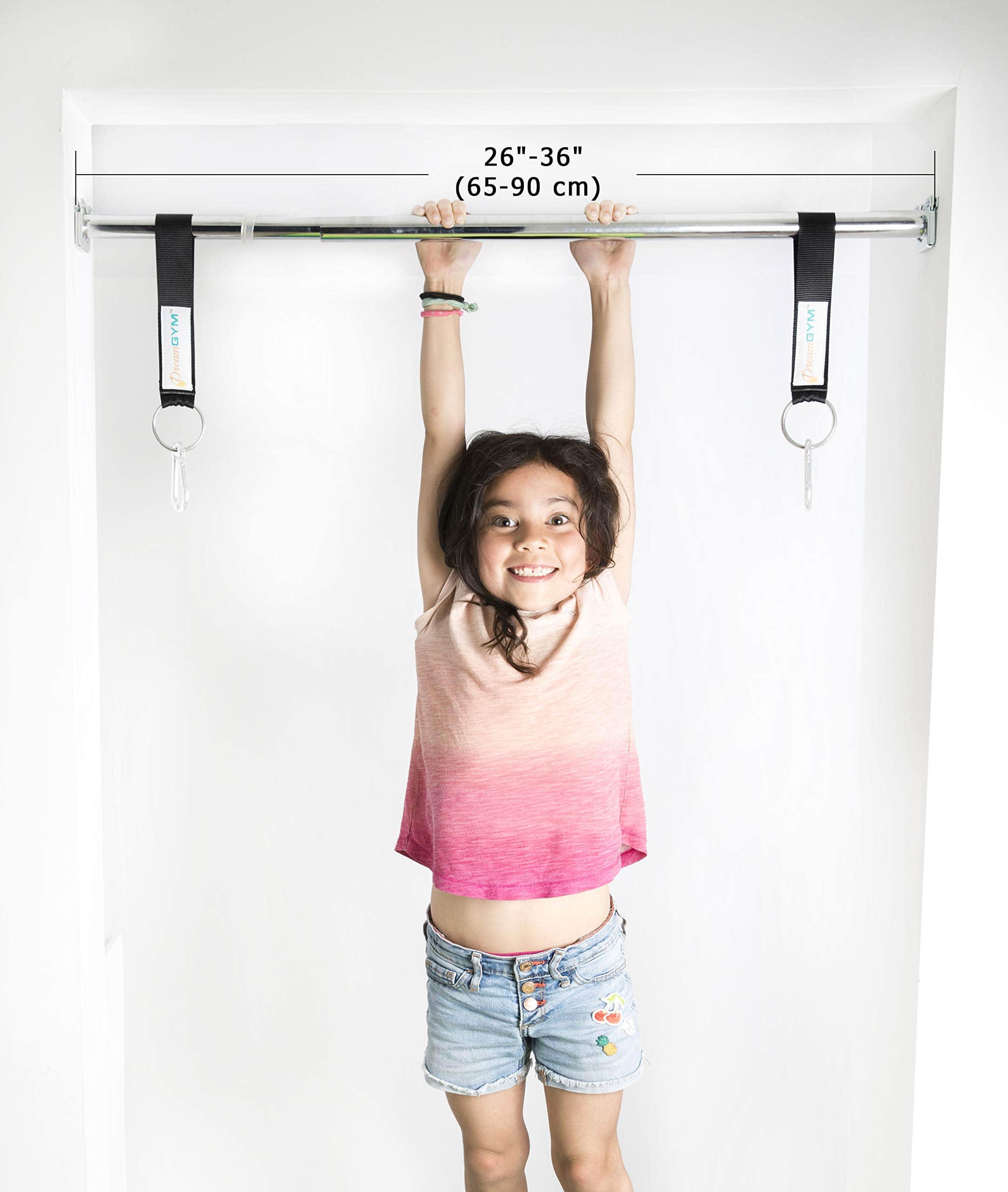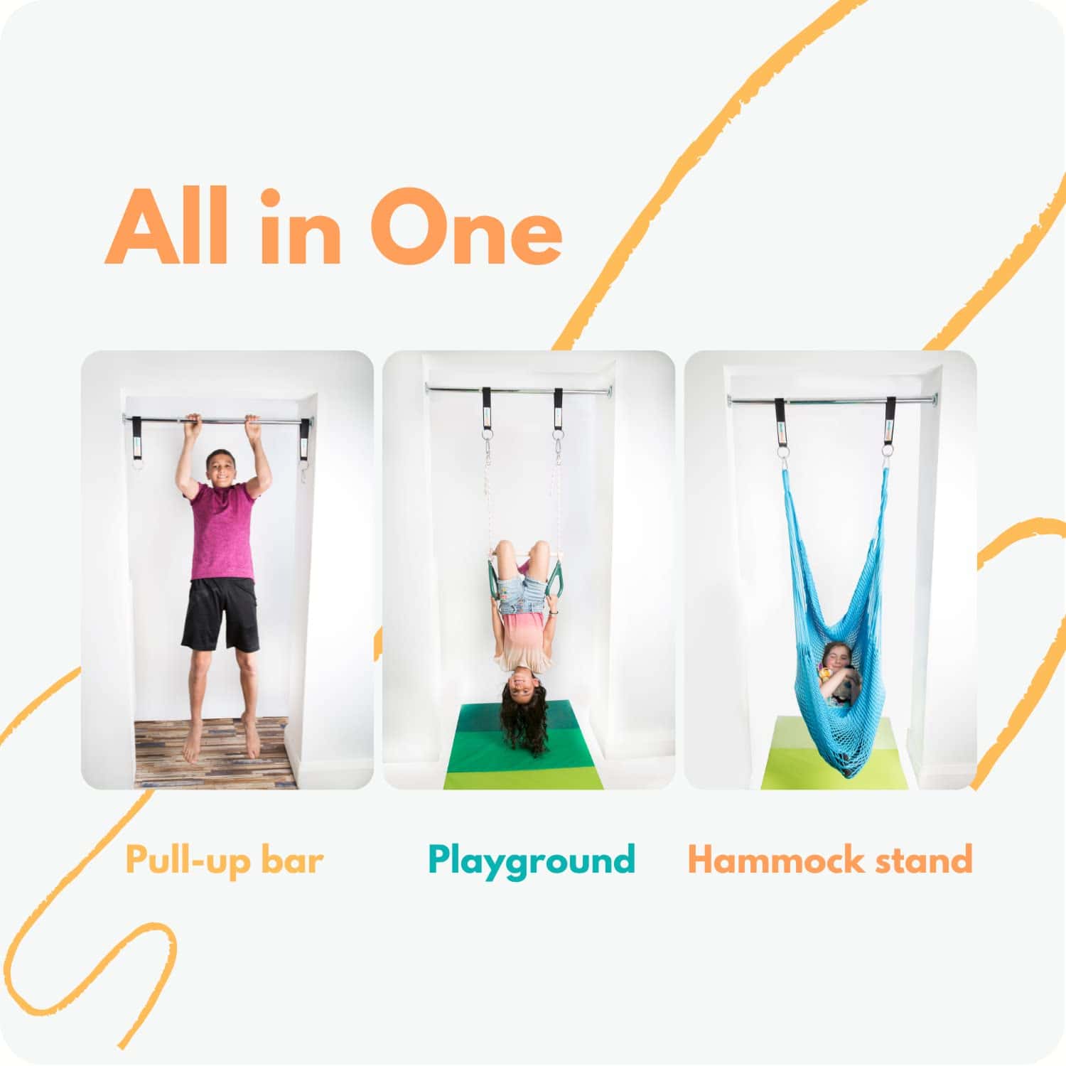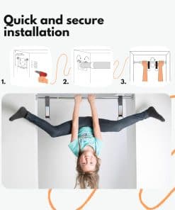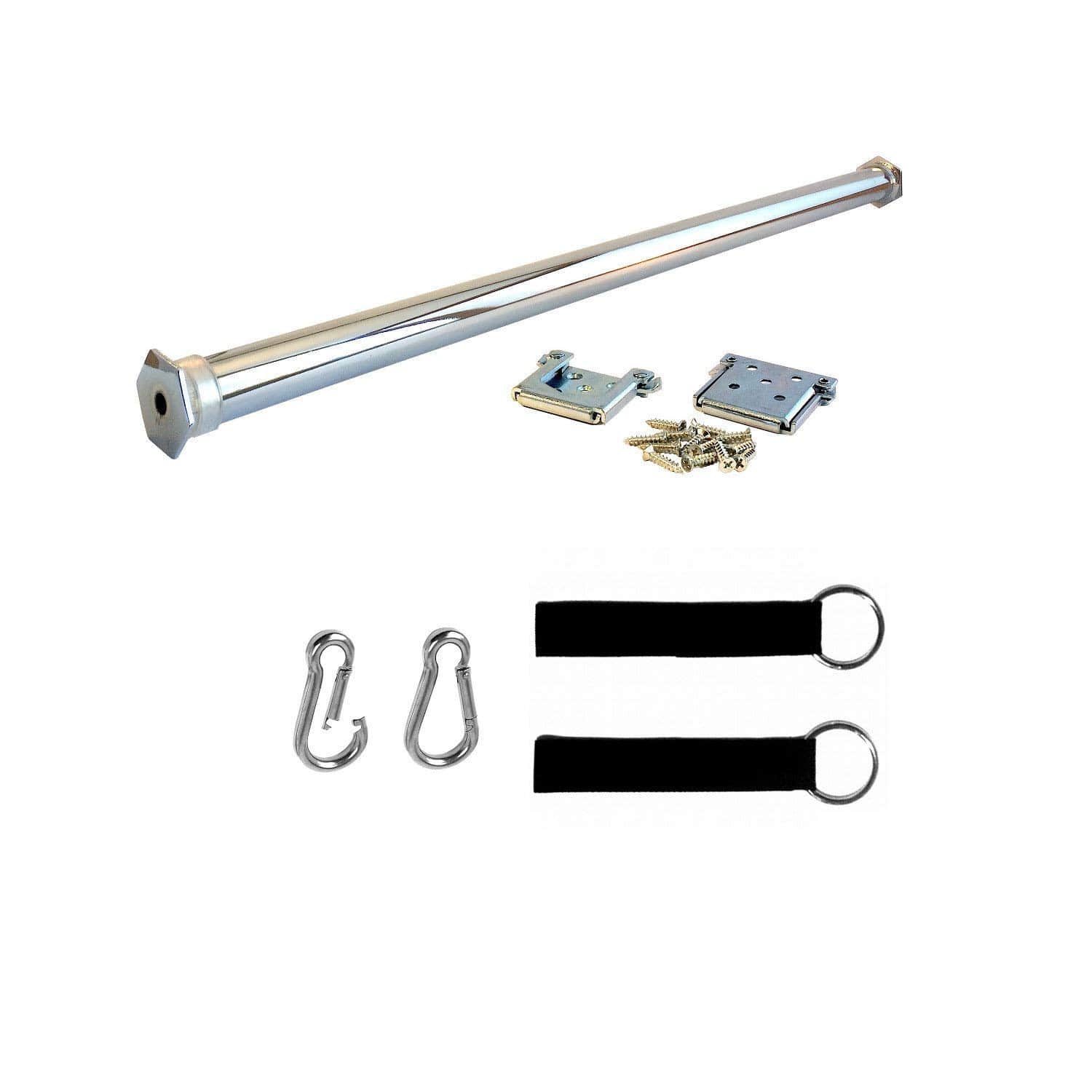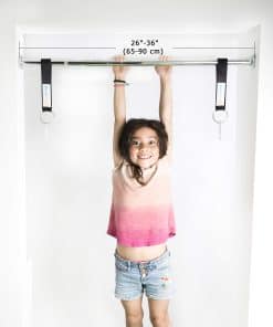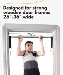 La barra de soporte para columpio de puerta DreamGYM 2 en 1 es la solución perfecta para traer tus accesorios de columpio al aire libre al interior durante los meses fríos y días lluviosos o para usarla como columpio de yoga u otro equipo de ejercicio. La barra de acero cromado resistente es una excelente barra de dominadas para padres y adolescentes, permitiéndote hacer ejercicio y ganar fuerza en la comodidad de tu hogar. La barra está asegurada por soportes de metal atornillados en un marco de puerta de madera y diseñados para adaptarse a la mayoría de los marcos de puertas estándar de 26″ a 36″ sin interferir con la apertura o cierre. Ideal para apartamentos o hogares compactos donde no está disponible un centro de fitness de tamaño completo, la barra te permite hacer cientos de ejercicios de entrenamiento.