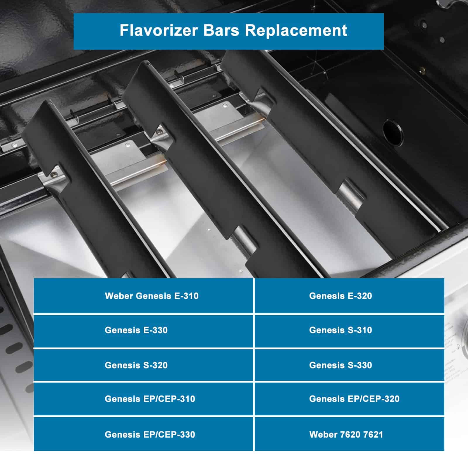 1. Compatibilidad: Barras flavorizer de repuesto para la serie Weber Genesis 300 con perillas de control montadas en la parte frontal: Weber Genesis E-310, E-320, E-330, S-310, S-320, S-330 y Genesis EP / CEP 310 320 330 Gas Grills, Reemplaza Weber 7620 7621. NO es compatible con las series Weber Genesis II 300 y Genesis II LX 300.