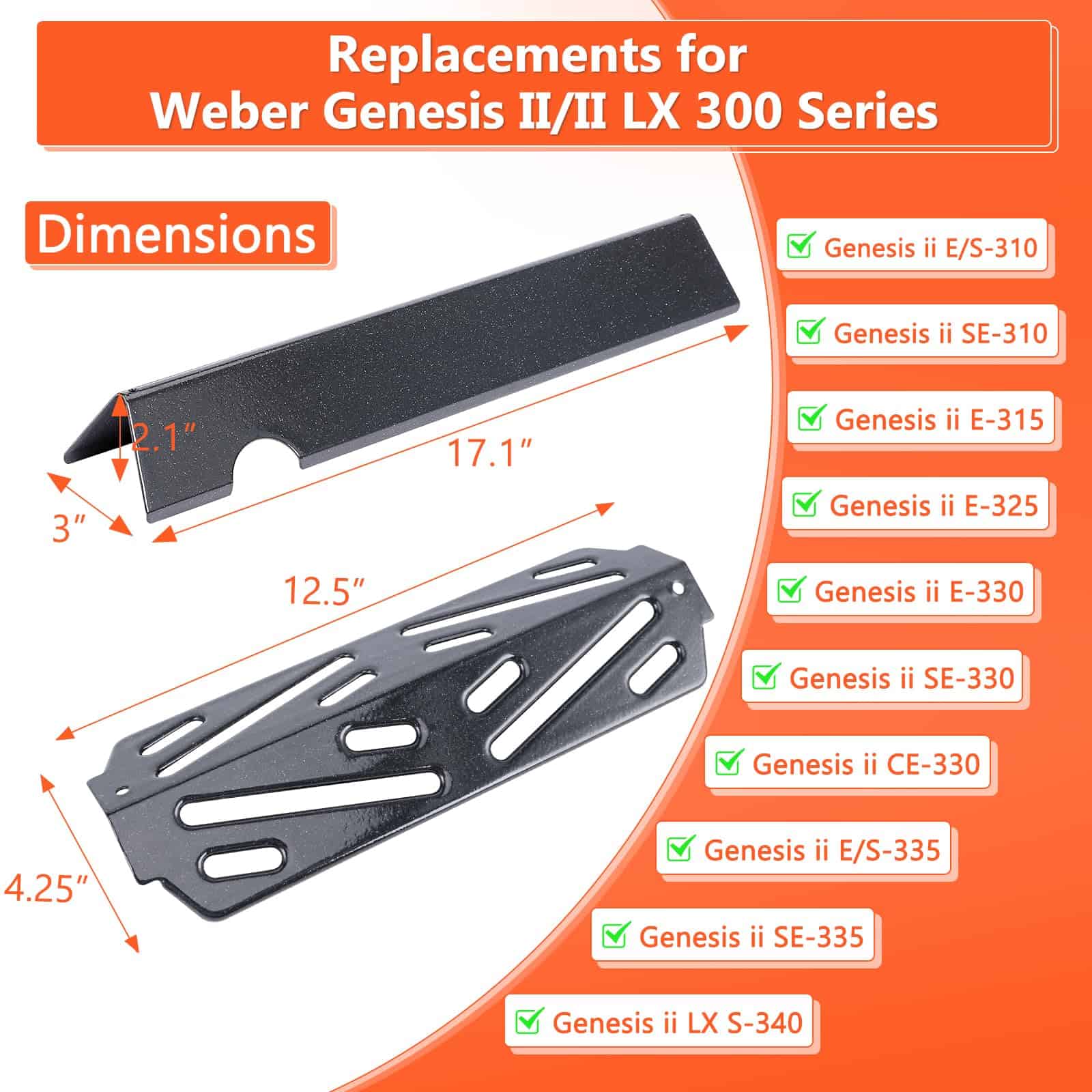 2. Compatible con parrillas Weber Genesis II de la serie 300. Estas barras flavorizer Genesis II y deflectores de calor Genesis II son compatibles con Weber Genesis II E-310, Genesis II S-310, Genesis II SE-310, Genesis II E-315, Genesis II E-325, Genesis II E-330, Genesis II SE-330, Genesis II CE-330, Genesis II S-335, Genesis II SE-335, Genesis II E-335, Genesis II S-345 (2017 y posteriores). Reemplaza las piezas 66032, 66795.