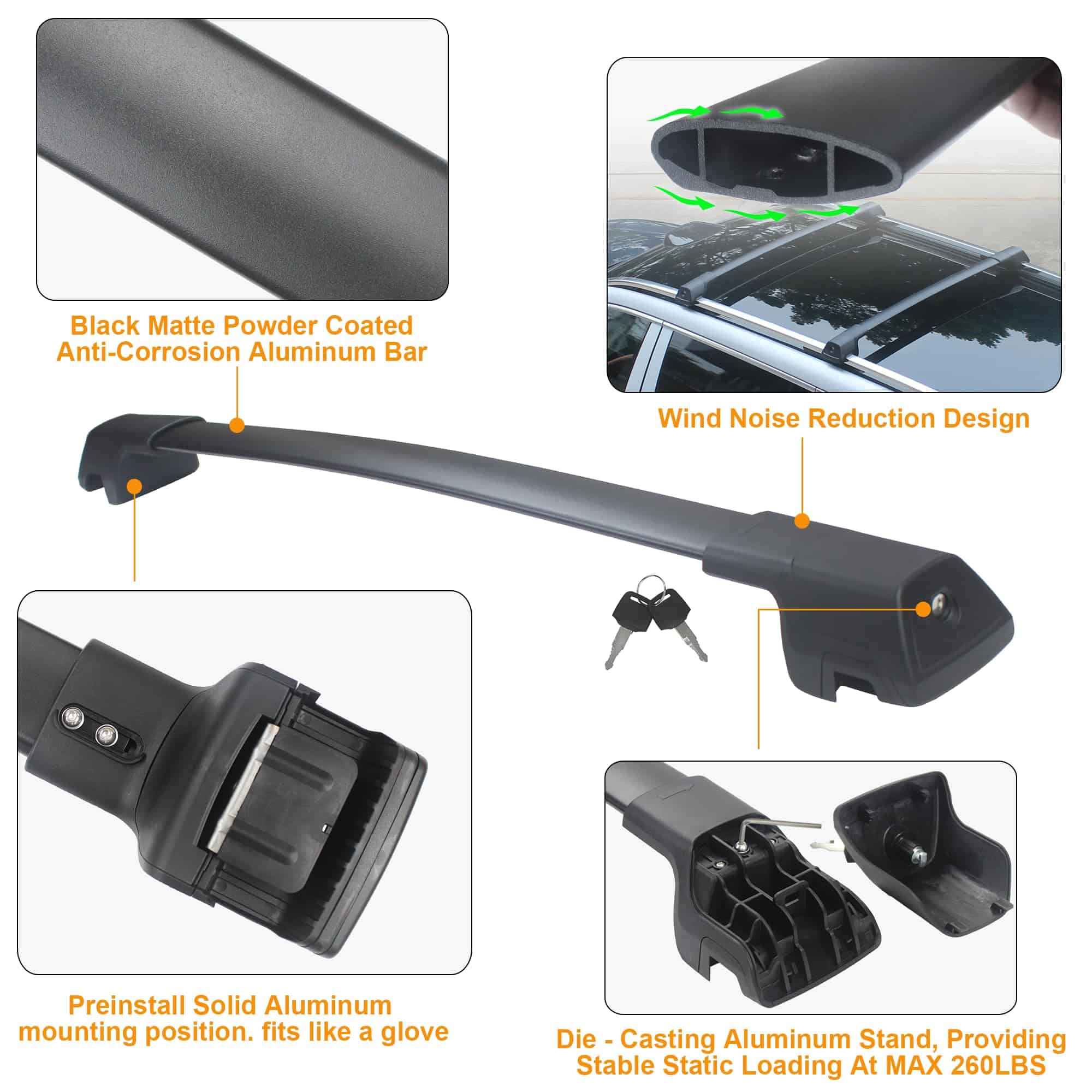 1. PROTEGE TU VEHÍCULO Con almohadilla de goma suave integrada, no rayará el riel del techo de tu automóvil. IMPORTANTE: SOLO SE AJUSTA A Toyota Rav4 2013-2018 (Equipado con rieles laterales elevados de fábrica). 2. ASEGURA TU CARGA Las barras transversales vienen con cerradura anti-robo y llave. Asegura eficazmente tu carga durante tu viaje. 3. RENDIMIENTO ESTABLE Estructura de metal fundido + aluminio, se ajusta perfectamente y sin vibraciones durante el uso. Carga máxima de hasta 260 libras. 4. INSTALACIÓN SENCILLA: Este par de barras transversales de repuesto para Ford Bronco Sport 2021-2024 NO necesita perforar / modificar el techo de tu automóvil, simplemente montarlas directamente en tus rieles de techo existentes según las instrucciones marcadas, normalmente se tarda 10-15 minutos en completar toda la instalación. 5. BAJA RESISTENCIA AL VIENTO Y RUIDO Y ANTI-CORROSIÓN Estas barras transversales de techo para Ford Bronco Sport 2021-2024 están hechas de aluminio de aviación, acabado en polvo negro mate que no se corroe de por vida, diseño dinámico para reducir la resistencia al viento y al ruido durante la conducción. 6. Sin preocupaciones: Estas Barras transversales para Ford Bronco Sport 2021-2024 respaldadas con 2 años de garantía. No dude en contactarnos por correo electrónico para cualquier otra asistencia. Le responderemos en un plazo de 24 horas.