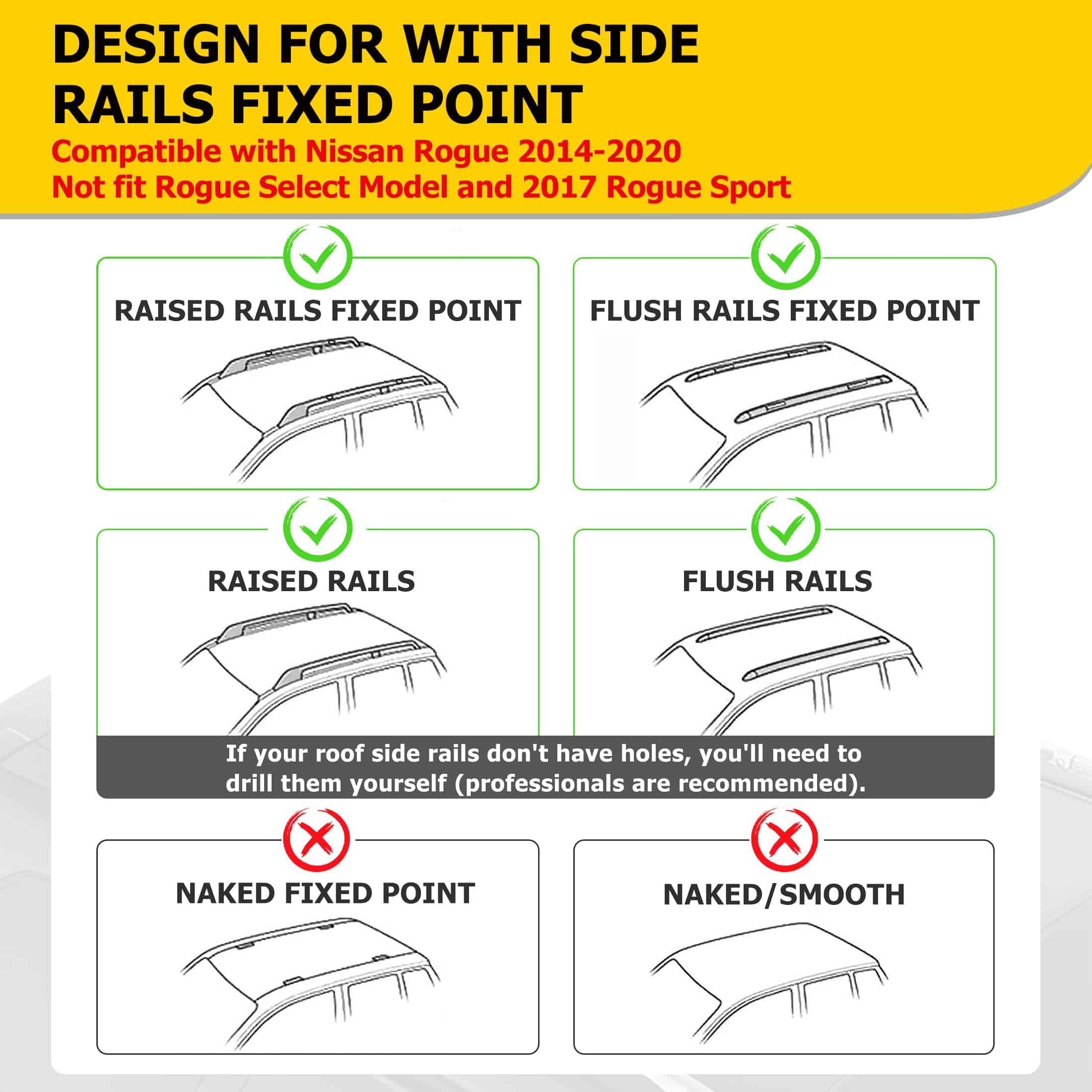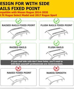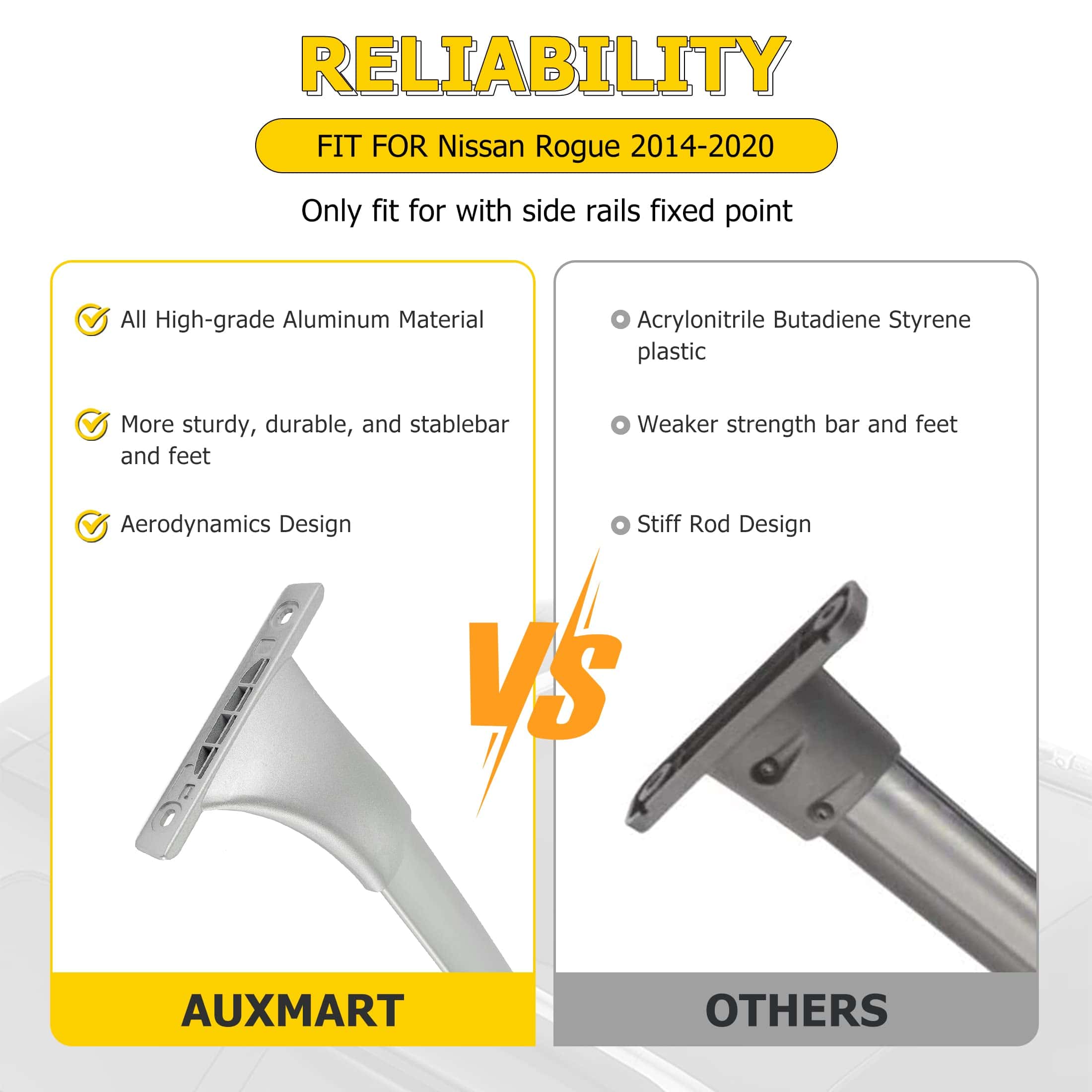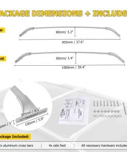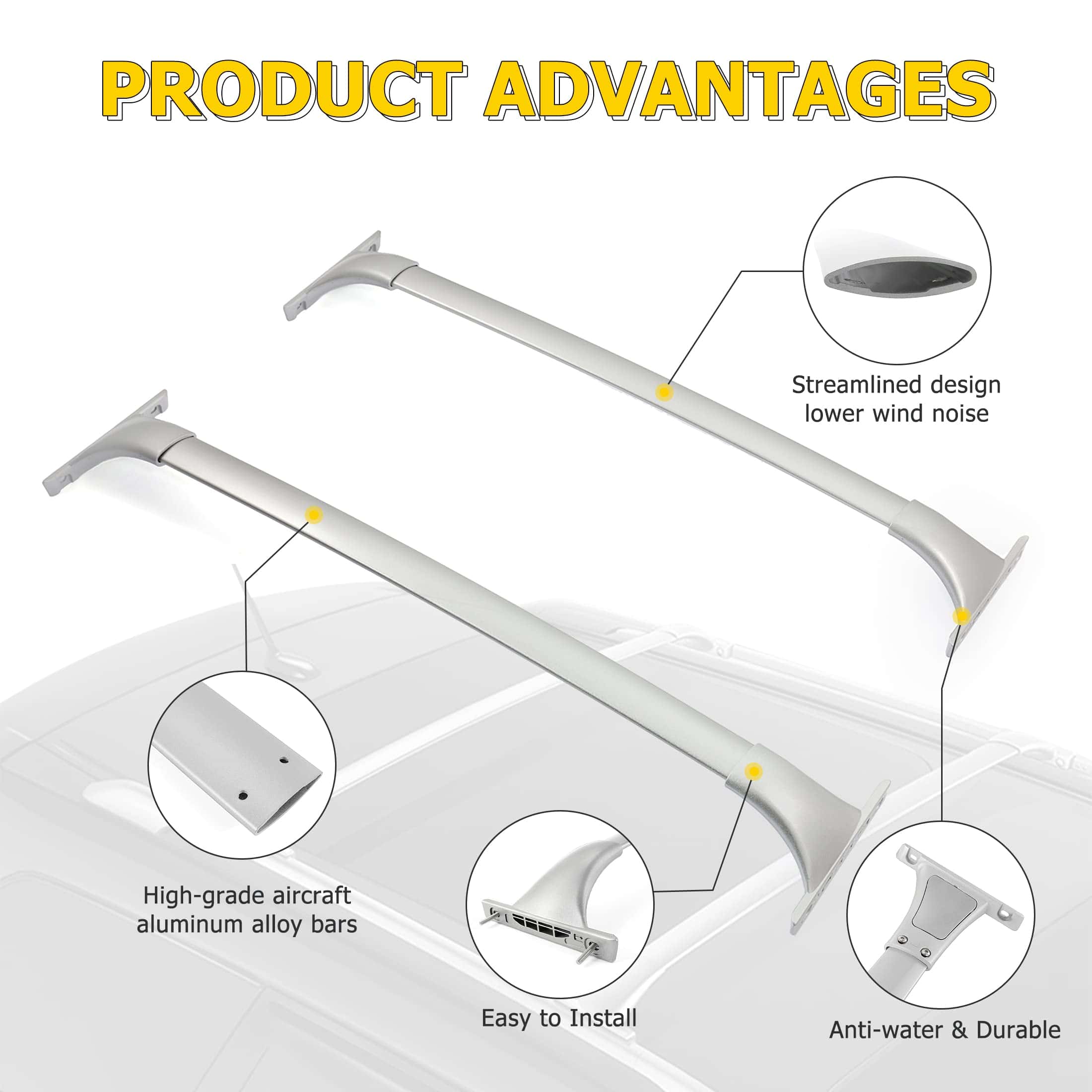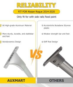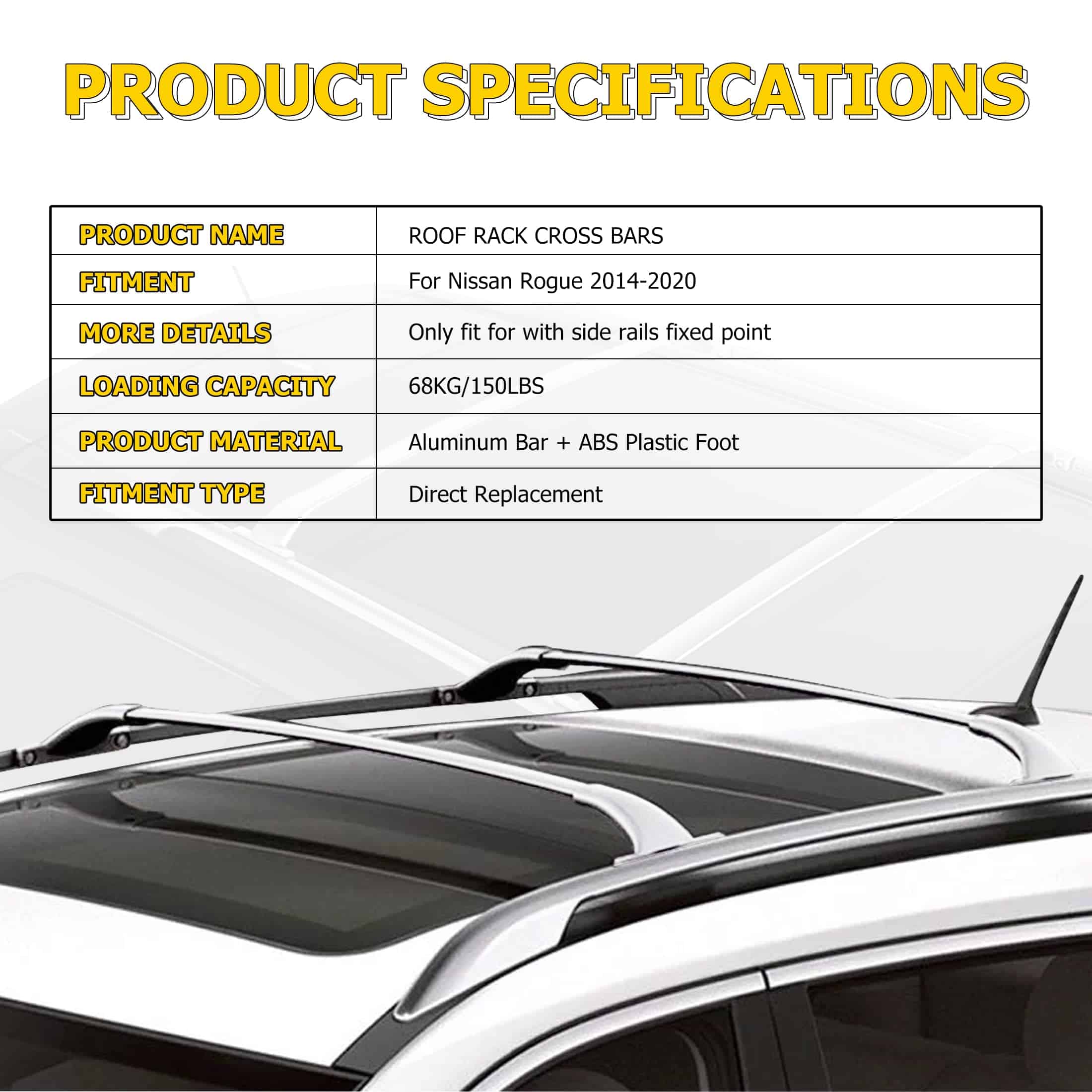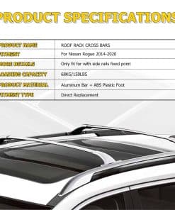 Las Barras Transversales de Rack de Techo AUXMART están diseñadas para adaptarse a Nissan Rogue 2014-2020. Se necesitan rieles laterales de fábrica para su instalación. Estas barras portaequipajes de aluminio de alta calidad son resistentes y duraderas, con una capacidad de carga de hasta 150 libras. Perfectas para transportar equipaje extra, escaleras u otros objetos voluminosos. El diseño mecánico en forma de arco proporciona una mayor resistencia y evita la deformación. Las barras transversales son ideales para la instalación de accesorios de techo como portabicicletas, cajas de carga, etc. Fáciles de instalar en solo 15-30 minutos. ¡Prepárate para tu próxima aventura con las Barras Transversales de Rack de Techo AUXMART!