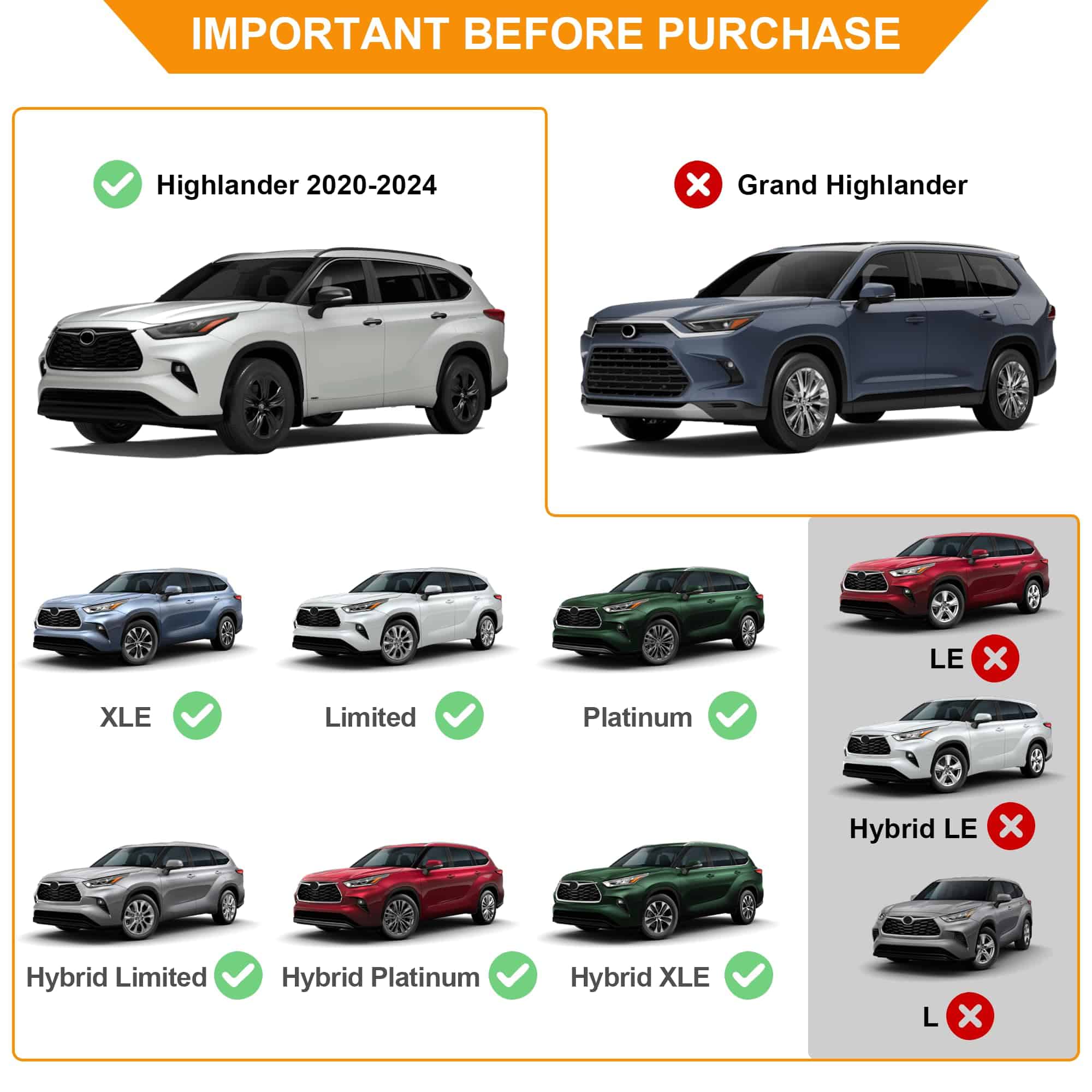 Diseño especial para el nuevo Toyota Highlander 2020-2022 XLE/Limited/Platinum/Hybrid Limited/Hybrid Platinum/Hybrid XLE (NO ORDENAR ESTO PARA HIGHLANDER L/LE/LE HYBRID)