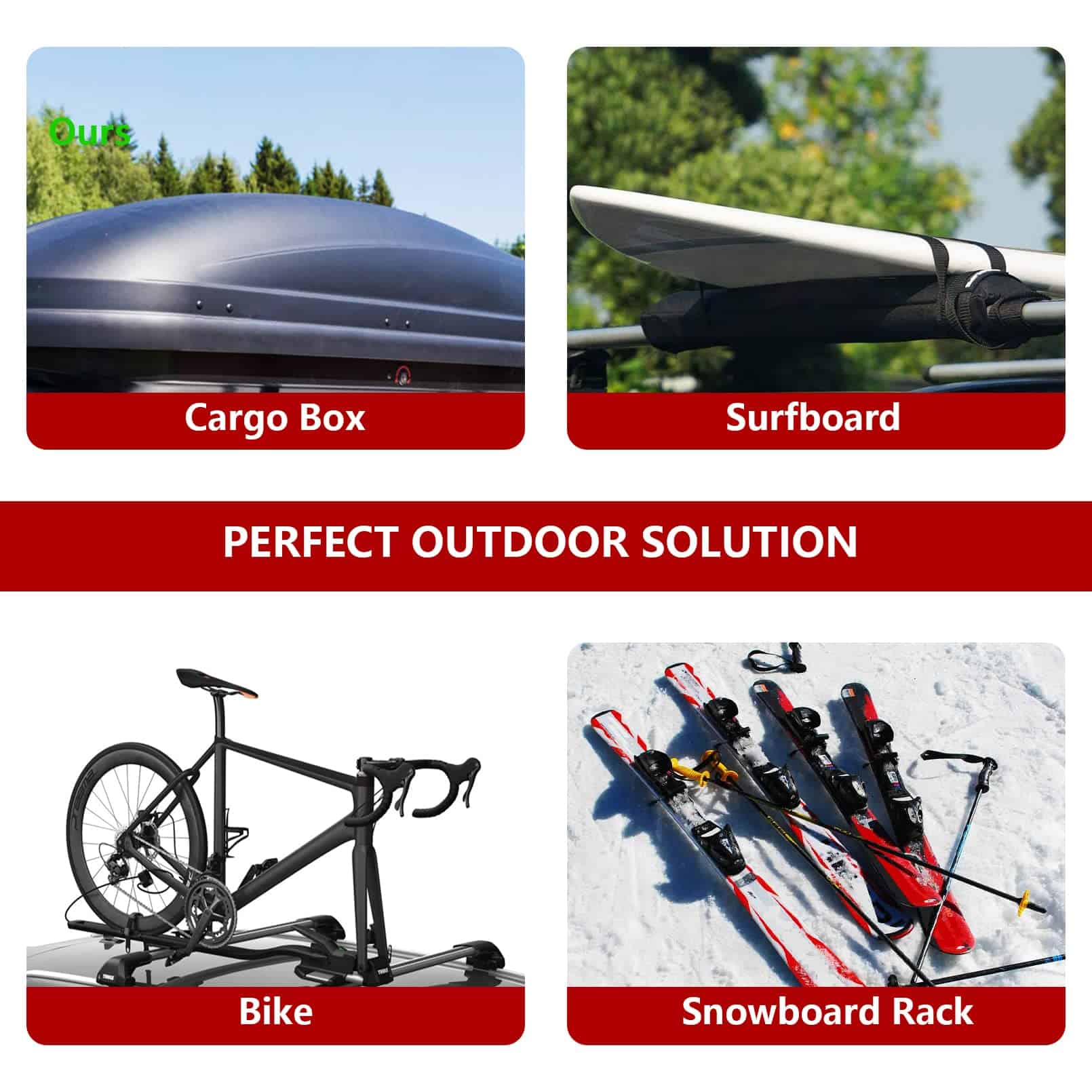 Solución perfecta para transportar las cosas que desea Para contenedor Para canoas/kayaks Para esquís Para bicicleta Para equipaje Para tabla de surf Para caña de pescar