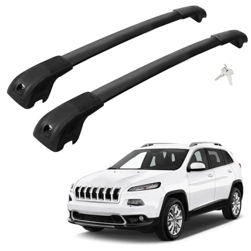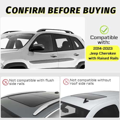 1. Vehículo compatible: Barras transversales de techo compatibles con Cherokee 2014 2015 2016 2017 2018 2019 2020 2021 2022 2023 (con rieles laterales elevados de fábrica), incluidos Latitude/ Latitude Plus/ Limited/ North Edition/ Trailhawk/ High Altitude/ Altitude Lux, etc. Especializadas para vehículos, mejor que las barras de techo universales. Por favor, verifique el Año, Marca y Modelo de su vehículo antes de comprar.
