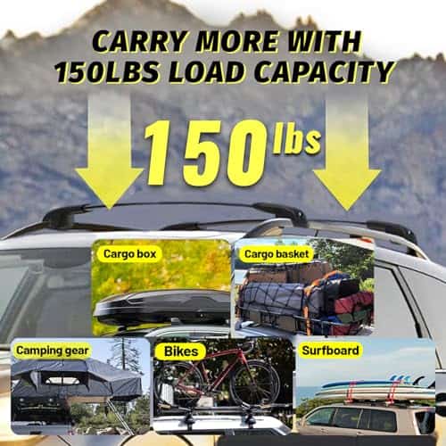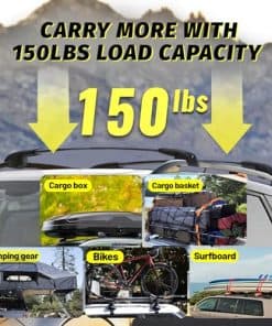 4. Gran Capacidad y Versatilidad: Las barras de techo se pueden utilizar para aumentar el espacio de almacenamiento total de su vehículo, esta barra transversal de techo puede soportar hasta 150 libras y se puede utilizar con la mayoría de los accesorios y portaequipajes de techo como portaequipajes, kayaks, canoas, cajas de carga, esquís, tablas de snowboard, bicicletas, cañas de pescar y más.