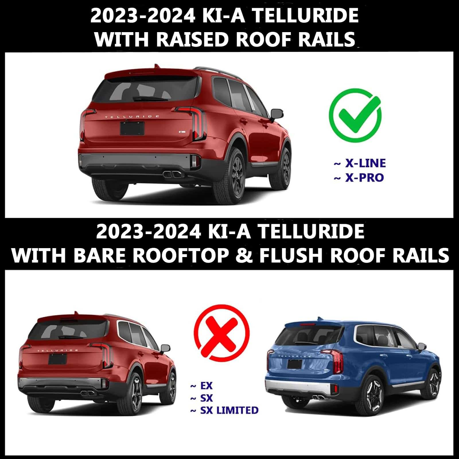 Ajuste necesario: Las barras transversales del techo se ajustan a Kia Telluride EX X-Line, SX X-Pro, SX Prestige X-Line, SX Prestige X-Pro 2023 y 2024 con rieles laterales elevados de fábrica solamente. Nota importante: 1- Se requieren rieles de techo elevados. 2- El paquete no incluye rieles de techo. 3- No apto para modelos con techos desnudos. Construcción resistente: Transporte de manera segura su equipo de campamento, equipaje, cañas de pescar, escaleras, tablas de snowboard y canoas en su próximo viaje. Base perfecta para cestas de carga y otros accesorios para el techo. Condición del artículo: 100% nuevo. Instalación: Instalación directa mediante pernos y tornillos. Material: Barras de aleación de aluminio. Color: Negro. Capacidad: 220 lbs / 100 kgs. Paquete incluye: Barras transversales (delanteras y traseras), hardware de montaje. Marca en la que puedes confiar: Rock Auto Accs (RAA) es una nueva tienda en línea con sede en Alberta, Canadá, que ofrece accesorios exteriores para automóviles de alta calidad a precios asequibles.