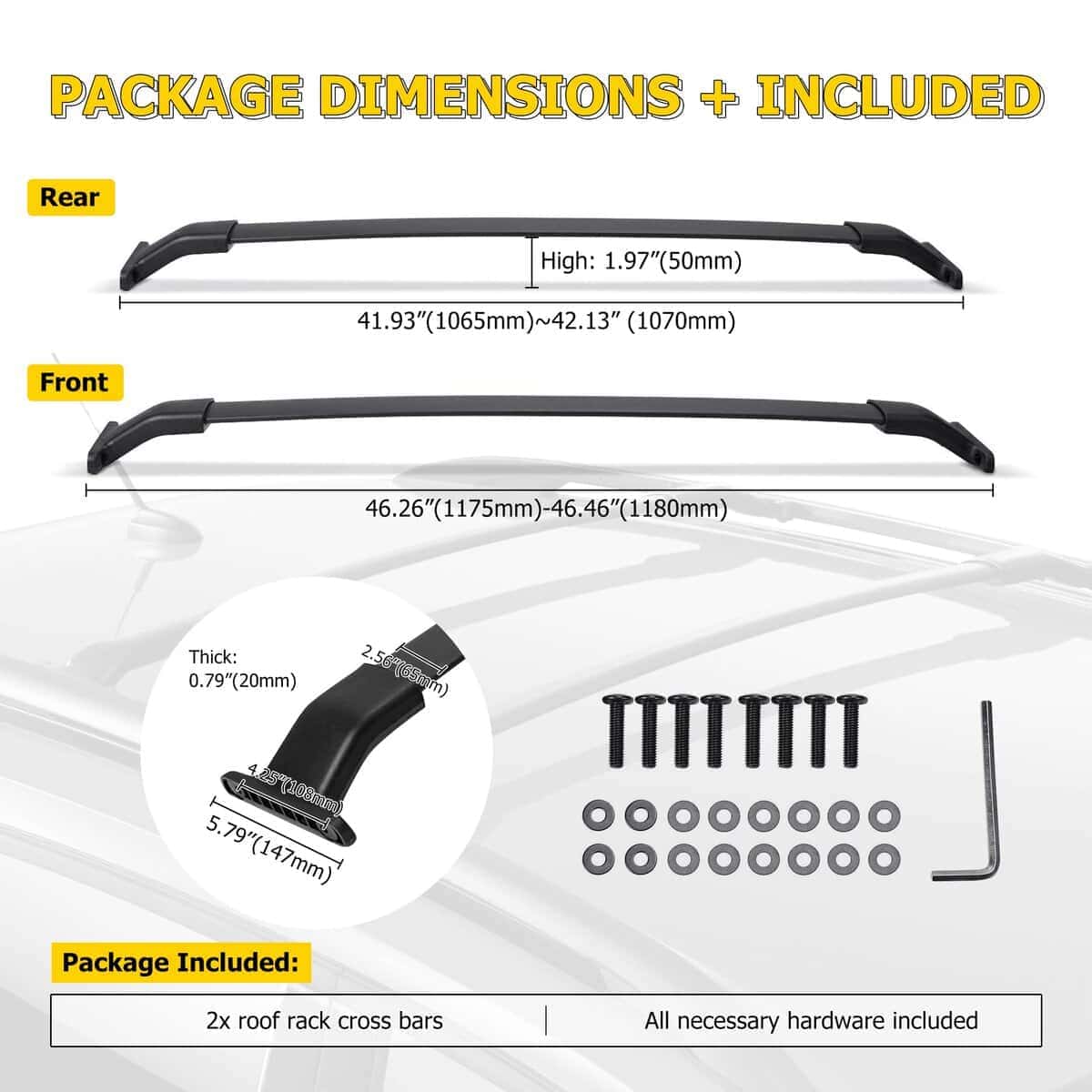 3. Carga potente: hechas de barra de aleación de aluminio de grado marino + pies de aluminio, las barras transversales pueden soportar hasta 132 libras (60 kg) y pueden soportar equipaje, escaleras o carga. Las barras transversales tienen propiedades anti-óxido y anti-corrosión para ayudarlo a viajar bajo la lluvia/nieve. Proporciona a los vehículos una capacidad de carga fuerte, que es muy adecuada para viajes al aire libre y transporte de objetos grandes a largas distancias.