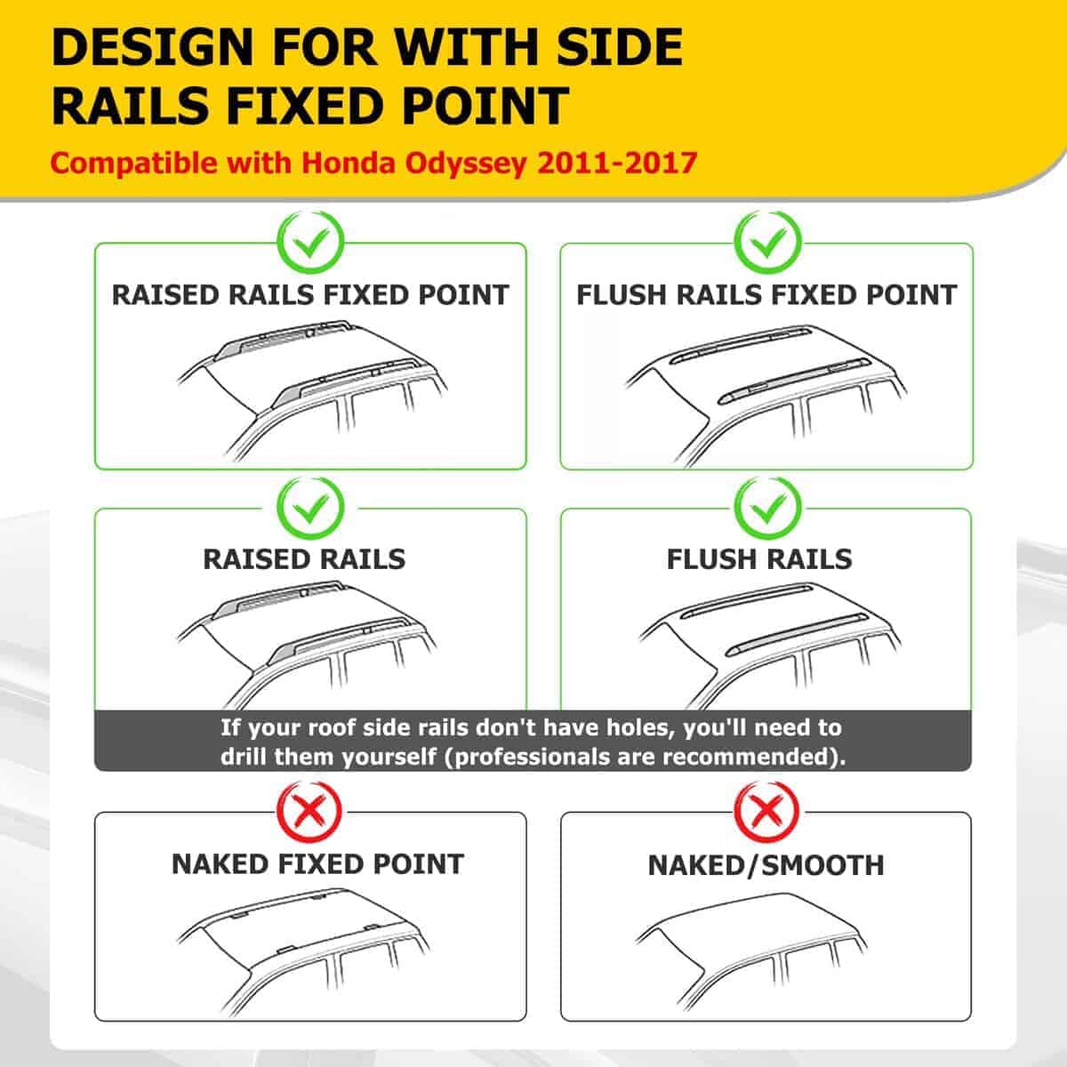 2. Compatibilidad: Adecuado para Honda Odyssey 2011-2017 Estilo OE, las barras transversales del portaequipajes pueden coincidir perfectamente con el vehículo. Por favor, asegúrese de que su vehículo sea compatible antes de comprar.