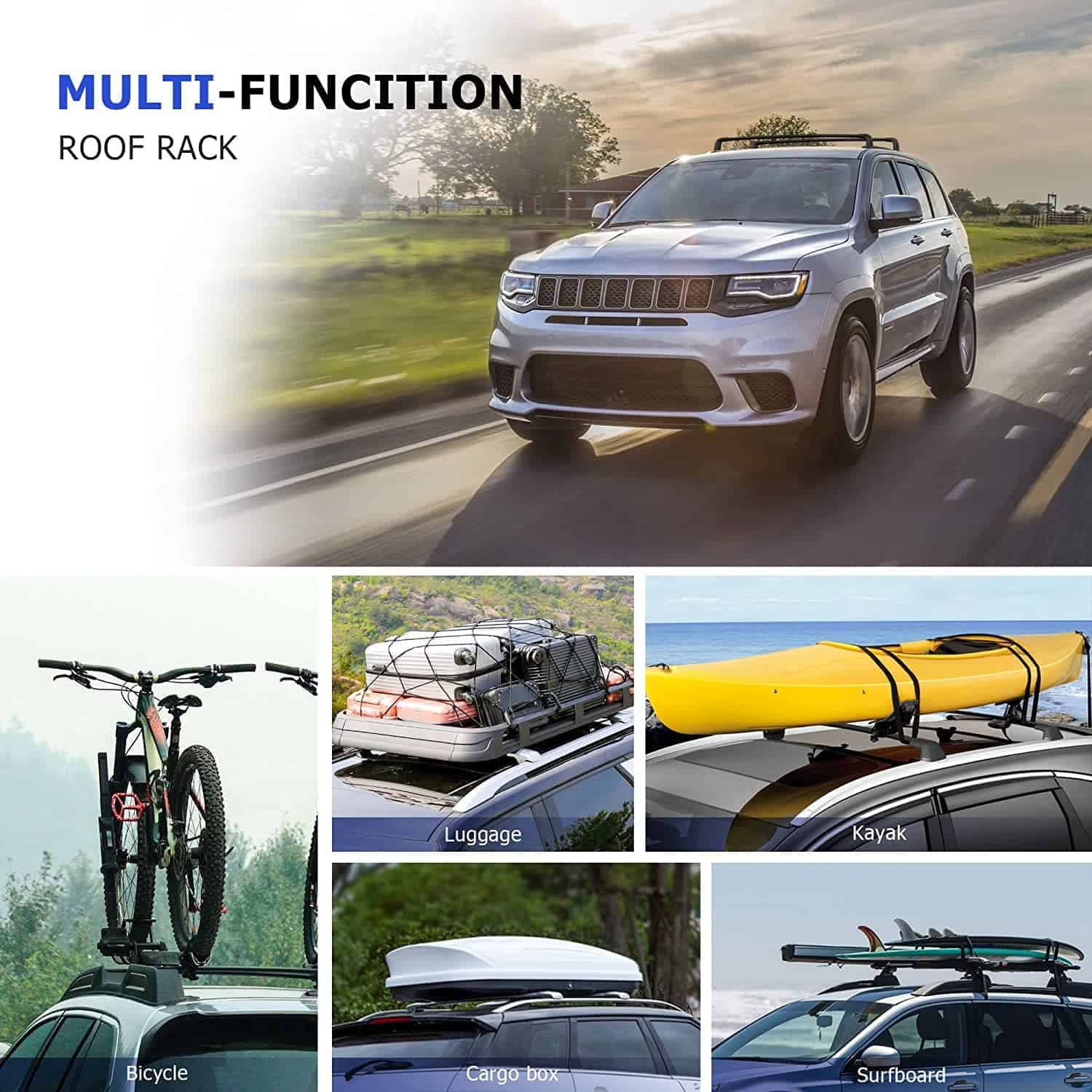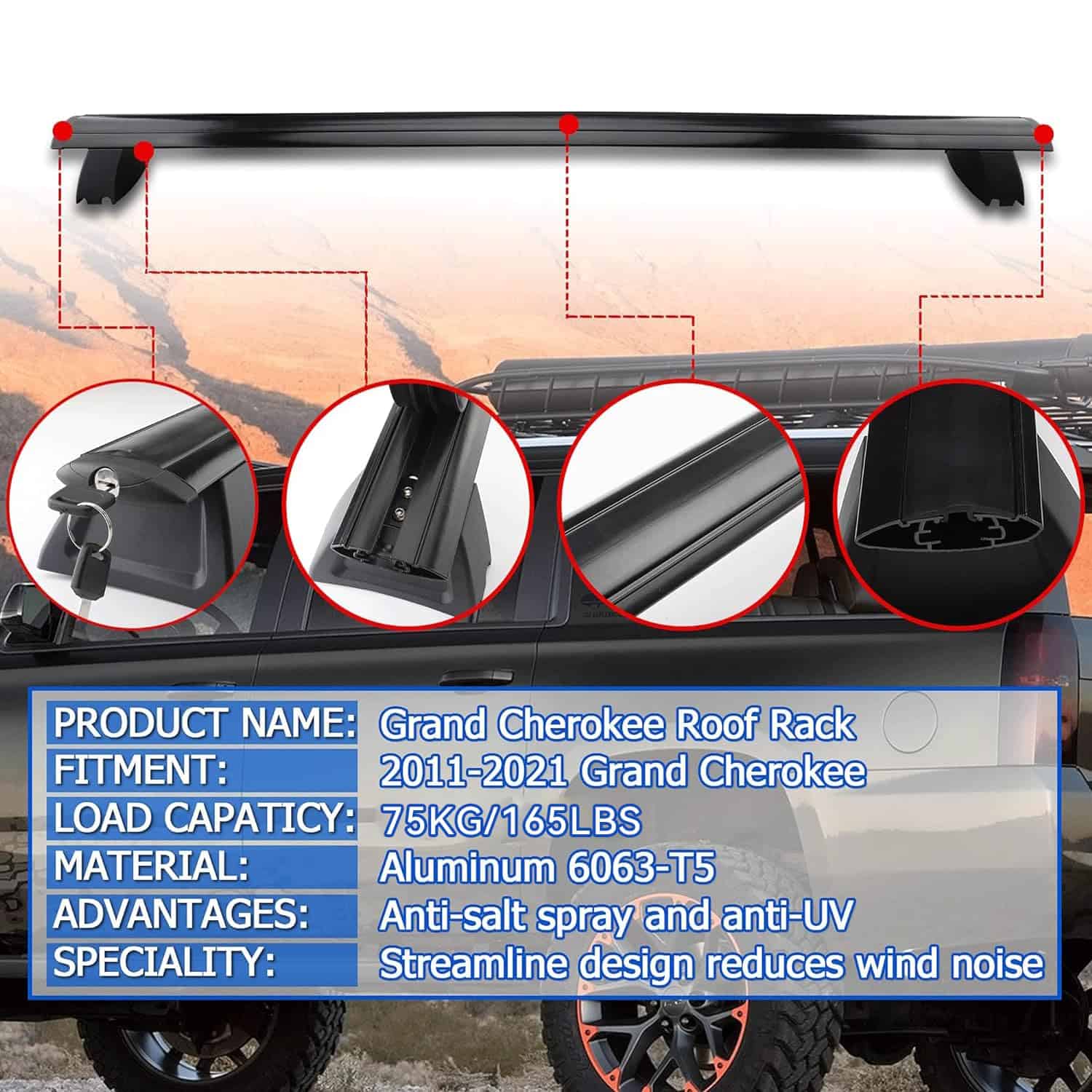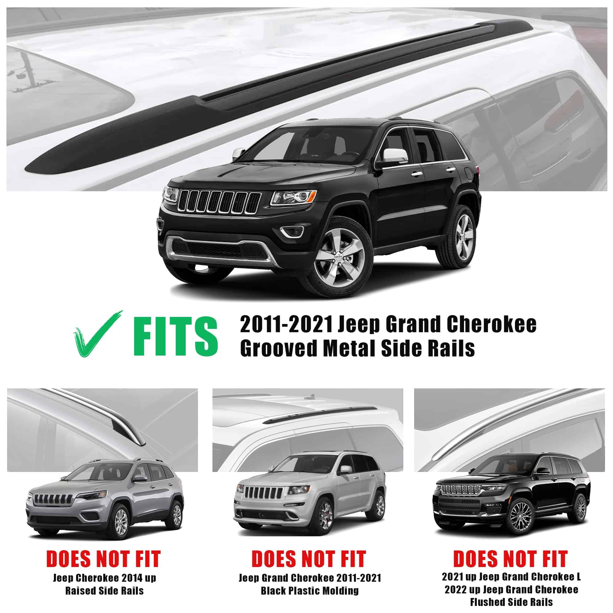 1. Aplicación adecuada: Compatible con Grand Cherokee 2011-2021 con rieles laterales estriados (Apto para modelos Limited, Overland, Upland, Trailhawk, Summit, no apto para modelos SRT y Altitude o cualquier otro modelo de Cherokee).