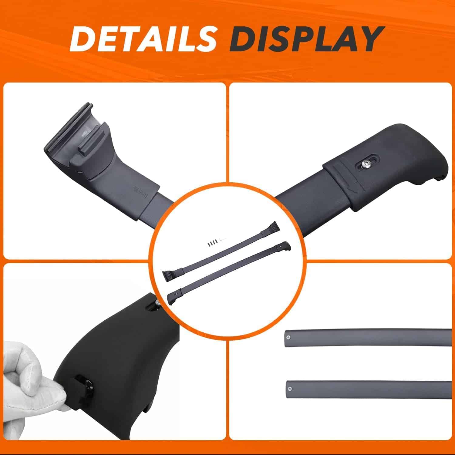 2. Material: Más ventajas que el OEM. Hecho de aleación de aluminio de alta calidad, mayor resistencia y mejor durabilidad. El diseño de perfil bajo y aerodinámico lo hace eficaz para reducir el ruido del viento al conducir a alta velocidad.