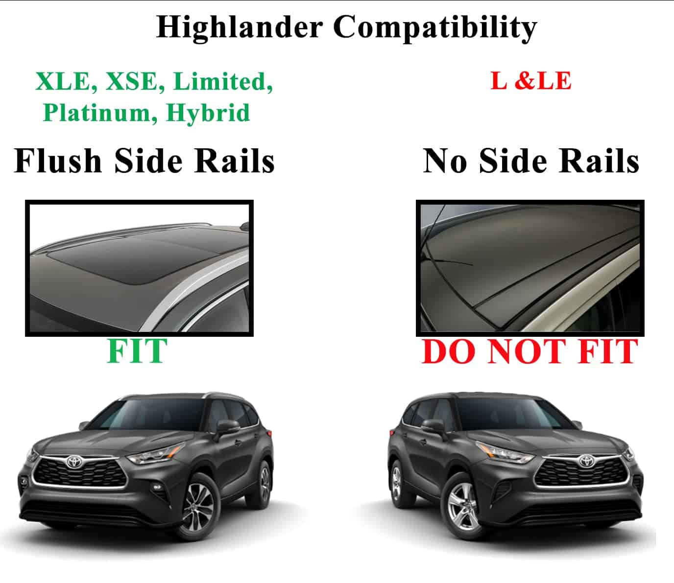 Las barras transversales para el techo de BrightLines se ajustan a los modelos Toyota Highlander XLE XSE Limited y Platinum que están equipados con rieles laterales para el techo. Las barras transversales para el techo también se adaptan a sus versiones híbridas. Las rejillas para el techo no encajan en los modelos L LE.