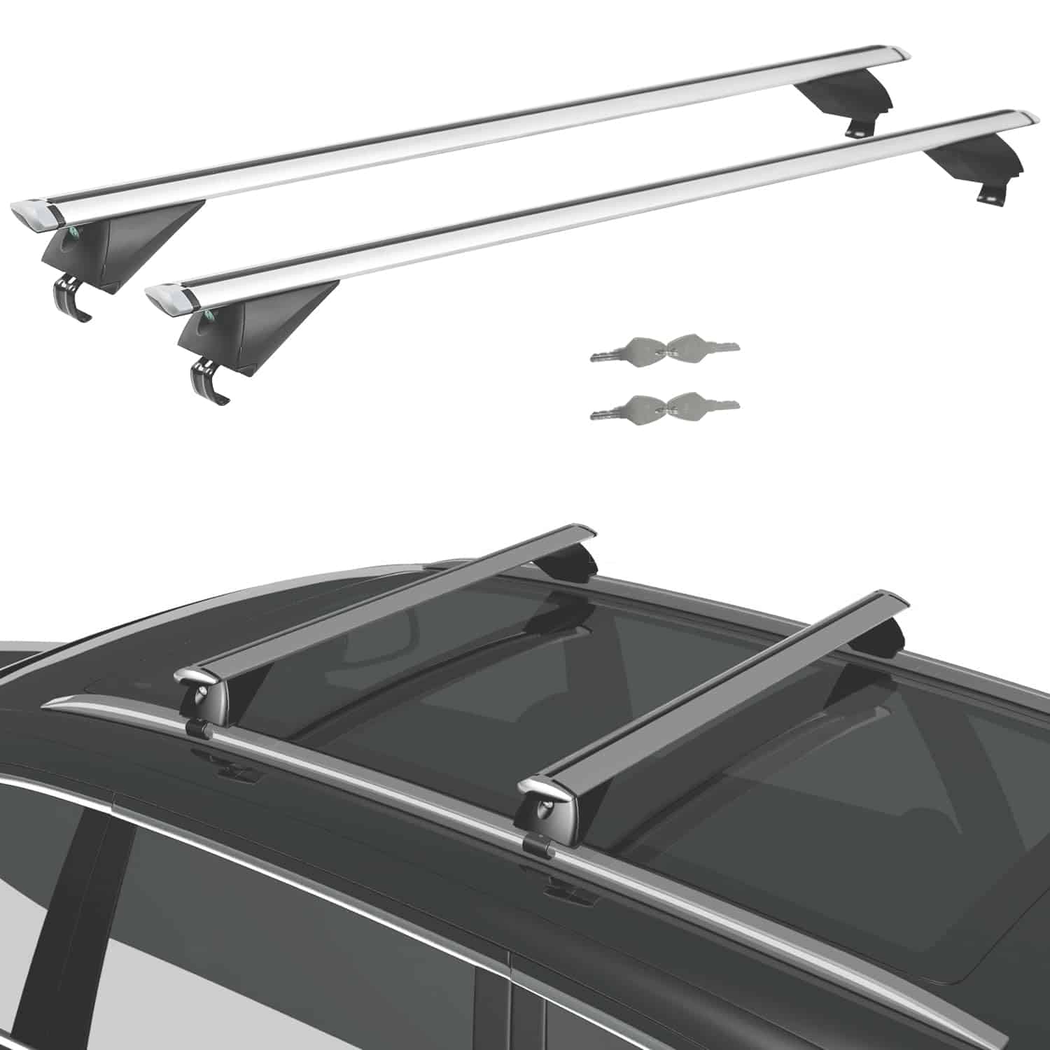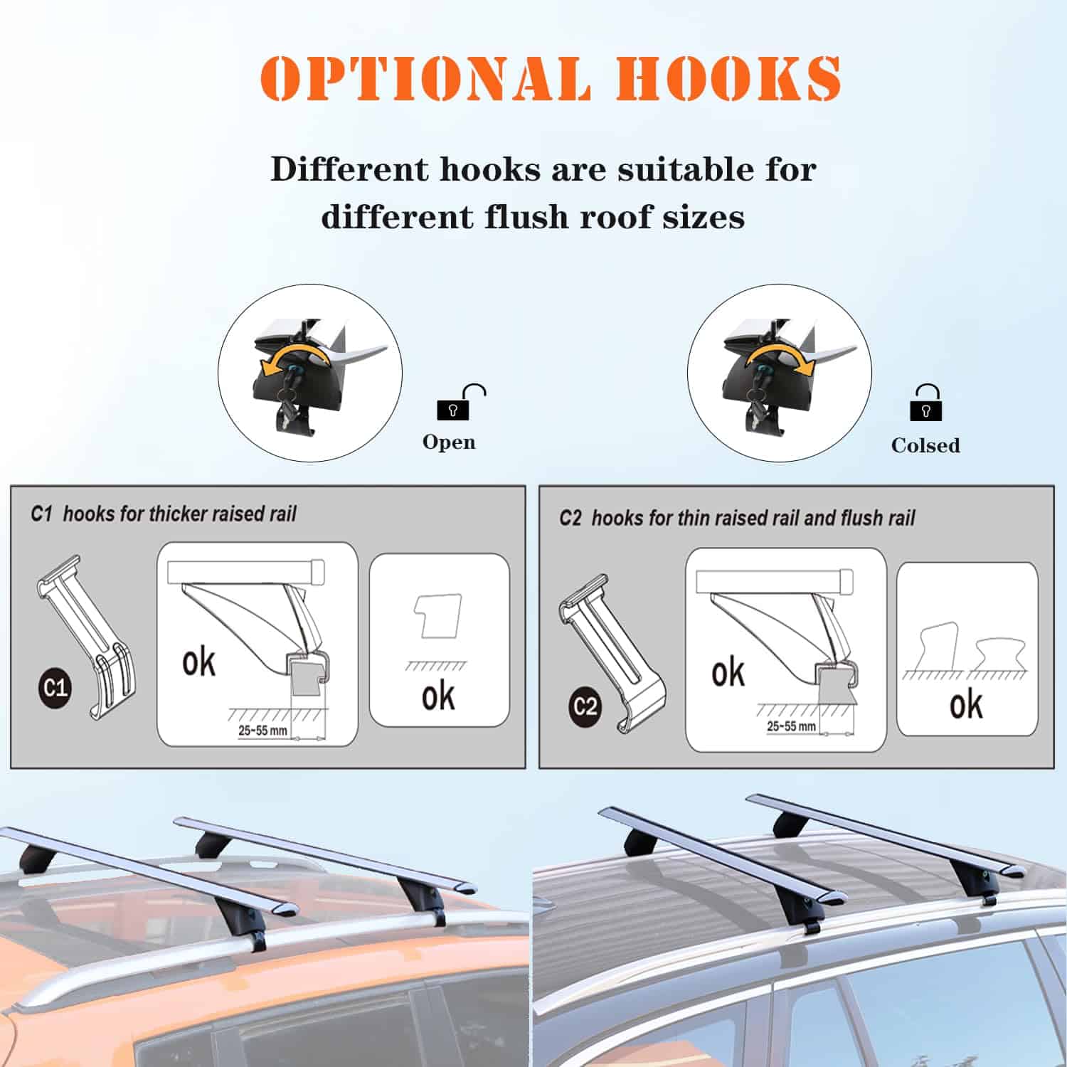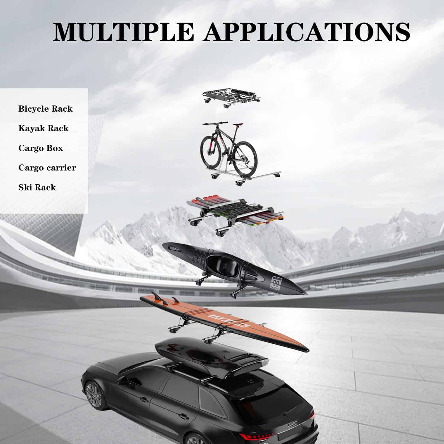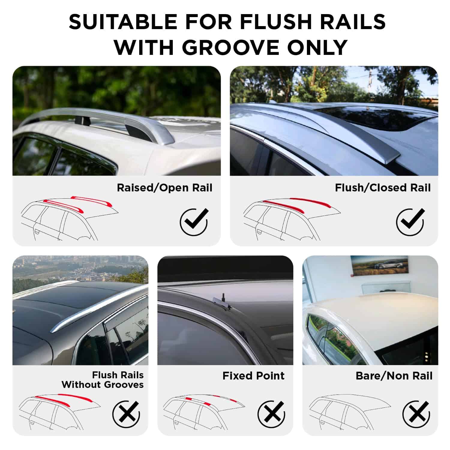 1. Alta Compatibilidad – Nuestras barras transversales universales para el techo se adaptan a la mayoría de los techos de coches con barras laterales elevadas y barras laterales montadas en ras, excepto techos sin barras, techos ras sin ranuras y techos con puntos fijos. Por favor, verifique el techo de su coche antes de la compra.