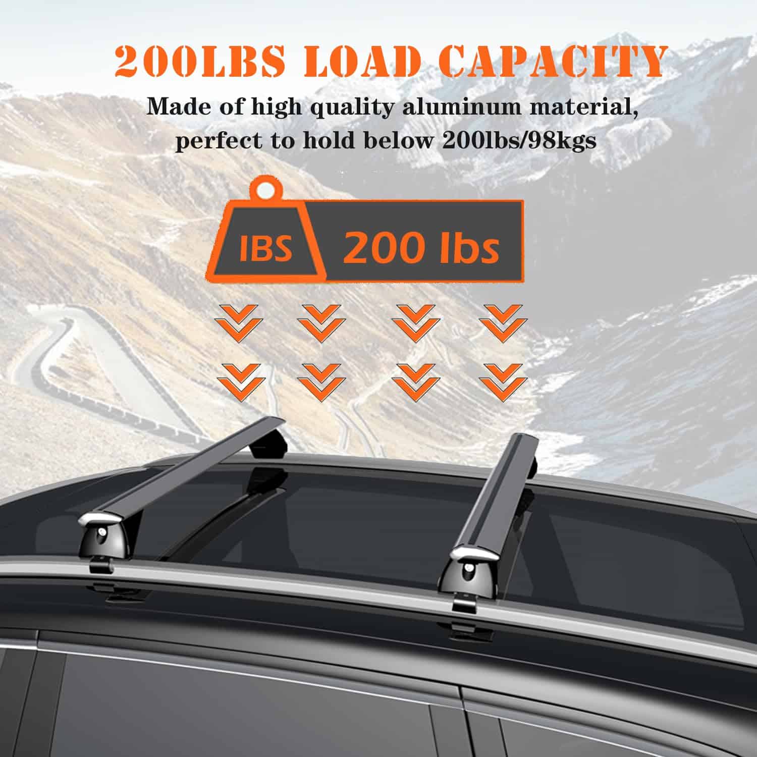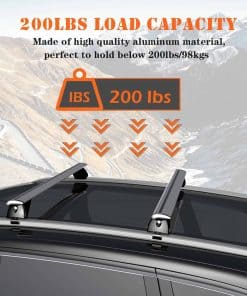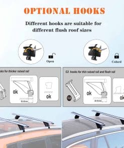 4. Materiales de Alta Calidad – Esta barras para el techo está hecha de aleación de aluminio de alta calidad, que es muy ligera. Sin embargo, puede soportar un peso de hasta 200 libras y viene con un gancho grande y uno pequeño para adaptarse a más tipos de techos de vehículos.