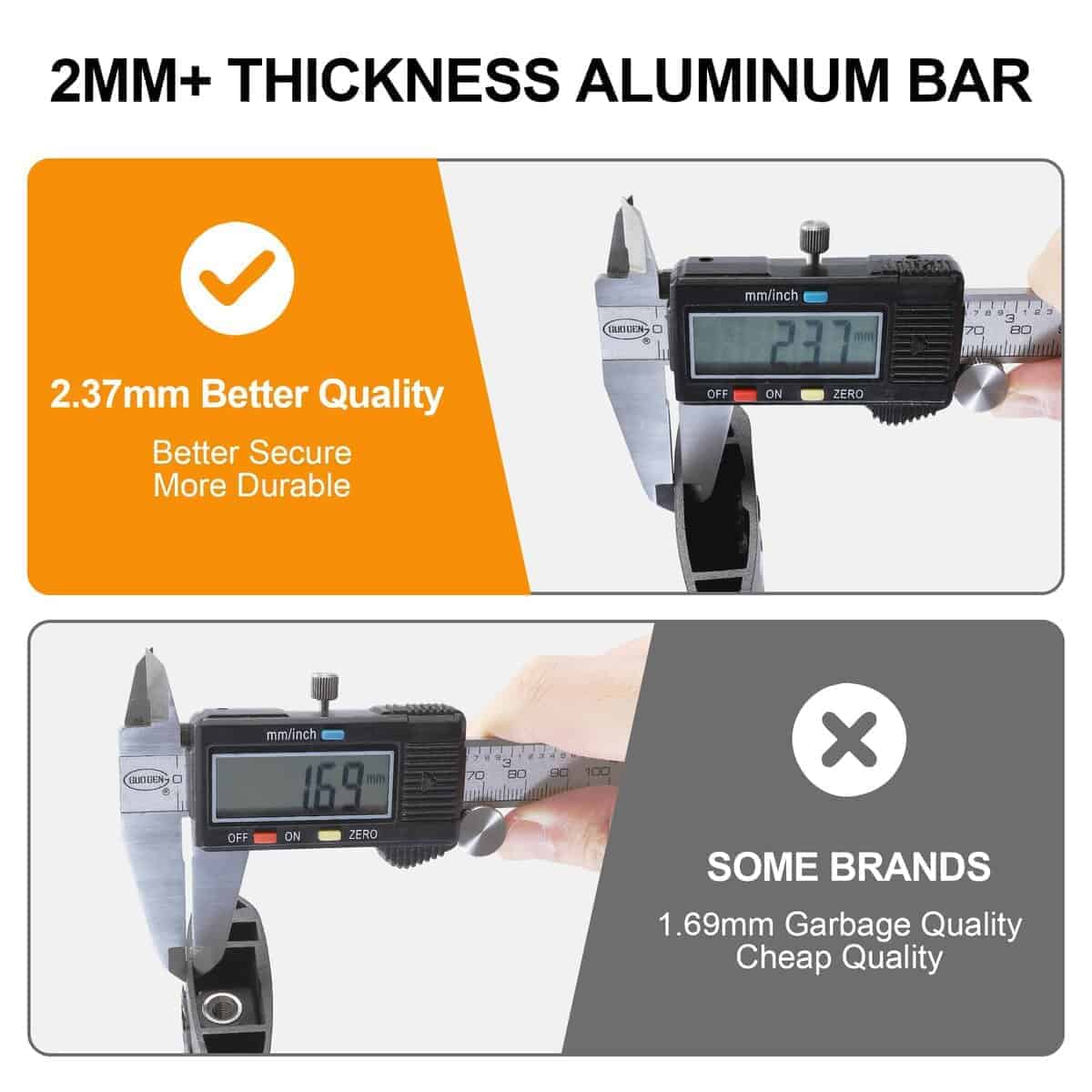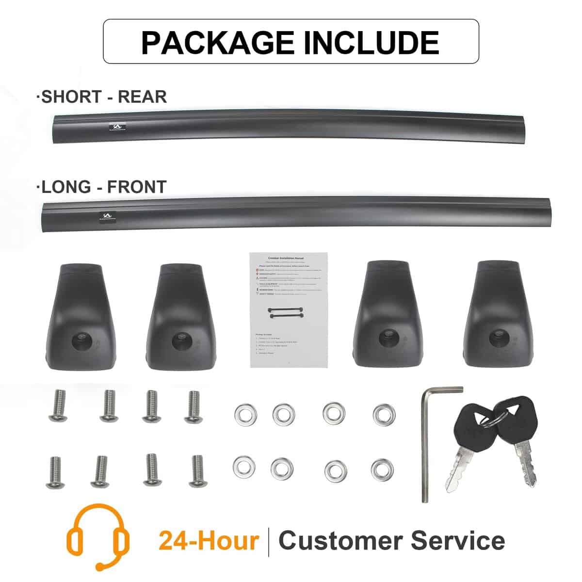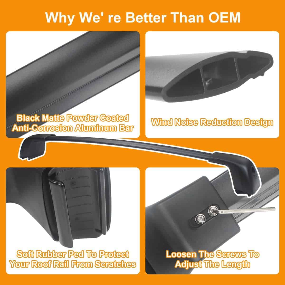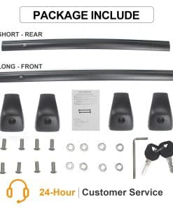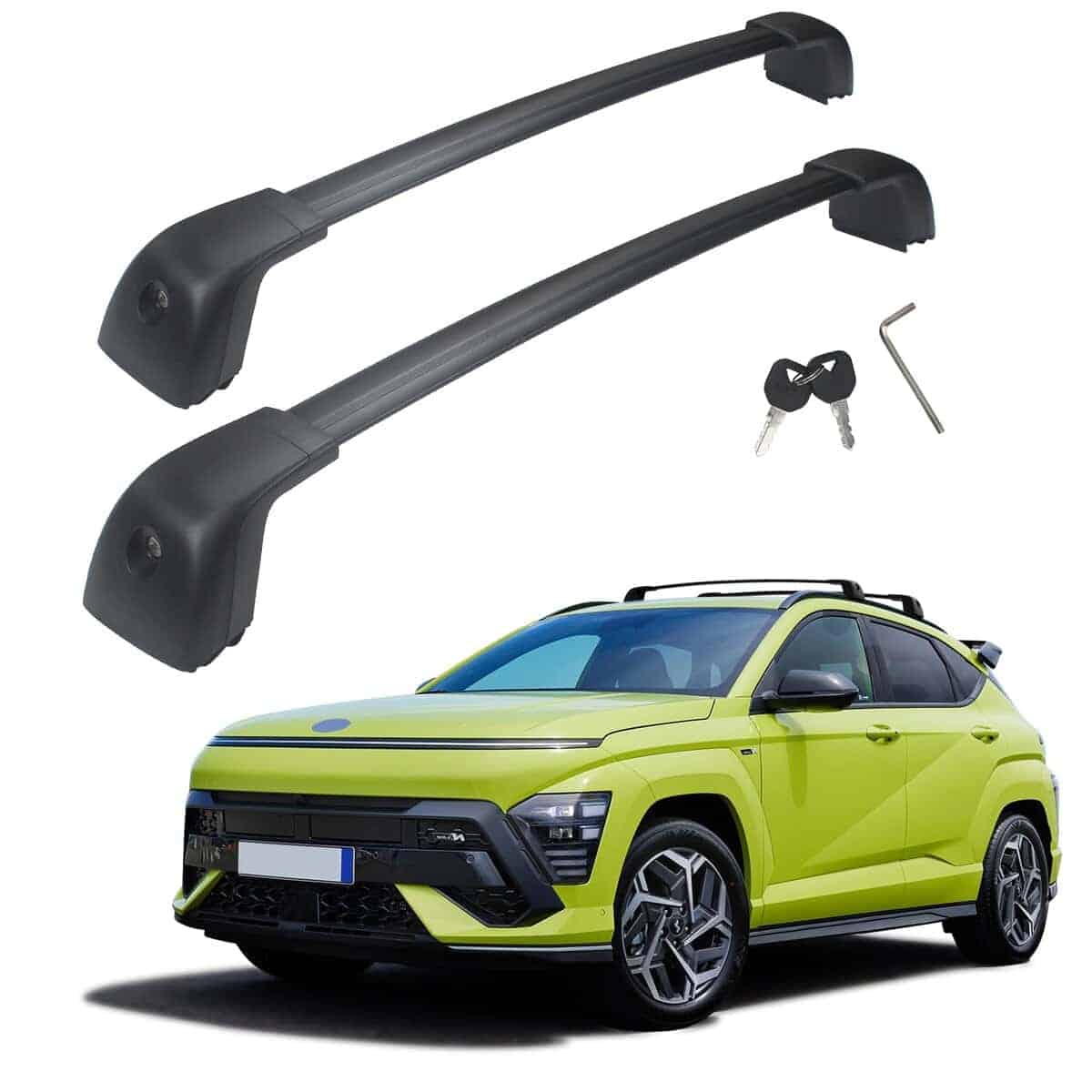 Barras transversales de techo Autekcomma de repuesto para Hyundai Kona SEL Plus/Limited/Ultimate 2018-2022 fabricadas en aluminio de aeronave en color negro mate. Estas barras aerodinámicas se ajustan fácilmente a los rieles de techo estándar de los modelos Hyundai Kona SEL PLUS/LIMITED/ULTIMATE 2018-2024 sin necesidad de ninguna modificación. La construcción duradera de aluminio combinada con almohadillas antideslizantes bloqueables antirrobo garantiza la seguridad de la carga al mantenerla en su lugar sin riesgo de balanceo o desplazamiento durante el viaje. La instalación es sencilla y sin herramientas, ya que los pies de montaje rápido se enganchan de forma segura en los rieles de techo en cuestión de minutos. Estas barras livianas a la vez que resistentes facilitan el transporte de equipos sin sobrecargar su vehículo. El diseño de perfil bajo y aerodinámico minimiza el ruido del viento y mejora la eficiencia del combustible en comparación con los contenedores montados en el techo. Con una capacidad de carga máxima de hasta 260 lb, estas barras transversales para portaequipajes ofrecen una solución segura y conveniente para transportar sus pertenencias con tranquilidad en su vehículo Hyundai Kona.