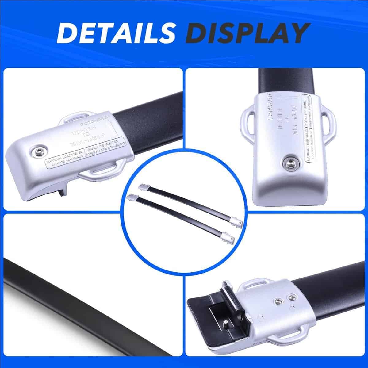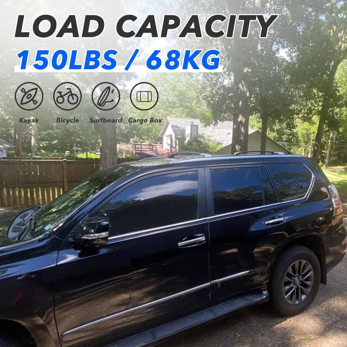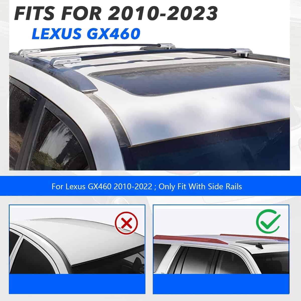 Barras transversales para portaequipajes del techo compatibles con Lexus GX460 2010-2023. Hechas de aleación de aluminio de alta calidad que proporcionan una capacidad de carga robusta. La instalación es sencilla y se incluyen piezas de instalación para montarlas en los rieles laterales de fábrica sin necesidad de realizar modificaciones. La barra delantera es ligeramente más larga que la trasera para adaptarse al tamaño del vehículo. Es importante mencionar que estas barras no son compatibles con el modelo nuevo de Lexus GX 460 2017. Asegúrate de verificar la compatibilidad con tu vehículo antes de realizar la compra.