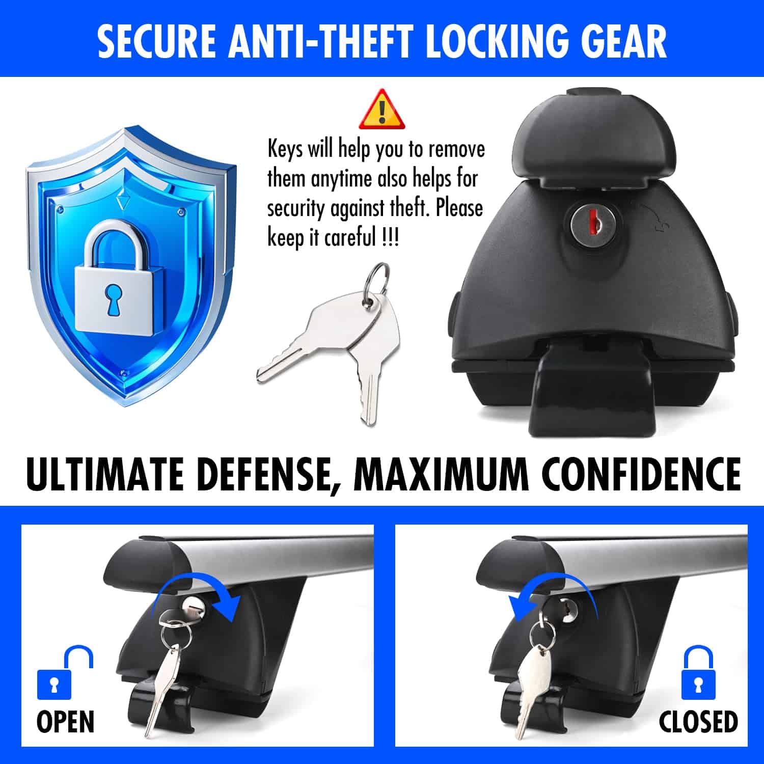 3. FÁCIL DE INSTALAR: Cada juego de barras transversales para rack de techo viene con las herramientas de instalación necesarias, no es necesario ensamblar, consulte las instrucciones o nuestro video de instalación para completar rápidamente la instalación y la remoción. ¡Es muy conveniente para ti! Nuestras barras transversales para rack de techo vienen con un sistema de bloqueo antirrobo y dos llaves. Una vez bloqueado, permanece estable y seguro.