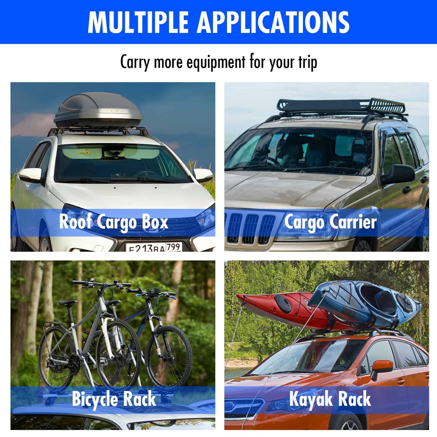 2. BARRAS TRANSVERSALES DE ALUMINIO AERO: El rack de techo para coche está hecho de aluminio ligero en su totalidad, lo que no será voluminoso y tiene una capacidad de carga de 200 lbs. al mismo tiempo. La conexión entre las barras transversales del rack de techo y el coche está hecha de plástico de alta calidad, que no solo es resistente, sino que tampoco dañará el coche.