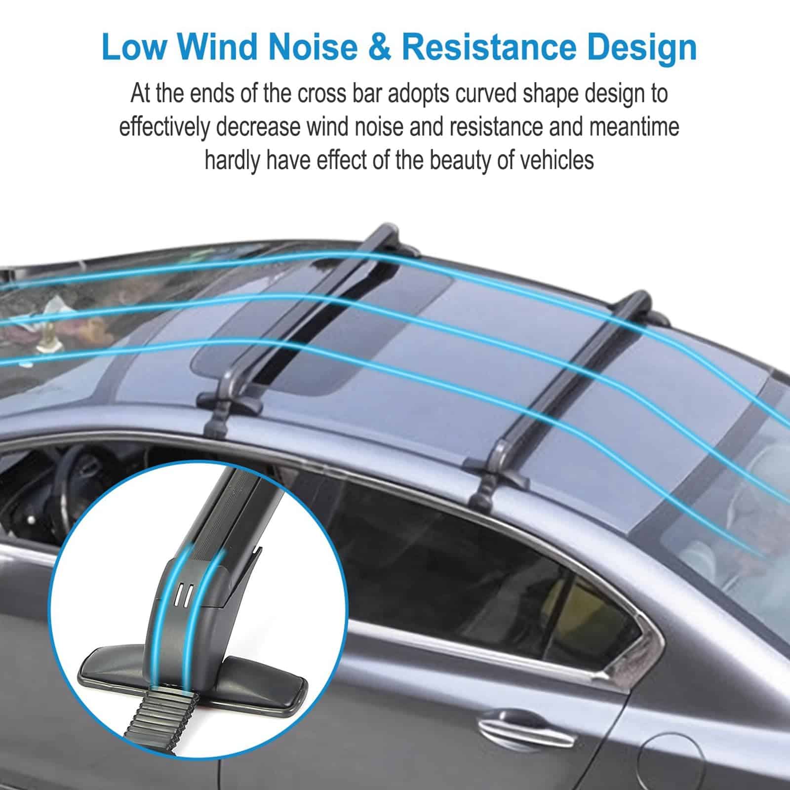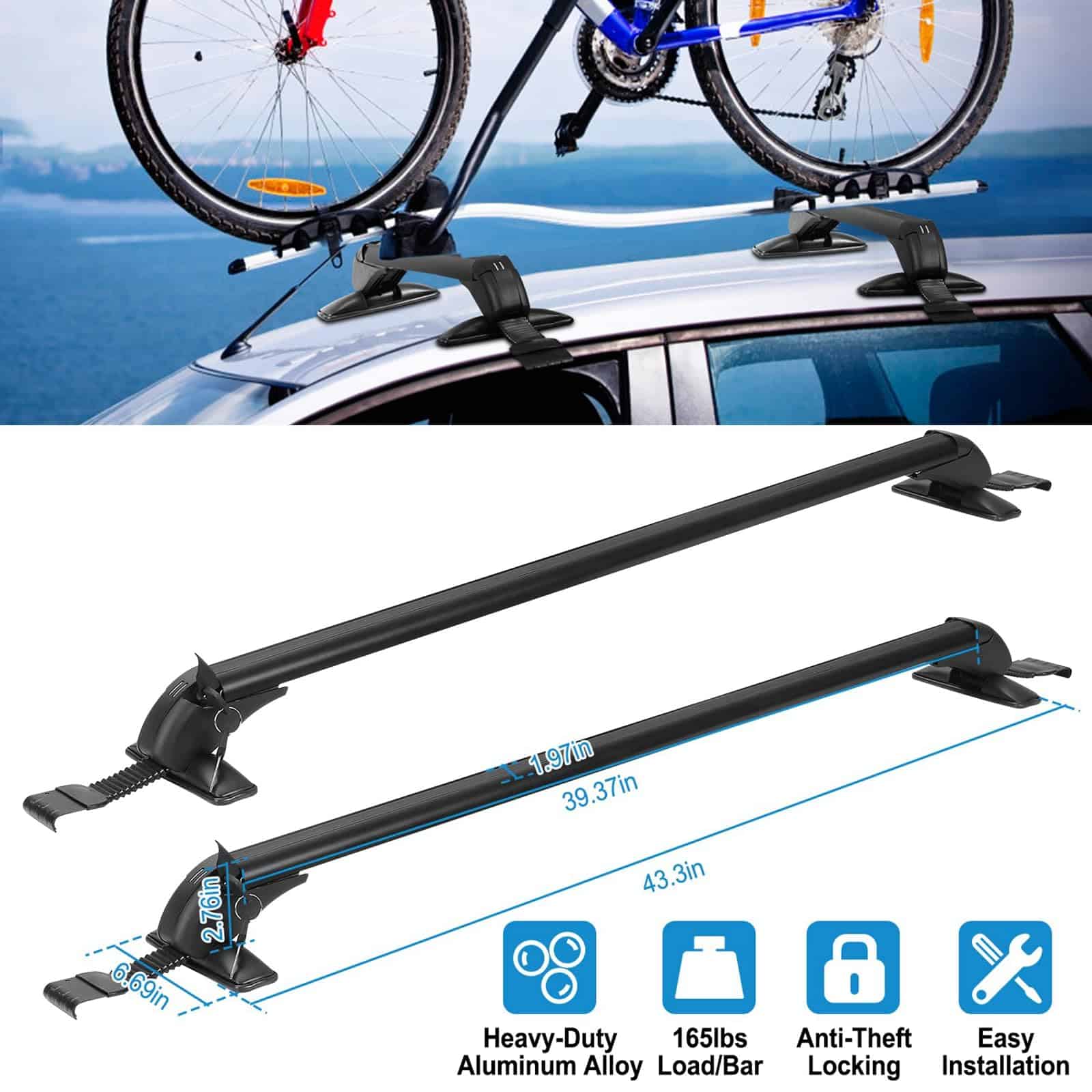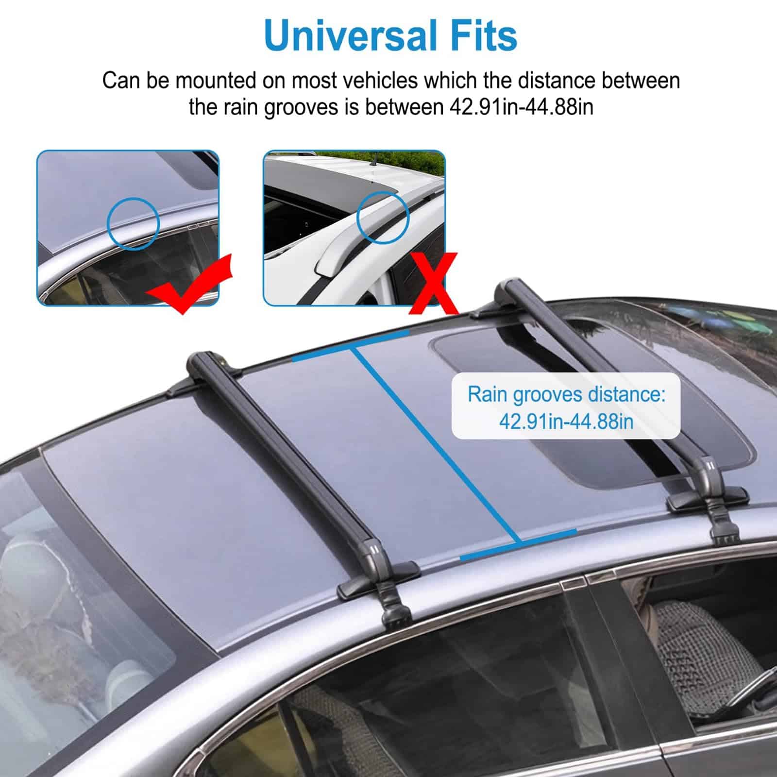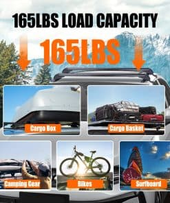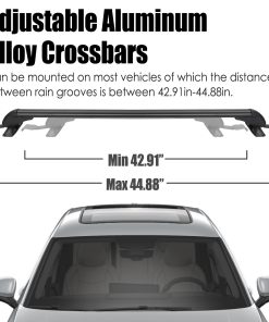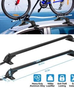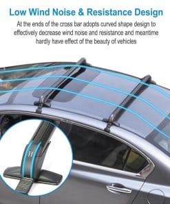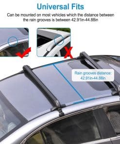 1. BARRAS TRANSVERSALES PARA TECHO UNIVERSALES: Se pueden montar en la mayoría de los vehículos en los que la distancia entre las acanaladuras de la lluvia es de entre 109 cm-114 cm / 42.91 pulgadas-44.88 pulgadas para transportar soportes de bicicletas, kayak, marcos de carga, cajas de carga, snowboard, tabla de surf, etc. Por favor, confirme cuidadosamente si las opciones que ha seleccionado coinciden con su vehículo antes de comprar. n2. CONSTRUCCIÓN DE SERVICIO PESADO: Hecho de materiales de aleación de aluminio ligeros y de alta resistencia, la barra transversal para el techo no será voluminosa y tiene una capacidad de carga de 165 libras, permitiéndole llevar varios objetos a cualquier lugar, ya sea un kayak, canoas, tablas de surf, snowboards, sup, escaleras, portabultos, bicicleta de montaña o esquís. Nuestro porta equipaje puede soportar condiciones meteorológicas severas. Es una elección perfecta para sus actividades al aire libre. n3. DISEÑO DE BLOQUEO ANTIRROBO: Cada barra transversal viene con un bloqueo antirrobo para garantizar la seguridad de la barra transversal y viene con una cubierta duradera de ABS para proteger la cerradura de las inclemencias del tiempo. Una vez bloqueado, permanece firme y seguro. n4. DISEÑO EXTERIOR DE BAJO RUIDO Y RESISTENCIA AL VIENTO: En los extremos de la barra transversal adopta un diseño de forma curva para disminuir efectivamente el ruido y la resistencia al viento y al mismo tiempo apenas tener efecto sobre la belleza de los vehículos. n5. FÁCIL DE INSTALAR: Bien equipado con accesorios de montaje que incluyen soportes base premium, ganchos, almohadillas de goma premium, abrazaderas de acero inoxidable y manual de instalación para ayudarlo a completar la instalación de la barra transversal. Solo se ajusta a vehículos con techo liso. No es compatible con autos con rieles.