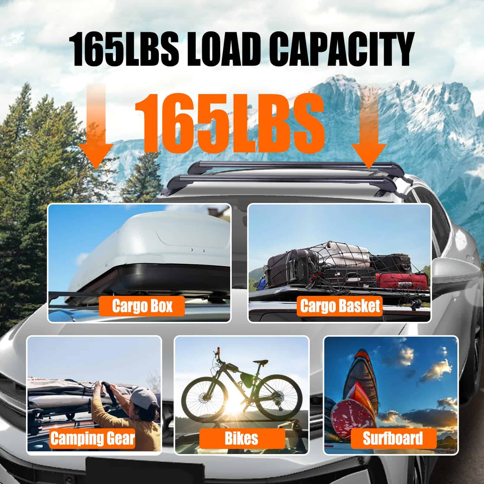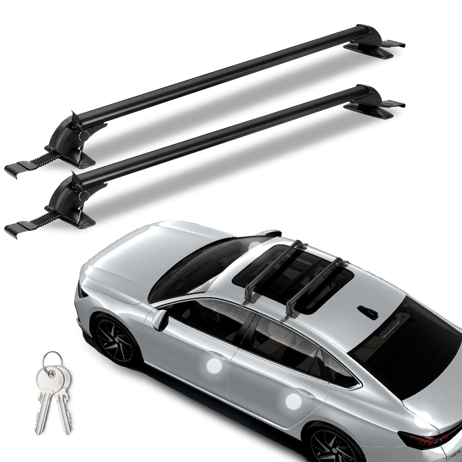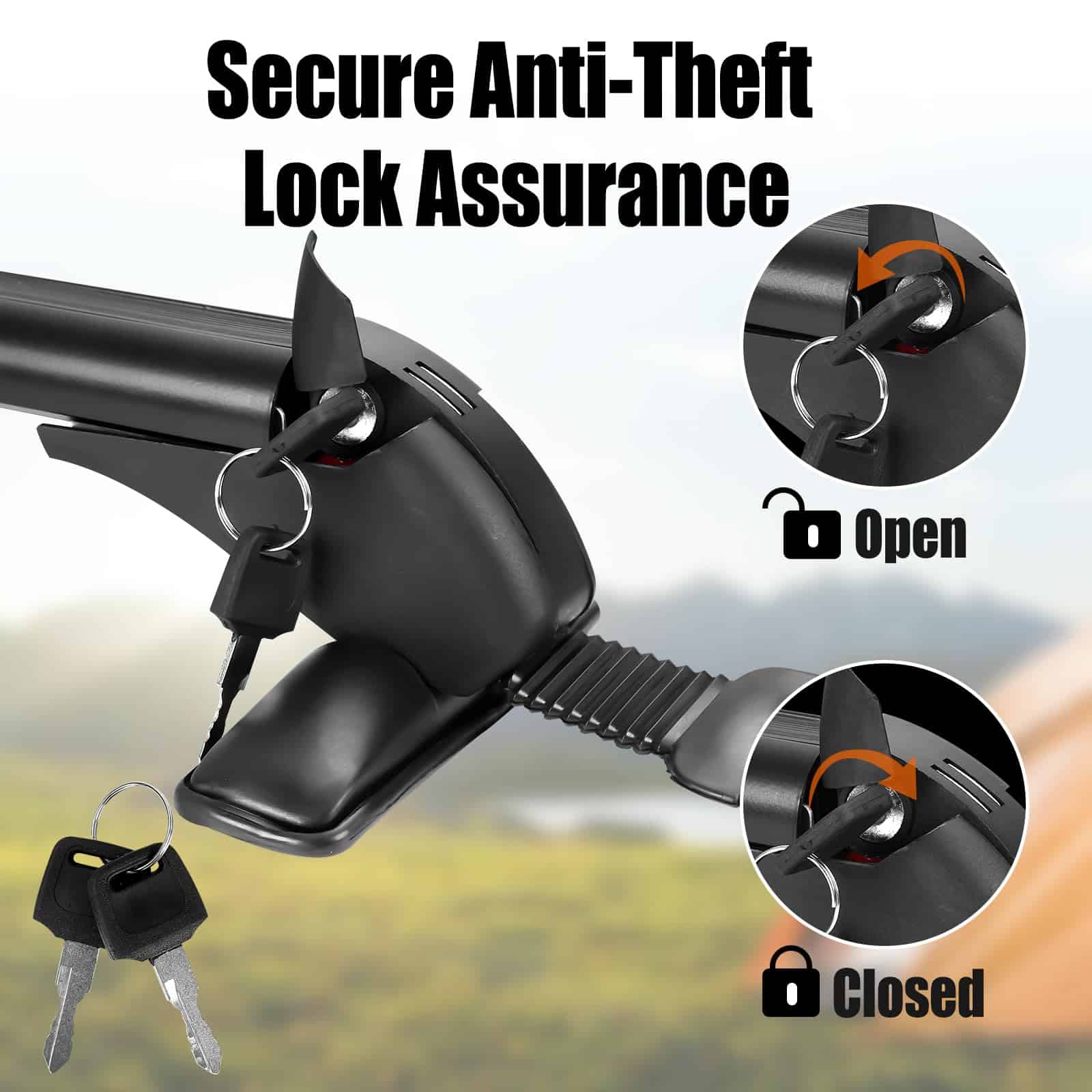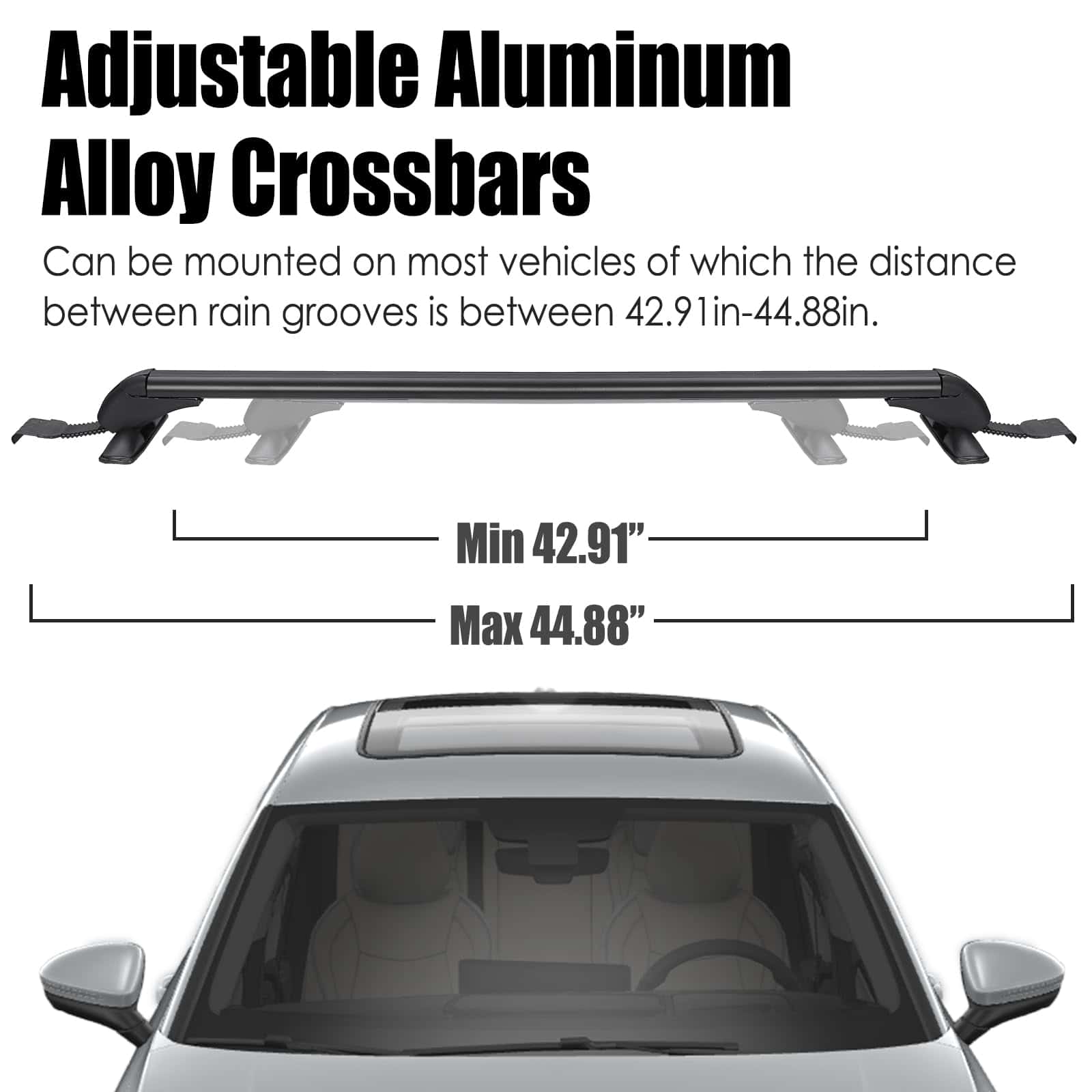 1. BARRAS TRANSVERSALES PARA TECHO UNIVERSALES: Se pueden montar en la mayoría de los vehículos en los que la distancia entre las acanaladuras de la lluvia es de entre 109 cm-114 cm / 42.91 pulgadas-44.88 pulgadas para transportar soportes de bicicletas, kayak, marcos de carga, cajas de carga, snowboard, tabla de surf, etc. Por favor, confirme cuidadosamente si las opciones que ha seleccionado coinciden con su vehículo antes de comprar. n2. CONSTRUCCIÓN DE SERVICIO PESADO: Hecho de materiales de aleación de aluminio ligeros y de alta resistencia, la barra transversal para el techo no será voluminosa y tiene una capacidad de carga de 165 libras, permitiéndole llevar varios objetos a cualquier lugar, ya sea un kayak, canoas, tablas de surf, snowboards, sup, escaleras, portabultos, bicicleta de montaña o esquís. Nuestro porta equipaje puede soportar condiciones meteorológicas severas. Es una elección perfecta para sus actividades al aire libre. n3. DISEÑO DE BLOQUEO ANTIRROBO: Cada barra transversal viene con un bloqueo antirrobo para garantizar la seguridad de la barra transversal y viene con una cubierta duradera de ABS para proteger la cerradura de las inclemencias del tiempo. Una vez bloqueado, permanece firme y seguro. n4. DISEÑO EXTERIOR DE BAJO RUIDO Y RESISTENCIA AL VIENTO: En los extremos de la barra transversal adopta un diseño de forma curva para disminuir efectivamente el ruido y la resistencia al viento y al mismo tiempo apenas tener efecto sobre la belleza de los vehículos. n5. FÁCIL DE INSTALAR: Bien equipado con accesorios de montaje que incluyen soportes base premium, ganchos, almohadillas de goma premium, abrazaderas de acero inoxidable y manual de instalación para ayudarlo a completar la instalación de la barra transversal. Solo se ajusta a vehículos con techo liso. No es compatible con autos con rieles.