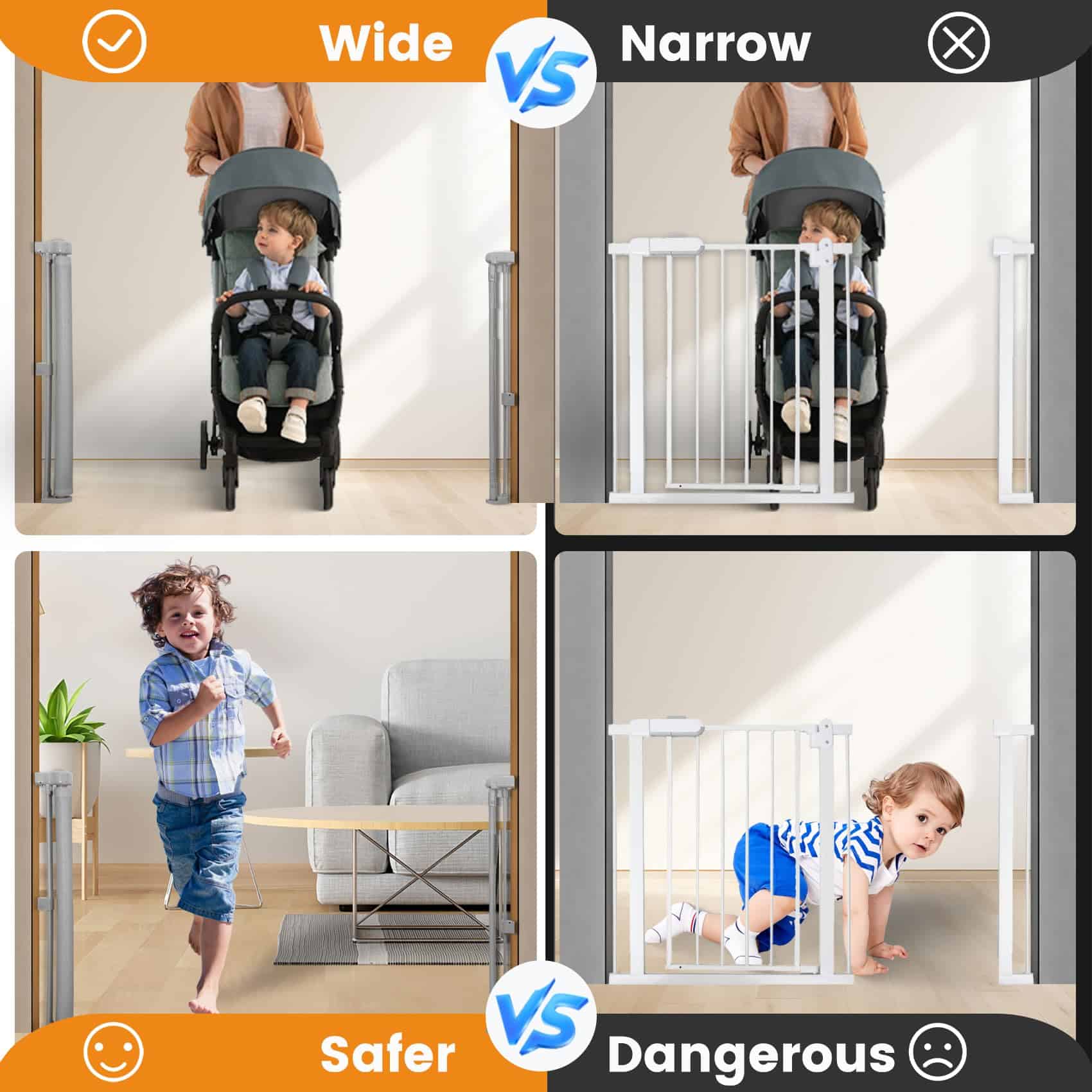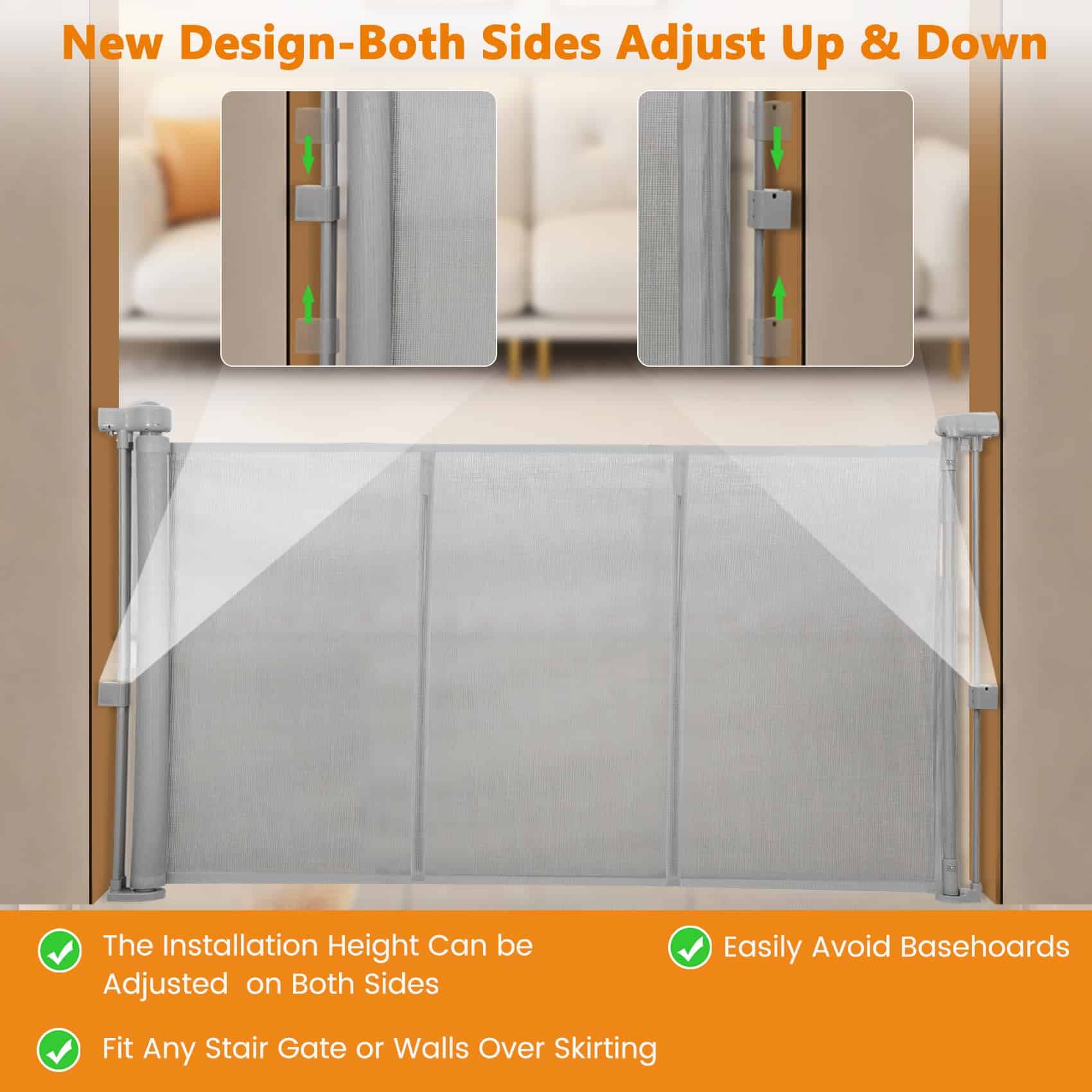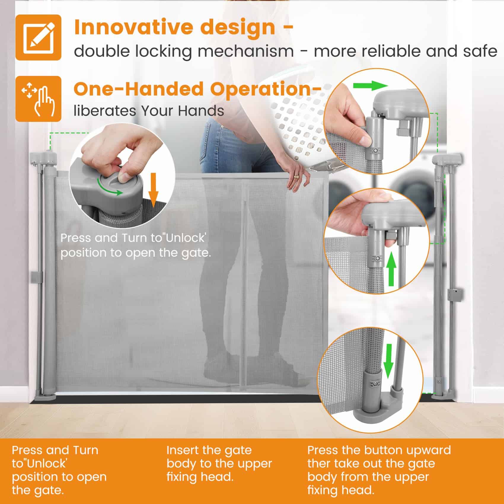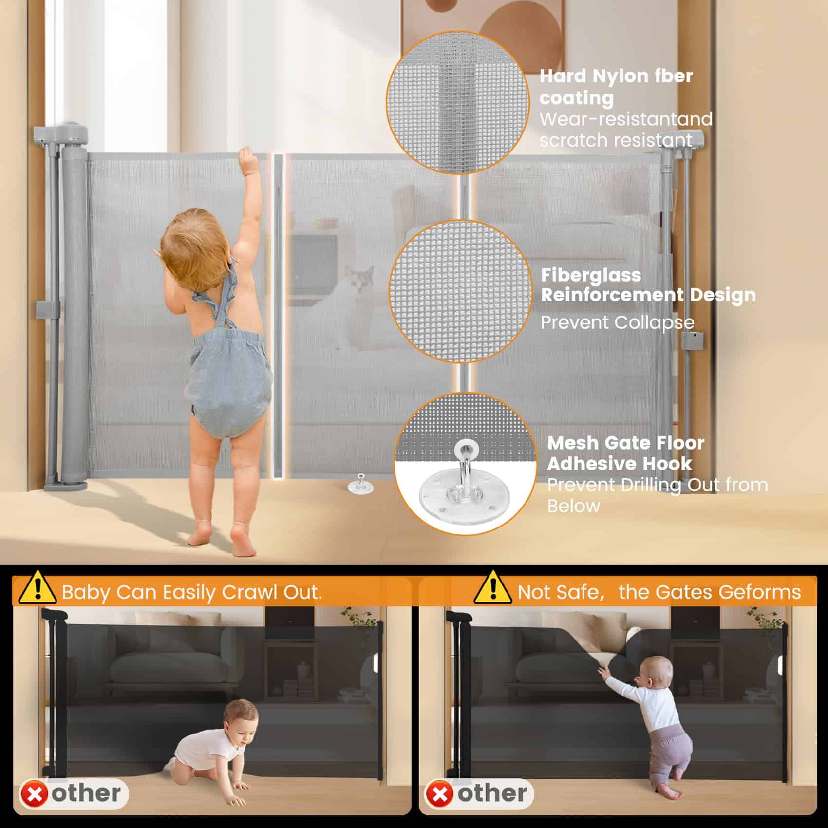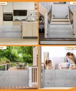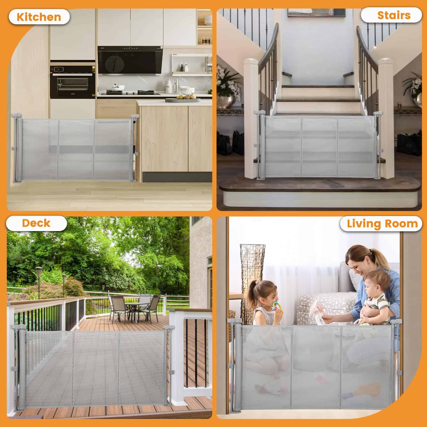 El diseño retráctil que ahorra espacio de esta barrera es perfecto para hogares modernos. No solo proporciona una barrera física para evitar el acceso a áreas restringidas, sino que también transforma tu espacio vital utilizando eficientemente la habitación disponible. Cuando no está en uso, simplemente enrolla la barrera para reclamar tu espacio sin obstrucciones.