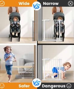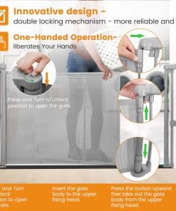La instalación es muy sencilla con nuestras instrucciones completas y video de instalación. La anchura ajustable de la barrera de 59-71-120-150-200 pulgadas y altura de 35 pulgadas permite una instalación versátil en una variedad de espacios, incluyendo escaleras, puertas, pasillos, interiores y exteriores. El diseño innovador permite una fácil operación con una sola mano, brindándote la libertad de moverte sin problemas.