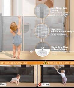 Descansa tranquilo sabiendo que nuestra barrera cumple o supera las normas de seguridad ASTM o EN, ofreciendo tranquilidad para ti y tu familia. Actualiza la seguridad de tu hogar con nuestra Barrera de seguridad retráctil para bebés, la combinación perfecta de funcionalidad, seguridad y estilo.