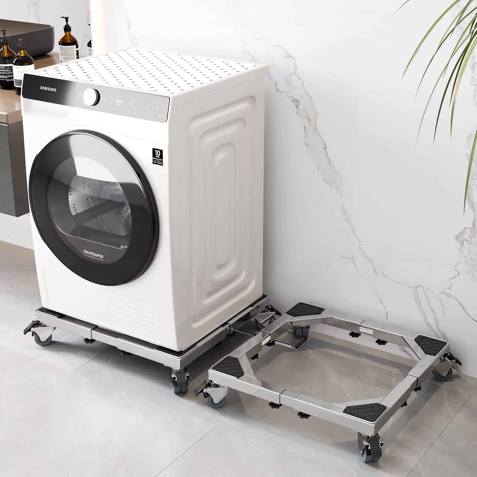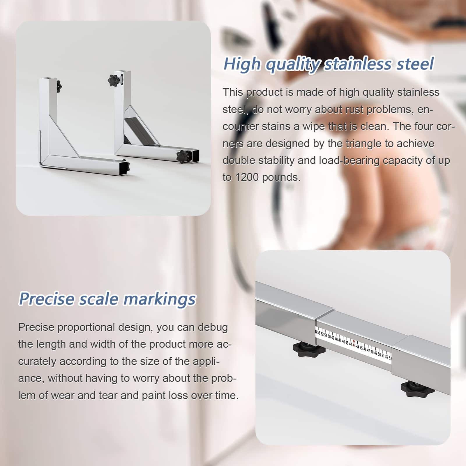 Base de Acero Inoxidable Resistente con Ruedas para Refrigerador Móvil, Soporte de Lavadora con Ruedas, Dolly Ajustable para Lavadora, Refrigerador y Secadora. La base de acero pesado para lavadora y refrigerador es resistente y puede durar 100 años. Esta base móvil se puede ajustar desde 16 pulgadas hasta 26-3/8 pulgadas. Puede mover fácilmente varios muebles o electrodomésticos en casa. La base para mini refrigerador está equipada con ruedas dobles giratorias bloqueables, y las lavadoras se pueden ubicar y estabilizar fácilmente. El rodillo móvil está hecho de piezas de PVC sólido y varillas de acero inoxidable, con una capacidad de carga de hasta 1200 libras. Nuestro soporte para lavadora está hecho de acero, que puede soportar hasta 1200 libras. La base se puede instalar en solo 2 minutos. Todos los pies y ruedas han sido instalados. Solo necesita instalar el marco y bloquearlo en la posición correcta. Esta base ajustable para lavadora puede ayudarlo a mover y fijar fácilmente electrodomésticos pesados en su hogar y residencia, como mini refrigeradores, lavadoras, refrigeradores, etc.