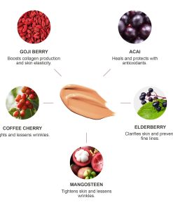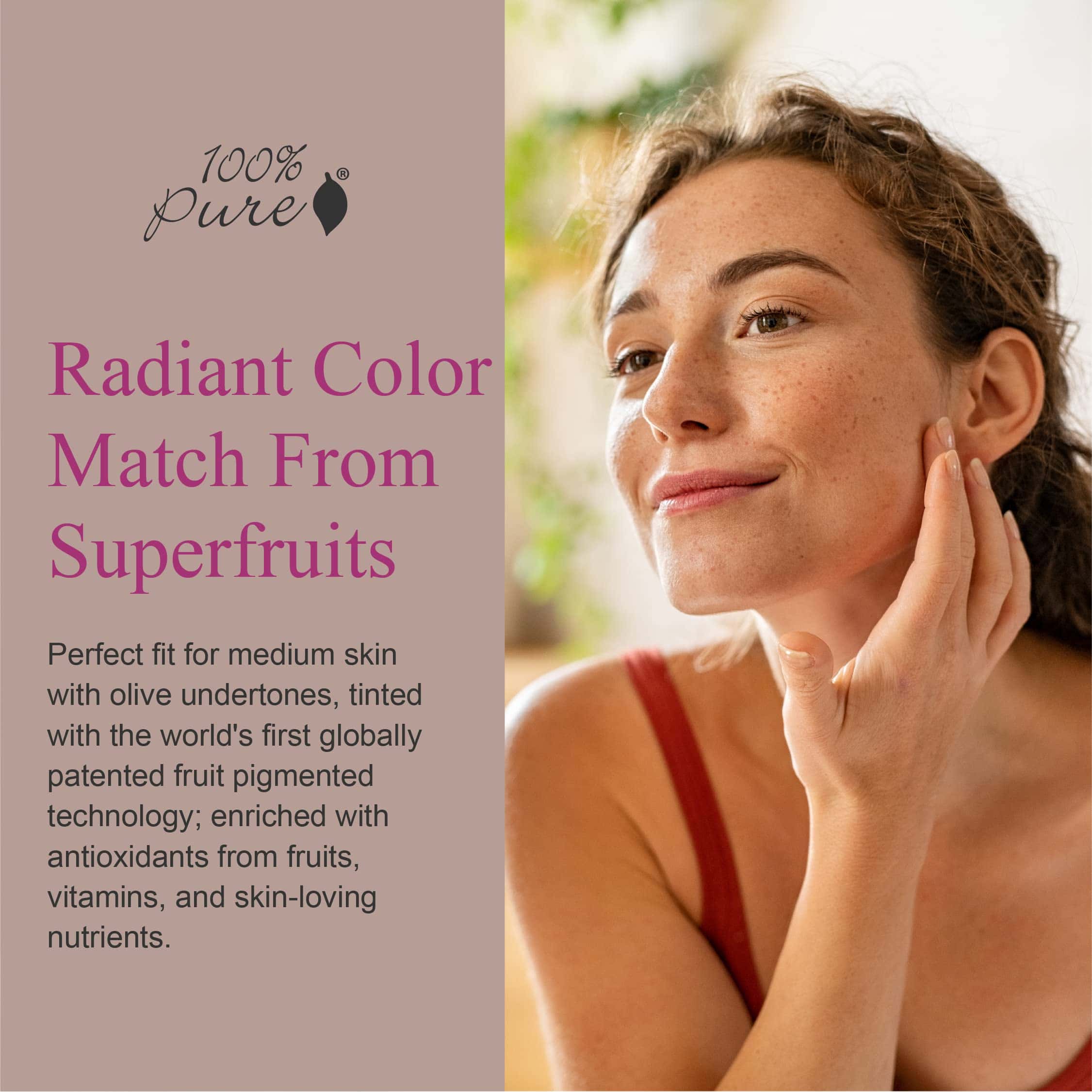 1. COLOR RADIANTE A JUEGO DESDE SUPERFRUTOS – Ajuste perfecto para piel media con subtono oliva, teñido con la tecnología de pigmentos de frutas patentada a nivel mundial; enriquecido con antioxidantes de frutas, vitaminas y nutrientes para la piel.