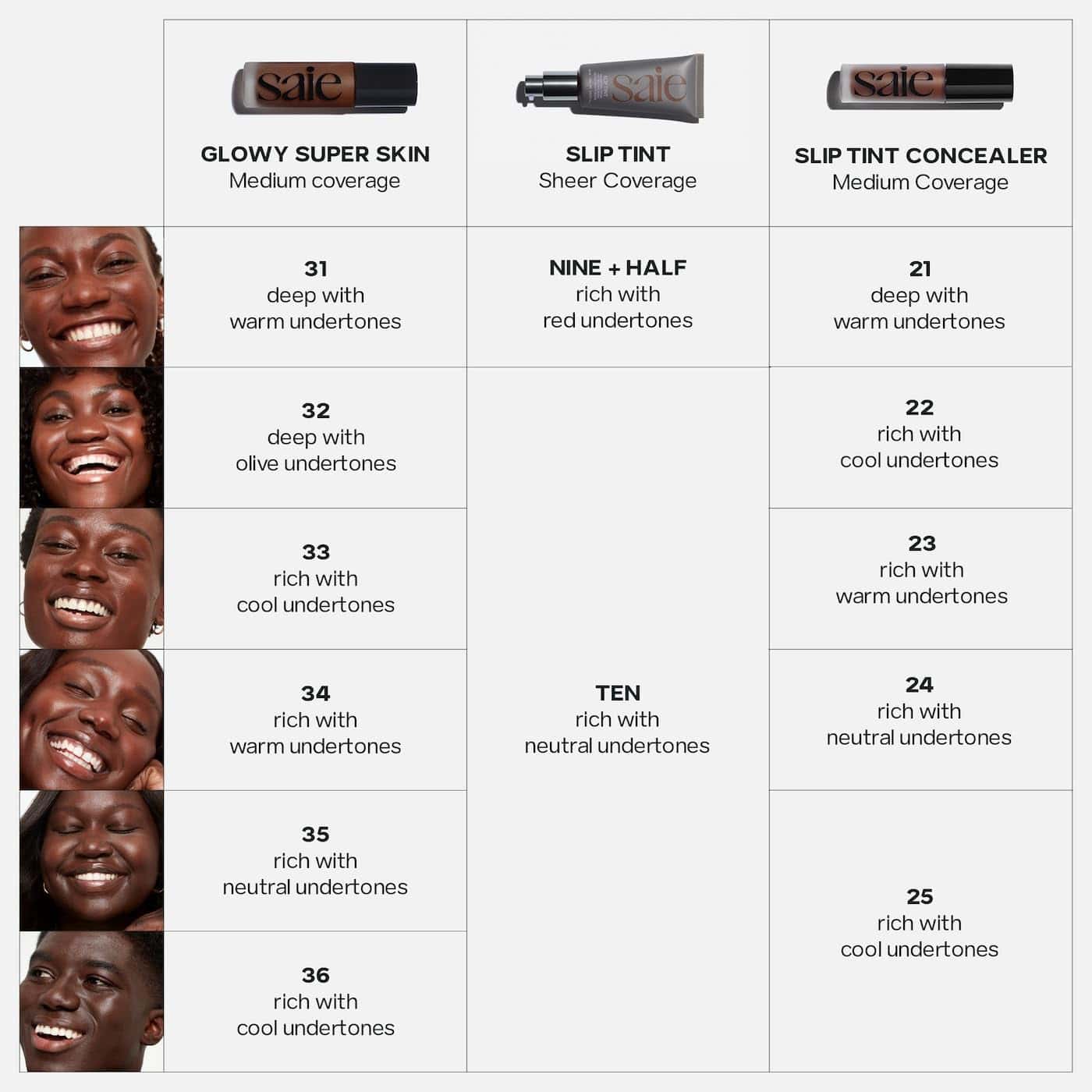 Base de maquillaje ligera que contiene ingredientes potenciados con beneficios para la piel y pigmentos sin peso que se mezclan con la barrera exterior de la piel para obtener un aspecto recién aplicado todo el día. El resultado es una cobertura hidratante y sin peso que te hará olvidar que llevas base de maquillaje. La Squalane derivada del azúcar es ligera y absorbe rápidamente para bloquear la hidratación. El Extracto de Grosella India es rico en antioxidantes que ayudan a iluminar la piel mientras que el Ácido Hialurónico atrae y retiene la humedad para suavizar e hidratar la piel. Los Péptidos de Salvado de Arroz reducen la apariencia de líneas finas y poros mientras ayudan a desvanecer las manchas oscuras e iluminar el tono de la piel. La Glicerina es un ácido graso conocido por aumentar el nivel de humedad natural de la piel. Comienza con un lienzo fresco de piel limpia y preparada. Agita para activar la Base de Maquillaje Saie Glowy Super Skin Tint. La separación es normal debido al 85% de ingredientes para el cuidado de la piel. Calienta 1 bomba en las yemas de los dedos o bombea directamente sobre la Brocha de Base. Presiona en la piel como lo harías con un suero hidratante hasta que esté completamente mezclado. Fija donde sea necesario con Airset usando la Brocha Esponjosa. Disfruta de ese Brillo Característico de SaieGlow™. La Base de Maquillaje Glowy Super Skin es vegana, probada por dermatólogos, segura para piel sensible y sin fragancia.