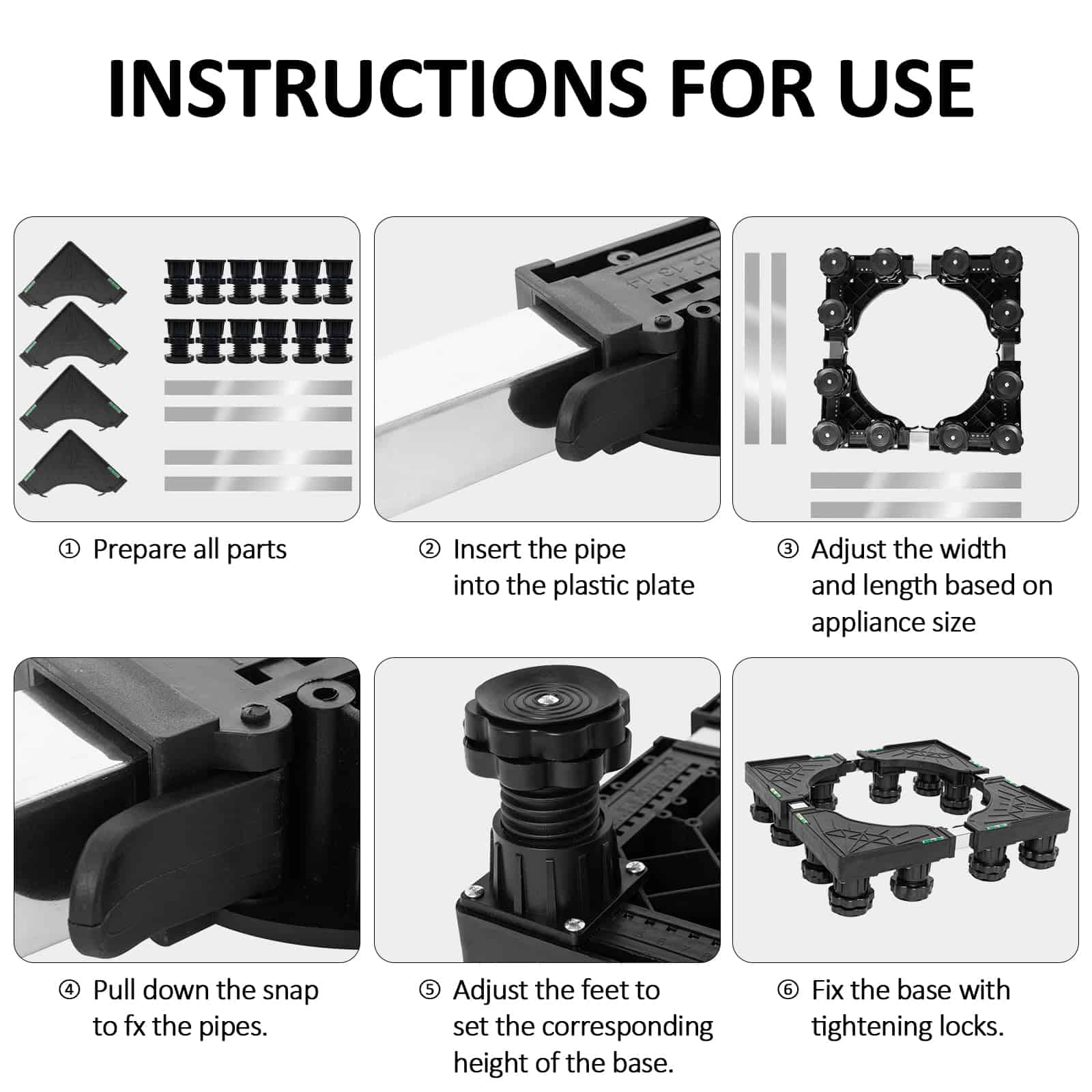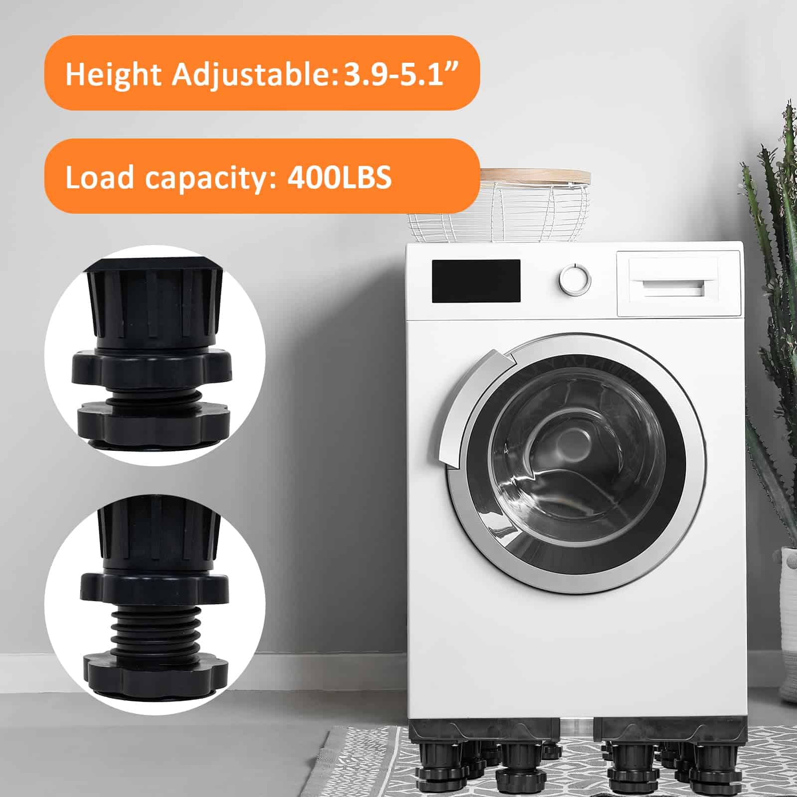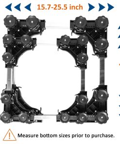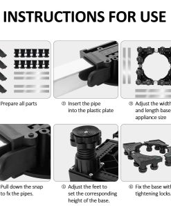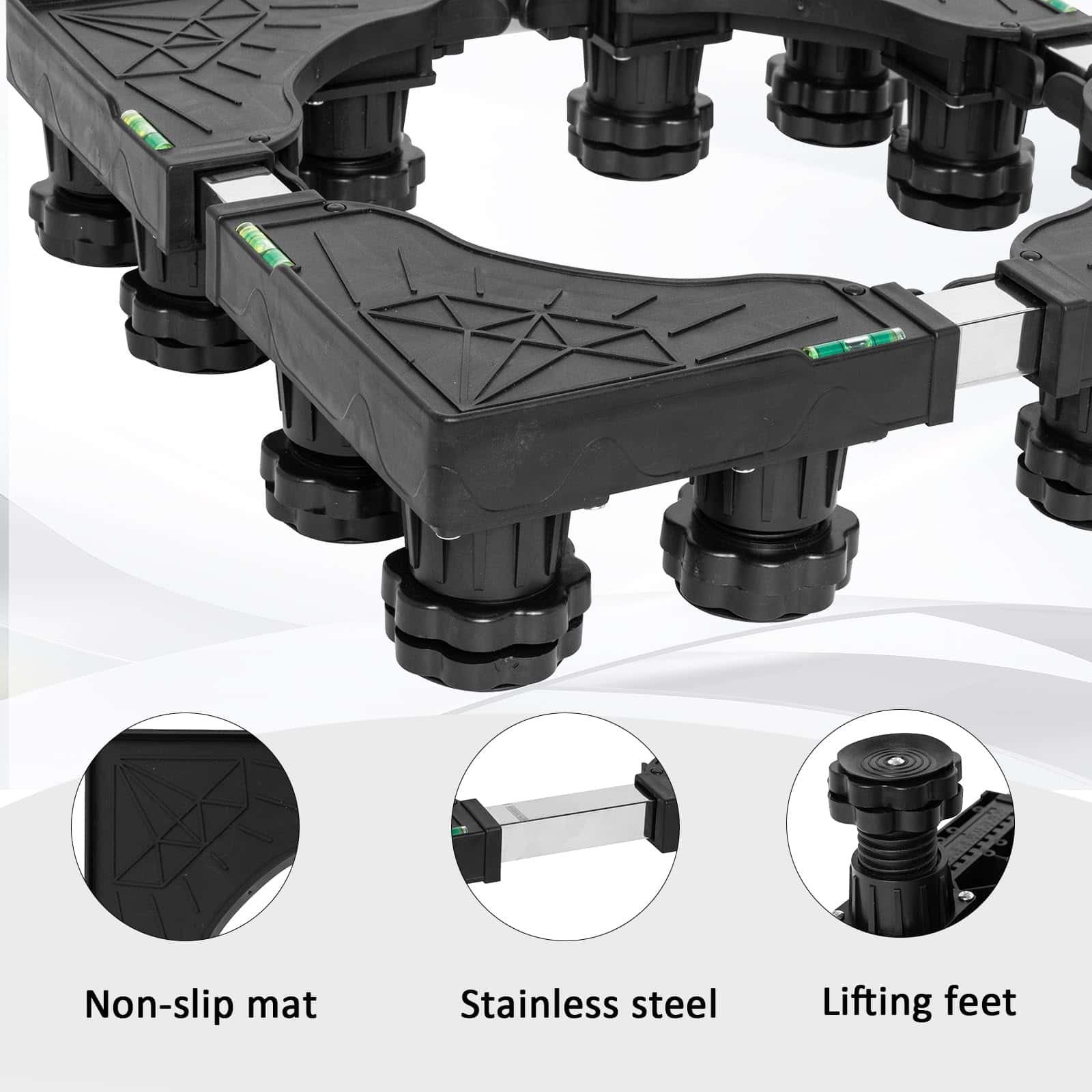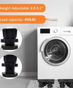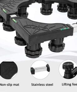 Base de Soporte Ajustable para Refrigerador con 12 Pies Resistentes. Nuestro pedestal para lavadora cuenta con una construcción resistente con una combinación de PVC y acero inoxidable, manejando una capacidad de peso de hasta 400 lbs, asegurando estabilidad y soporte para electrodomésticos pesados como lavadoras, secadoras, refrigeradores, aires acondicionados, congeladores de vino y muebles. Con dimensiones ajustables que van desde 15.7 a 25.5 pulgadas, este soporte elevador para lavadoras se adapta a una amplia gama de electrodomésticos y muebles, convirtiéndolo en una solución versátil para cualquier disposición en el hogar. Los 4 pies de acero inoxidable de la base del soporte son ajustables de 3.9 a 5.1 pulgadas. Este pedestal eleva sus electrodomésticos para un acceso más fácil, minimiza la acumulación de agua y facilita la limpieza, ideal para usar en la lavandería, baño, cocina y sala de estar. Nuestro soporte para refrigerador de ajuste universal cuenta con mats absorbentes de impacto para minimizar eficazmente la vibración de la lavadora o secadora. Los pies están envueltos en material de alta resistencia, reduciendo el ruido y protegiendo el piso y la alfombra. El montaje del pedestal es sin herramientas, con un diseño fácil de usar que no requiere herramientas. El paquete incluye 4 pies fuertes (sin ruedas), 4 varillas de conexión de acero inoxidable, 4 pads antivibración, 4 piezas de esquina de PVC resistente y un manual de instrucciones detallado.