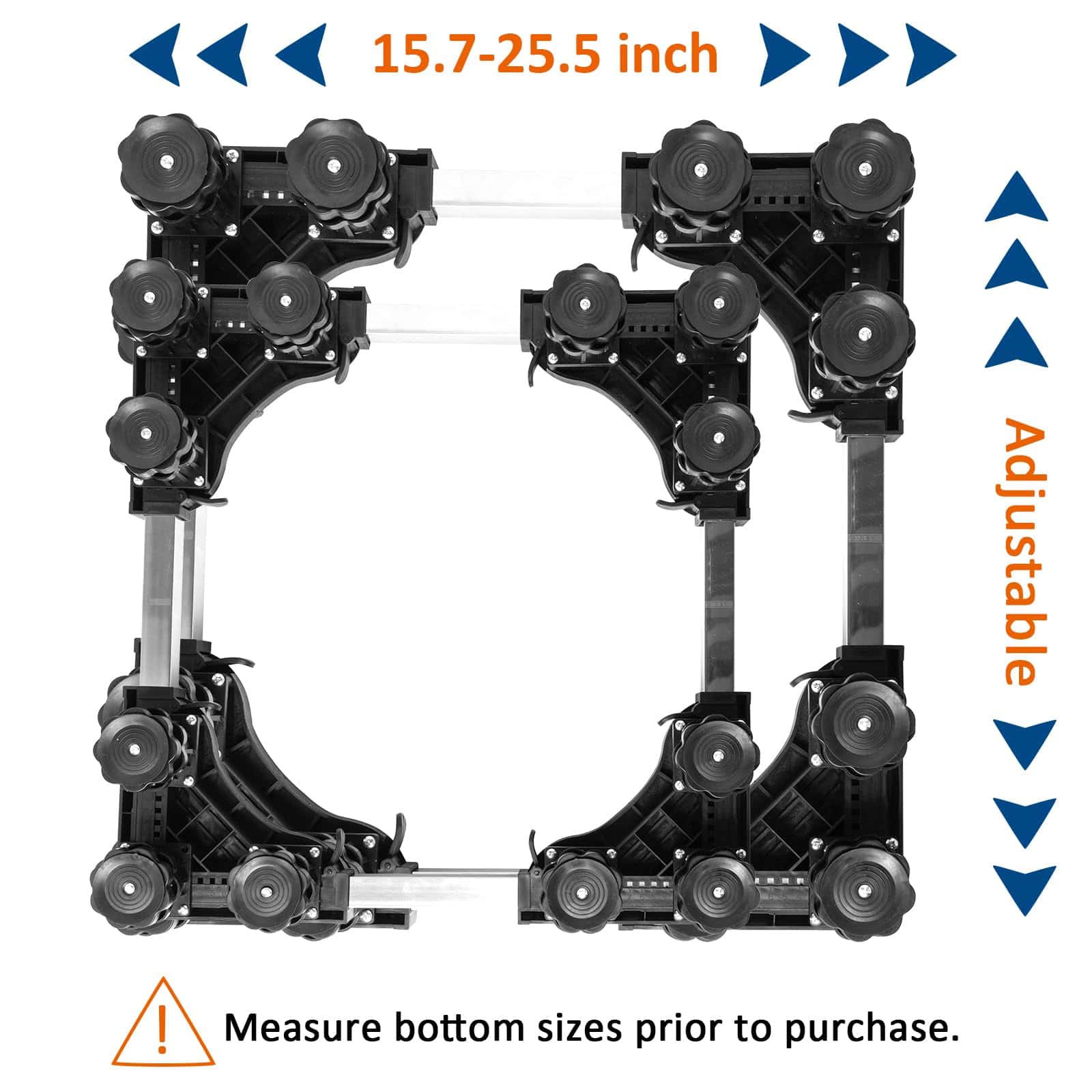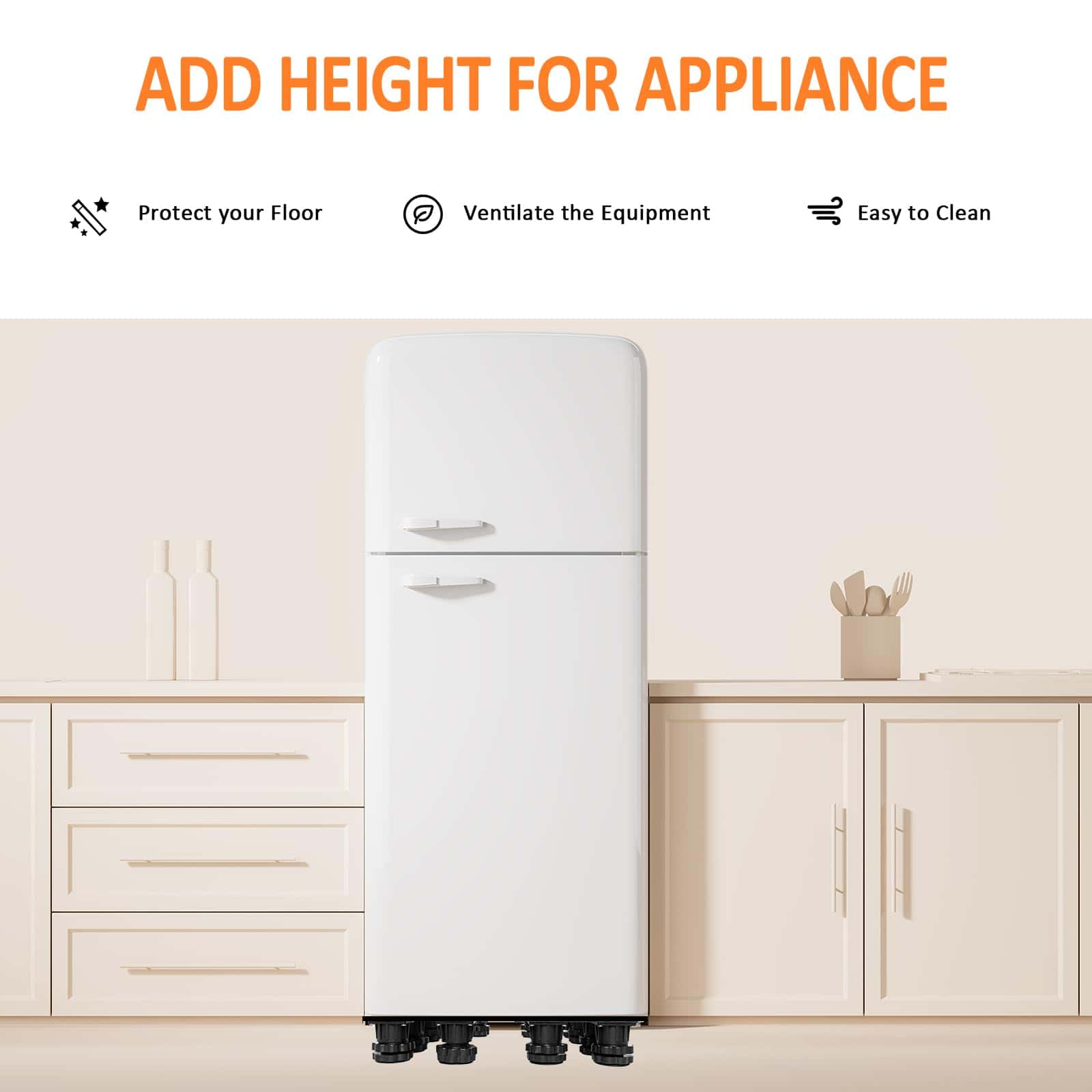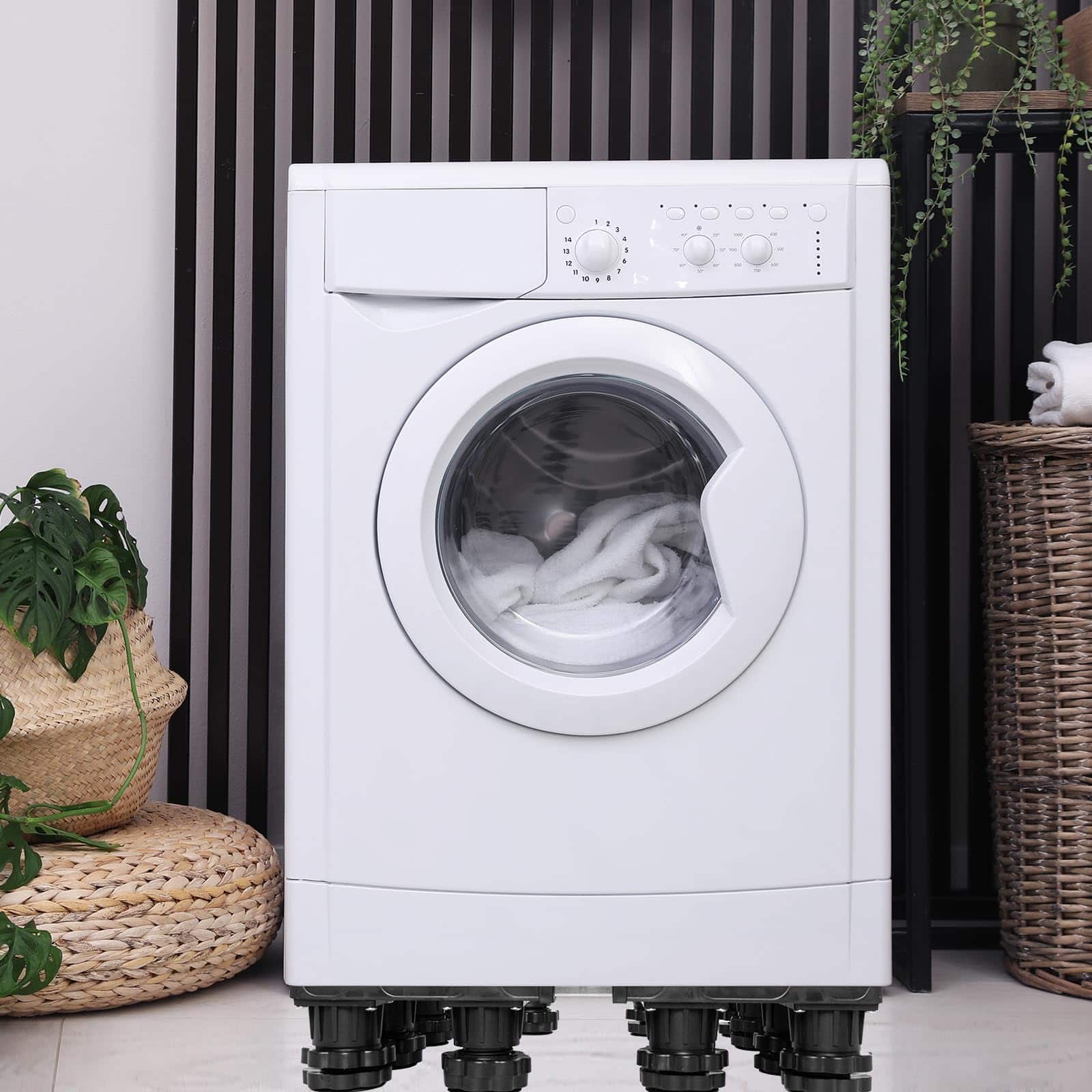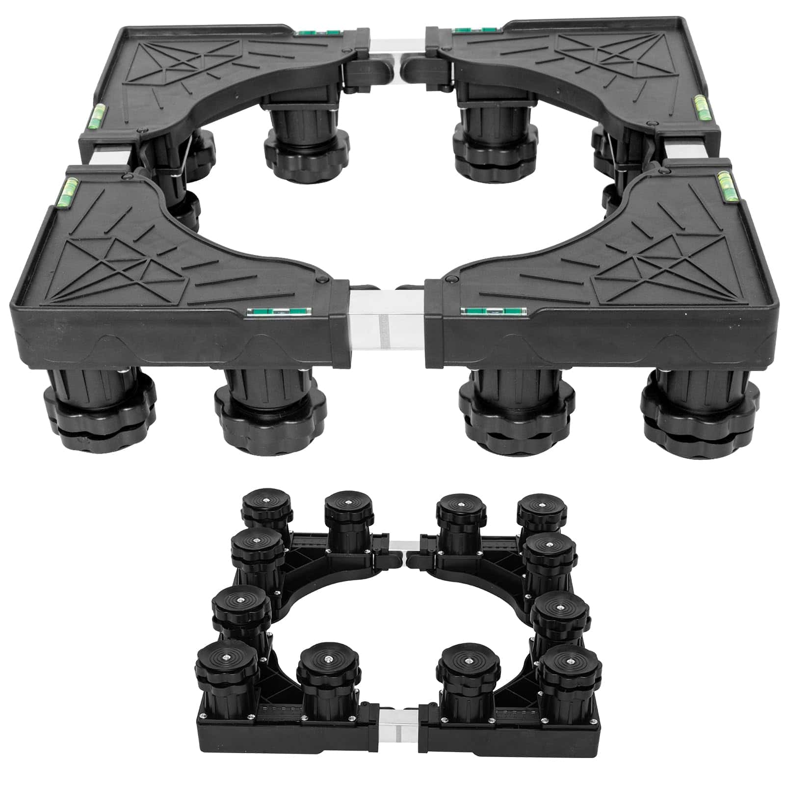 Base de Soporte Ajustable para Refrigerador con 12 Pies Resistentes. Nuestro pedestal para lavadora cuenta con una construcción resistente con una combinación de PVC y acero inoxidable, manejando una capacidad de peso de hasta 400 lbs, asegurando estabilidad y soporte para electrodomésticos pesados como lavadoras, secadoras, refrigeradores, aires acondicionados, congeladores de vino y muebles. Con dimensiones ajustables que van desde 15.7 a 25.5 pulgadas, este soporte elevador para lavadoras se adapta a una amplia gama de electrodomésticos y muebles, convirtiéndolo en una solución versátil para cualquier disposición en el hogar. Los 4 pies de acero inoxidable de la base del soporte son ajustables de 3.9 a 5.1 pulgadas. Este pedestal eleva sus electrodomésticos para un acceso más fácil, minimiza la acumulación de agua y facilita la limpieza, ideal para usar en la lavandería, baño, cocina y sala de estar. Nuestro soporte para refrigerador de ajuste universal cuenta con mats absorbentes de impacto para minimizar eficazmente la vibración de la lavadora o secadora. Los pies están envueltos en material de alta resistencia, reduciendo el ruido y protegiendo el piso y la alfombra. El montaje del pedestal es sin herramientas, con un diseño fácil de usar que no requiere herramientas. El paquete incluye 4 pies fuertes (sin ruedas), 4 varillas de conexión de acero inoxidable, 4 pads antivibración, 4 piezas de esquina de PVC resistente y un manual de instrucciones detallado.