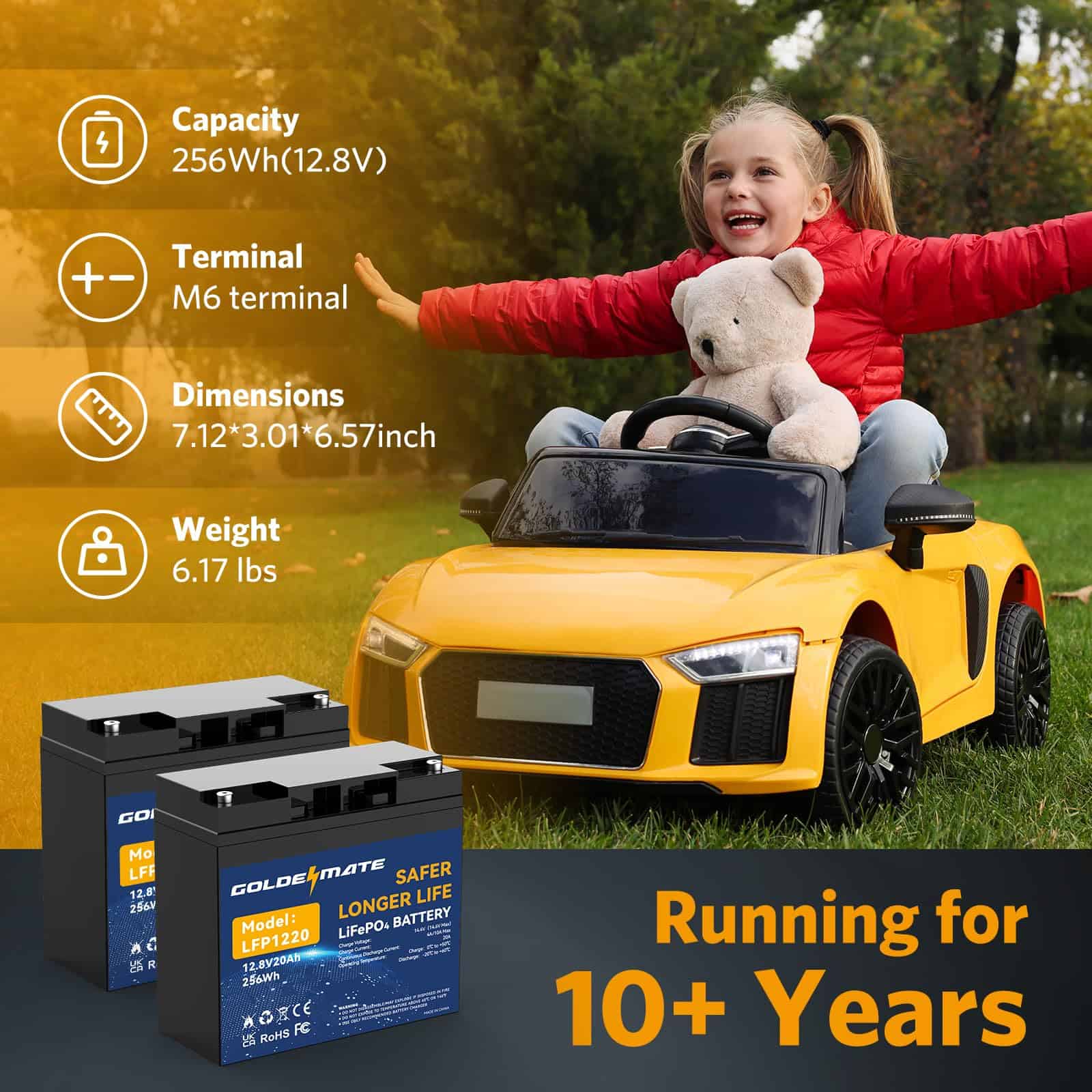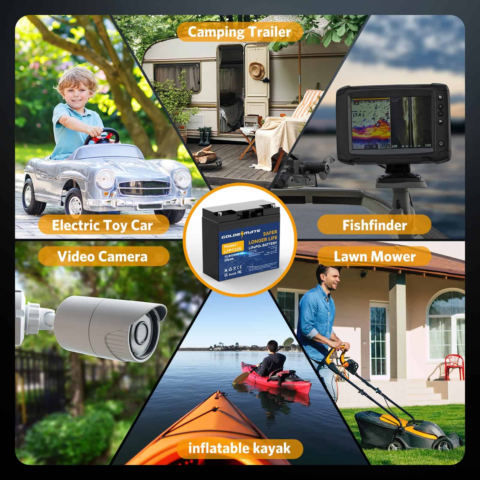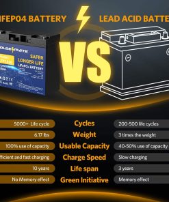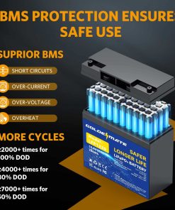 Esta batería de ciclo profundo LiFePO4 de GOLDENMATE de 12V es la opción ideal para una amplia gama de aplicaciones tanto en interiores como en exteriores. Con un rendimiento superior y una vida útil excepcional de hasta 10 años, esta batería es perfecta para el suministro de energía en campamentos al aire libre, instalaciones de UPS, sistemas de seguridad doméstica, energía de respaldo, sistemas de energía solar y eólica, y mucho más. Equipada con protección BMS para evitar sobrecargas, sobredescargas, sobre corrientes, calentamiento excesivo y cortocircuitos, esta batería ofrece una gran seguridad y fiabilidad. Además, con un peso increíblemente ligero de solo 5.3 libras, es fácil de transportar y utilizar en una amplia variedad de dispositivos y aplicaciones. Aprovecha la versatilidad y eficiencia de la batería LiFePO4 GOLDENMATE de 12V para alimentar tus dispositivos con energía limpia y confiable.